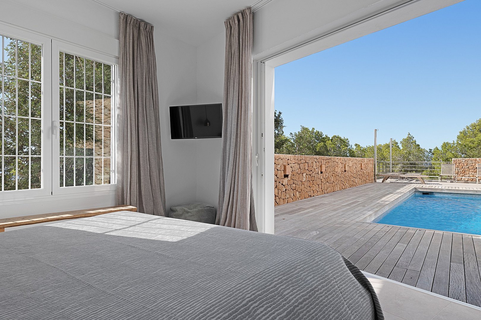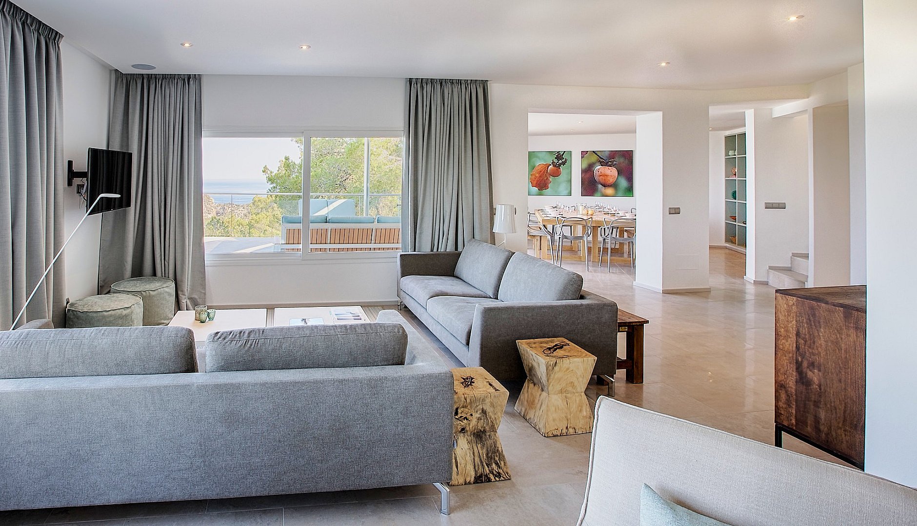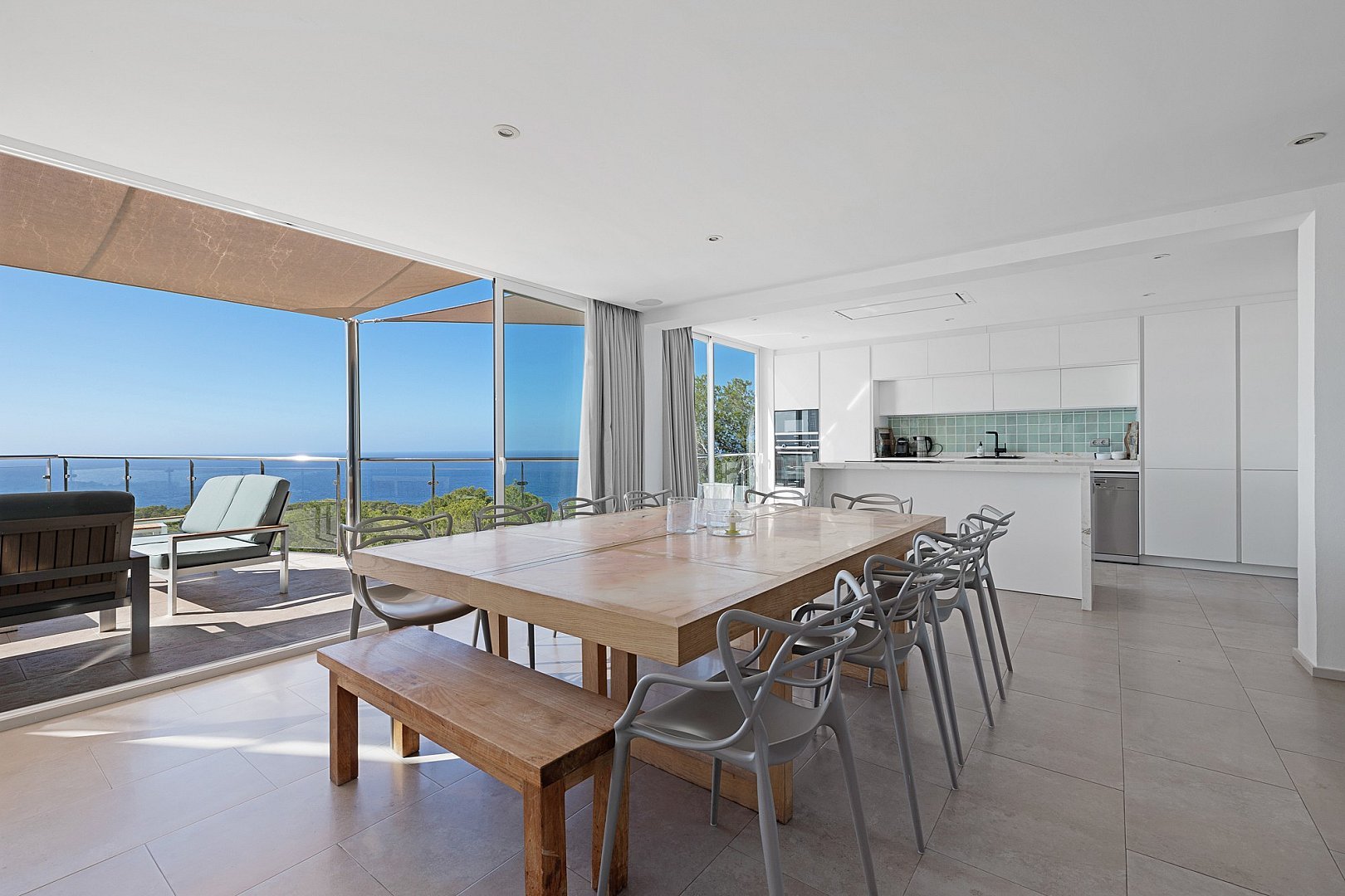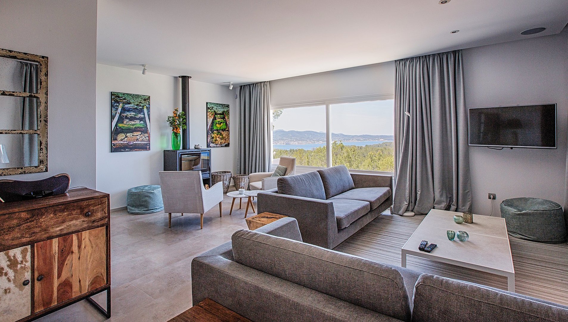 The modern villa is located on the top of a hill and offers breathtaking sea views from almost all rooms, which impress you as soon as you enter. On the entrance level is the spacious open-plan living room, which is fitted with sliding windows that implement indoor/outdoor living and an open-plan kitchen. The terrace in front of the house offers a marvellous view of the sea and the offshore islands. A staircase leads up to the roof terrace with chill-out area, where you can enjoy the sunsets over the sea. The villa has a total of six bedrooms with en-suite bathrooms, all of which are generously proportioned and have ample wardrobe space. On the guest level there is a beautiful terrace, a pool and a covered outdoor kitchen, which invites you to socialise. A staircase leads to a maid's room and the garage. The property has a rental licence for six bedrooms and there is the possibility to take over the existing client base.