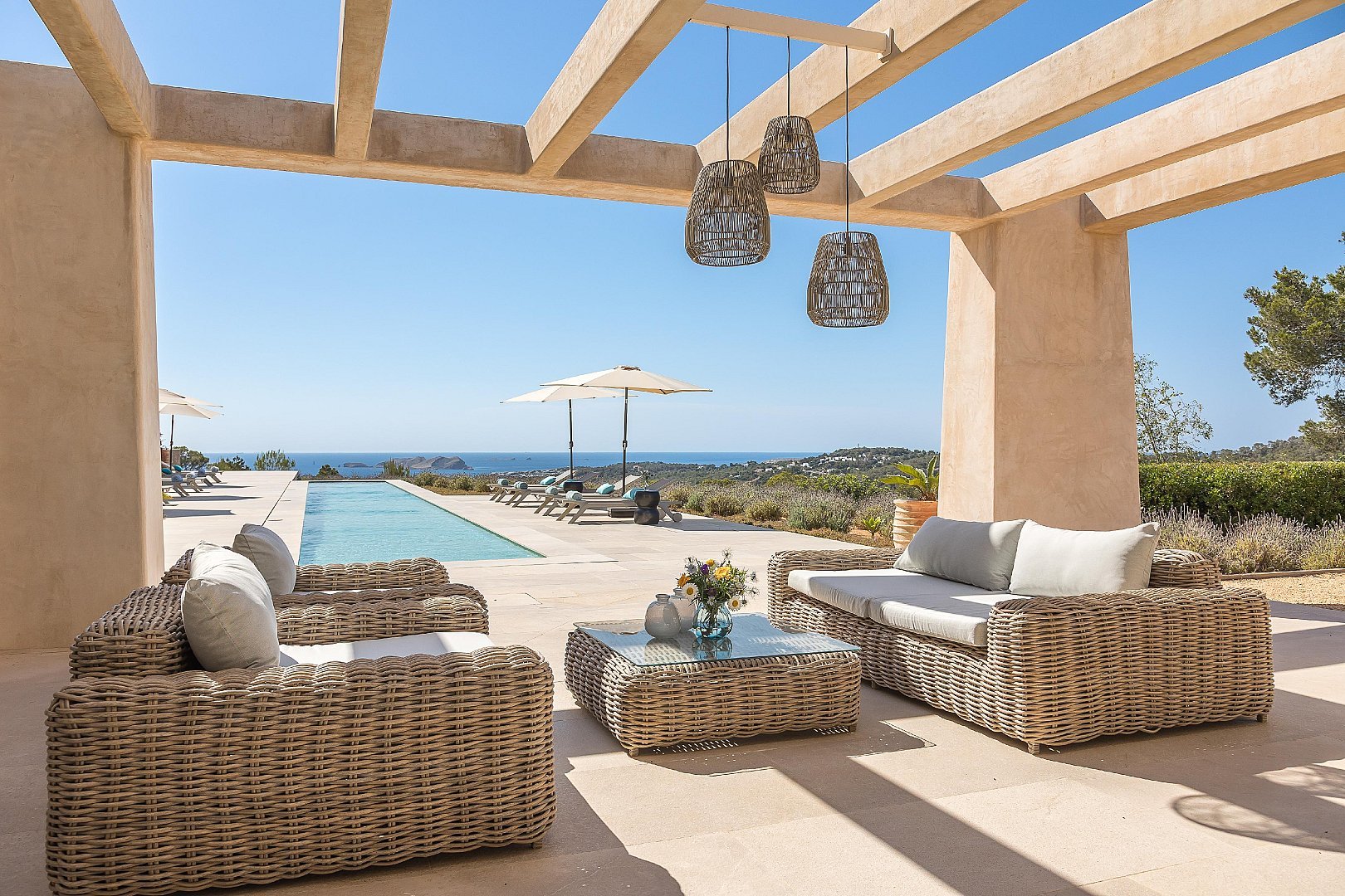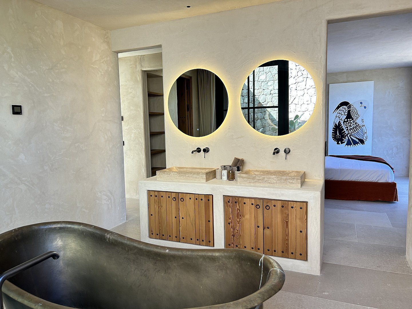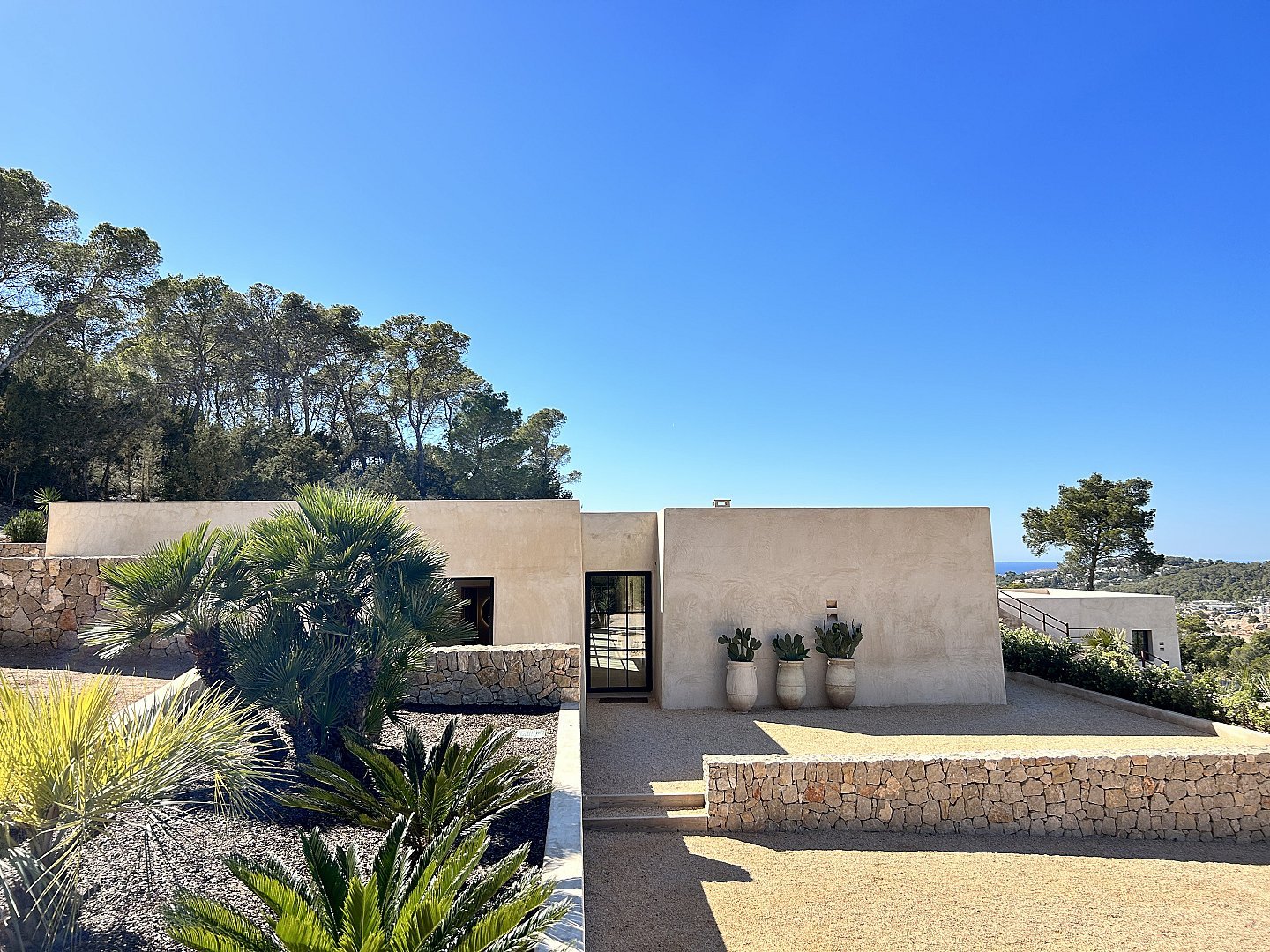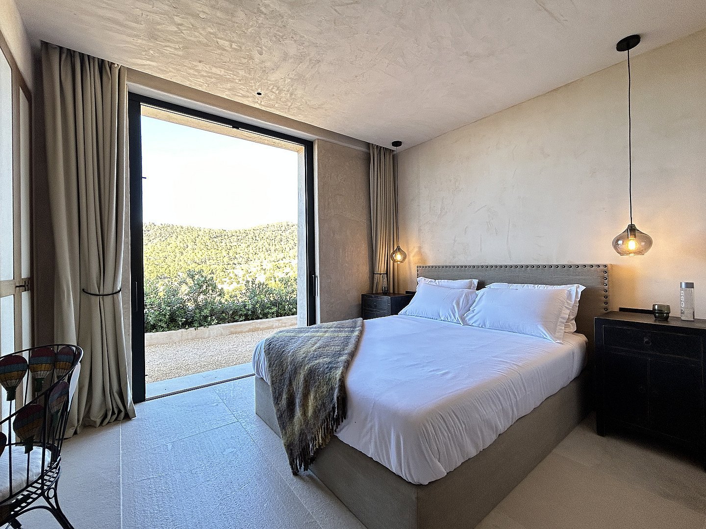 This exclusive property impresses with its unique location, its Mediterranean yet modern style, and its spaciousness, coupled with absolute privacy. The magnificent property, which extends over one floor, is situated on a large plot in one of the areas of Ibiza where you can see the sunset in the sea almost all year round. Through the large entrance you enter the house and a spacious living room with large fireplace, a spacious dining room with a semi-open kitchen with panoramic views of the sea and nature. A large pool framed by a terrace makes this place spectacular. The main living area is complemented by a large master bedroom with en suite bathroom and a dressing room. In addition, there are four further bedrooms, all with en suite bathrooms and stunning views. A further en suite bedroom, ideal for guests, is accessed from the garden. The spacious plot still offers many development possibilities. A large outdoor area invites you to enjoy this magical place on summer evenings. The basement can be developed according to the individual wishes of the new owner. It offers enough space for a gym, spa and or cinema room.