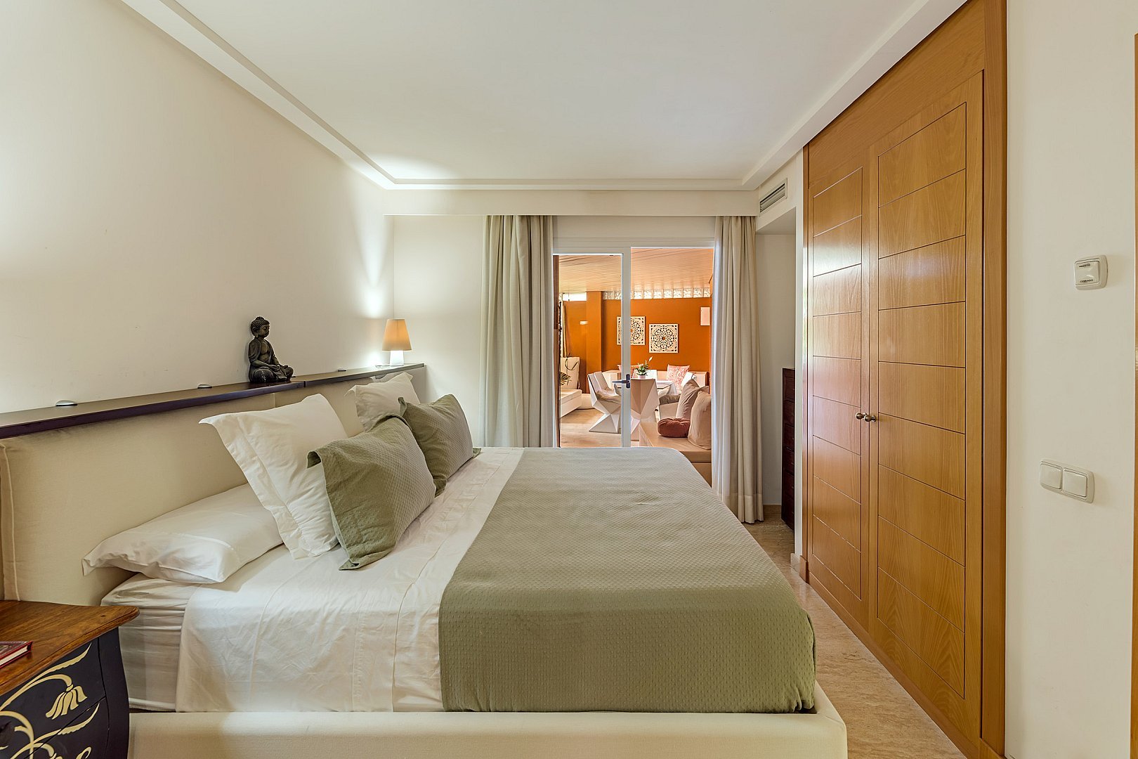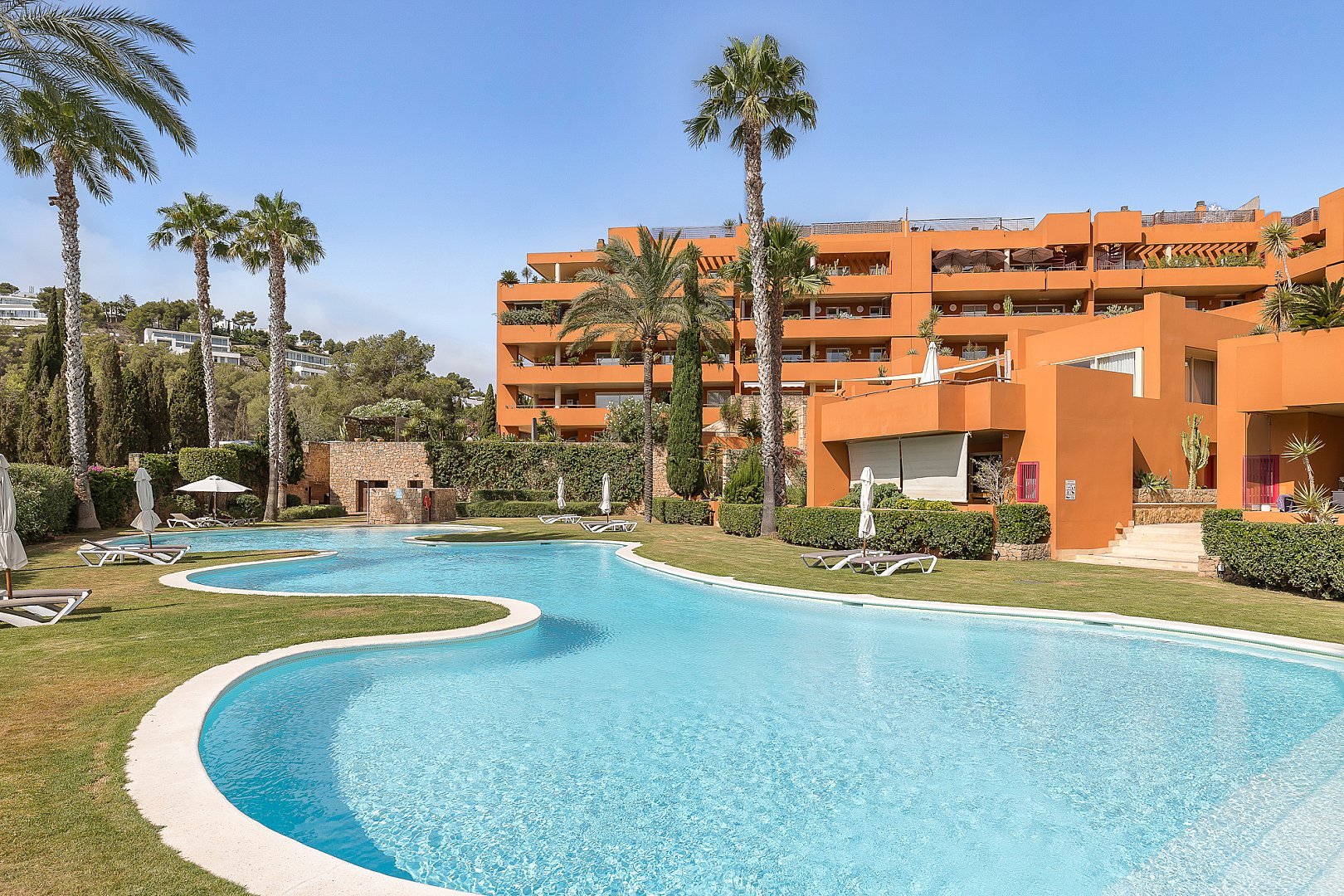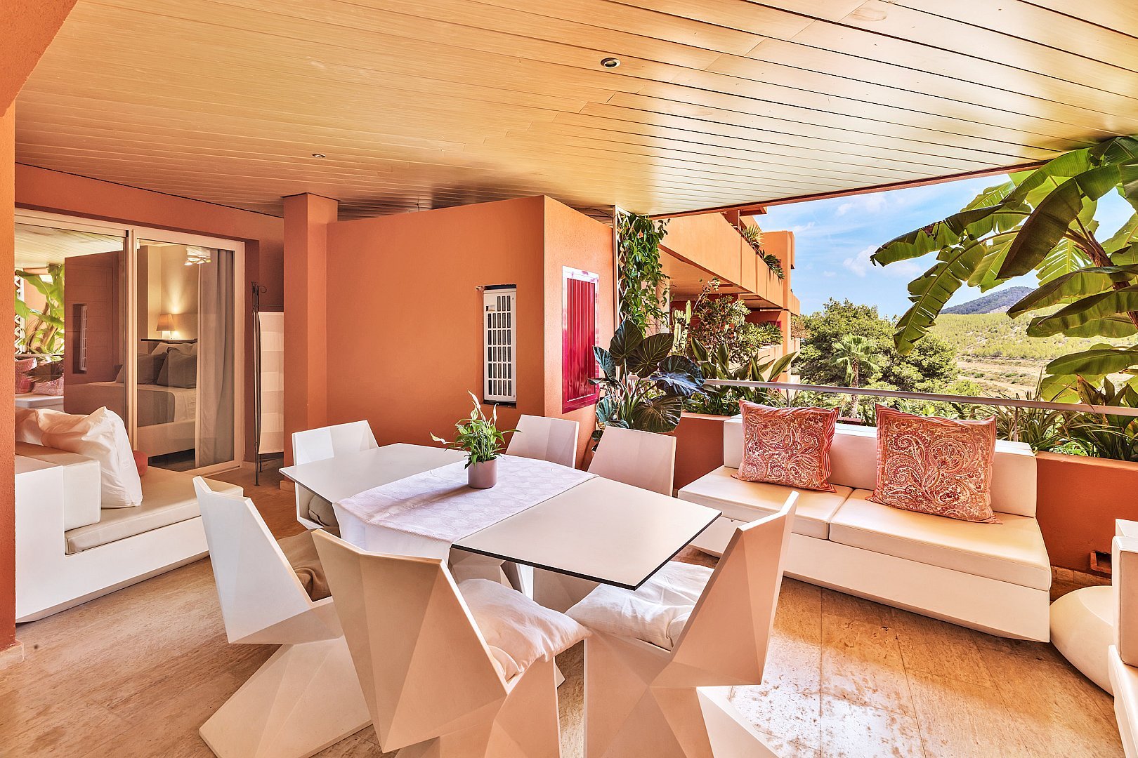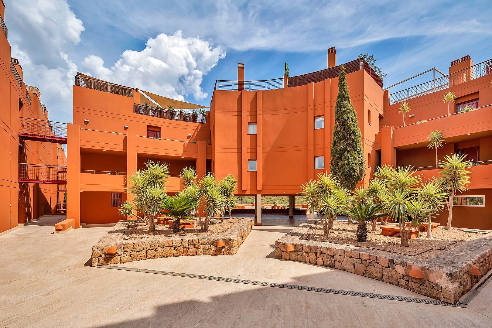 This bright and welcoming apartment is situated in the exclusive gated community of Roca Llisa, directly adjacent to Ibiza’s only golf course. Surrounded by lush greenery and offering full privacy, it is ideal as a year-round residence or a serene holiday retreat. The property offers three comfortable bedrooms, two full bathrooms, and an open-plan living and kitchen area that flows onto a charming terrace with views into the surrounding nature. The terrace provides a private and peaceful space to relax and unwind. A particular highlight is the generous parking area and a separate storage room – a rare convenience in Ibiza. Residents of the complex benefit from a beautifully maintained communal pool, a small fitness room, and the security of living in one of the island’s most sought-after communities. With its practical layout, natural surroundings, and secure setting, this apartment presents an excellent opportunity for those seeking the Ibiza lifestyle in comfort and tranquility.