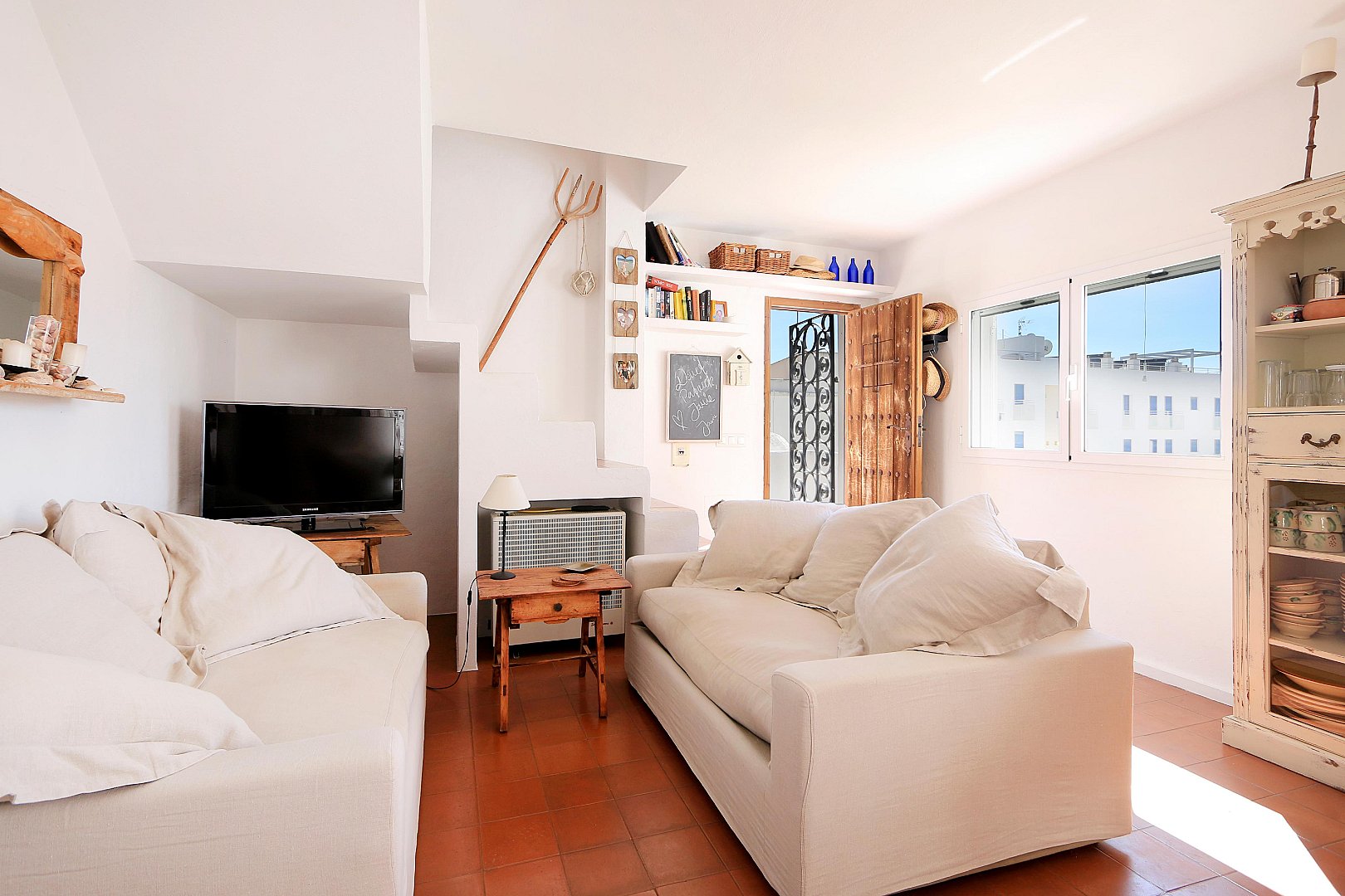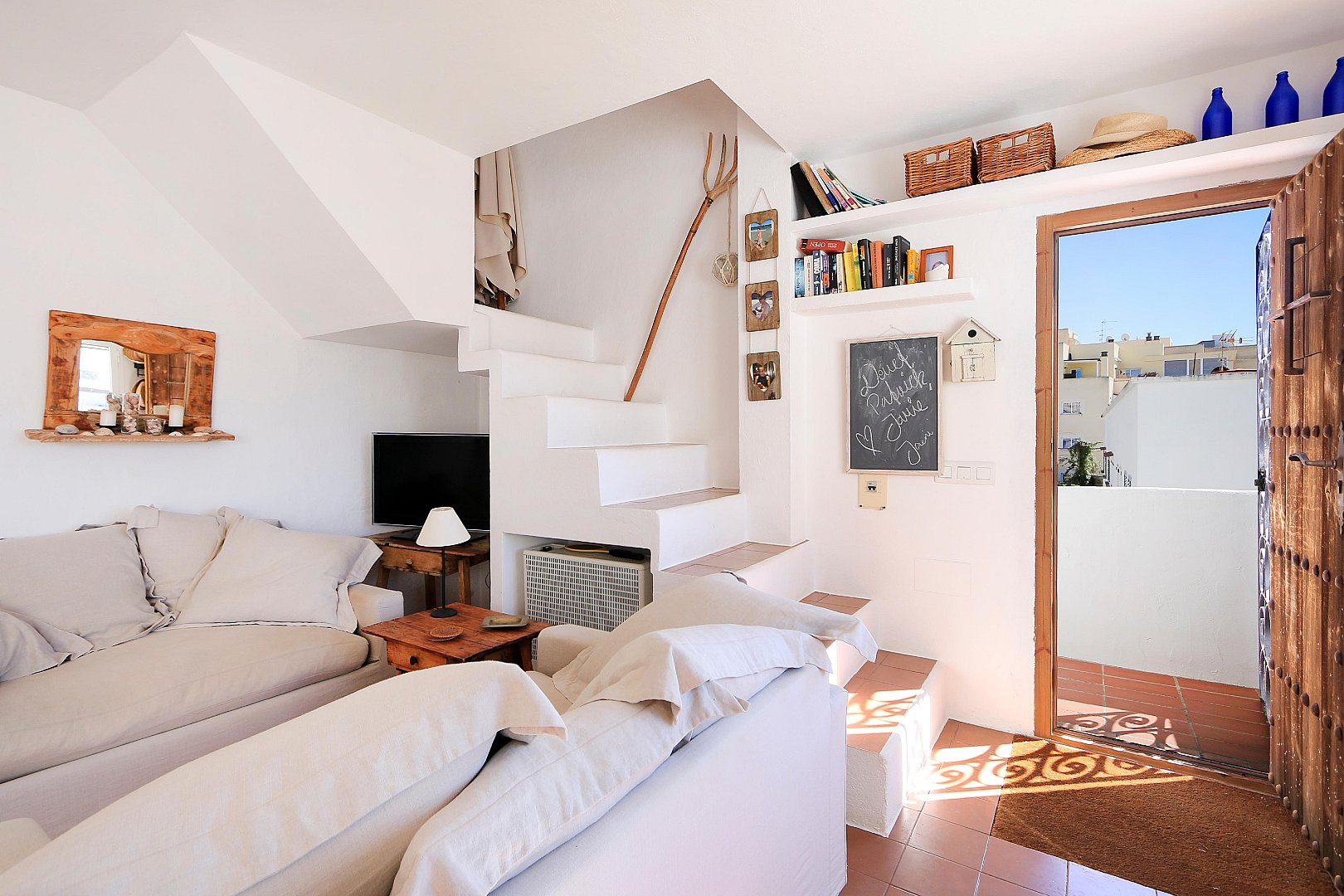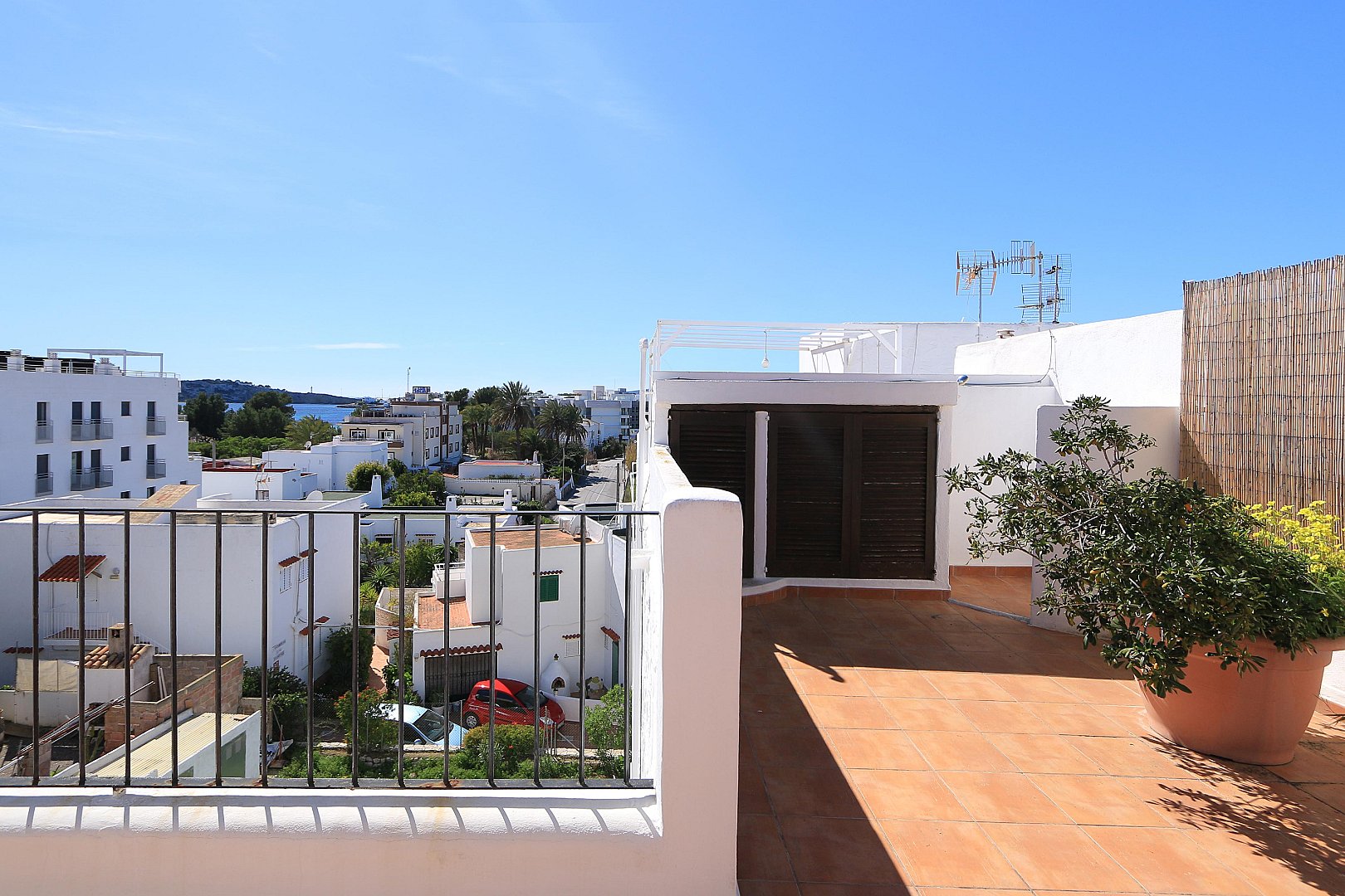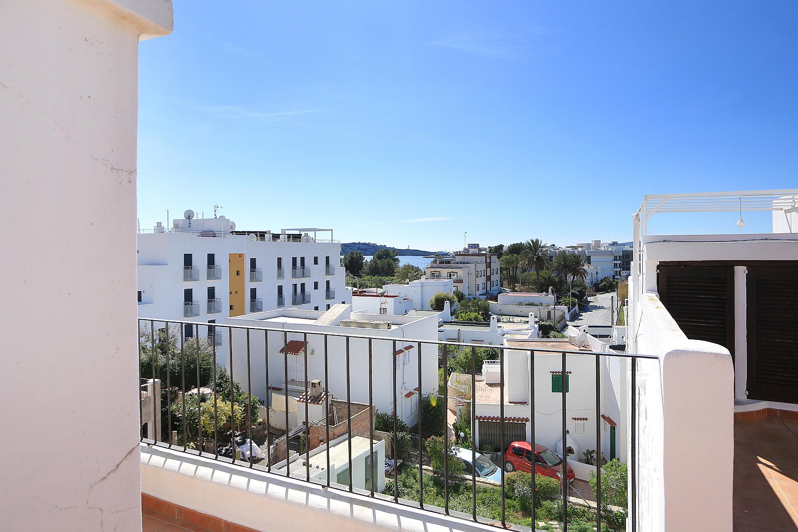 This cozy penthouse is located just a few steps from Talamanca Beach, in a quiet, low-traffic residential area that offers both privacy and a relaxed Mediterranean atmosphere. The location combines tranquility with convenience, as the beach, local restaurants, and the vibrant marina area can all be reached within a short walk. The home stands out for its brightness and its pleasant Mediterranean style, creating a warm and inviting living environment. The main living area features an open-plan layout with a modern kitchen that seamlessly connects to the living room. Thanks to its southwest orientation, the space is filled with natural light for much of the day, especially in the afternoon and evening. From the living room, there is direct access to a balcony, which provides a comfortable spot to enjoy the fresh air and the mild climate. On this level, the property offers two well-proportioned bedrooms, a full bathroom, and an additional guest toilet, making it ideal for both residents and visitors. The layout is practical and comfortable, ensuring privacy and functionality. The upper floor, which is accessed via an internal staircase, features another bedroom that can also be used as a guest room, office, or flexible living space. From here, you reach the spacious rooftop terrace, a true highlight of the property. The terrace includes a chill-out area designed for relaxing or entertaining, and it is equipped with an outdoor shower—perfect for cooling off on warm summer days. From this elevated position, you can enjoy lovely open views of Dalt Vila and the sea, creating a particularly special atmosphere both during the day and at sunset. The property also includes a private parking space, which is a valuable feature in this sought-after area and adds extra convenience to everyday living.
