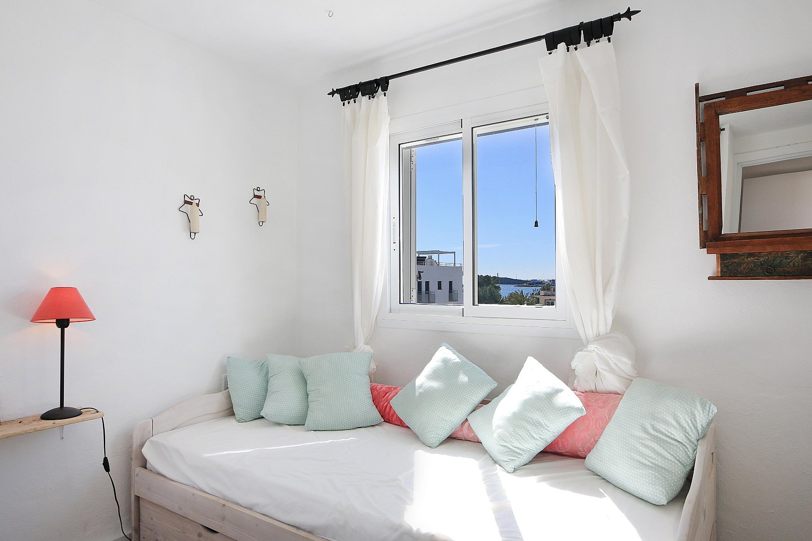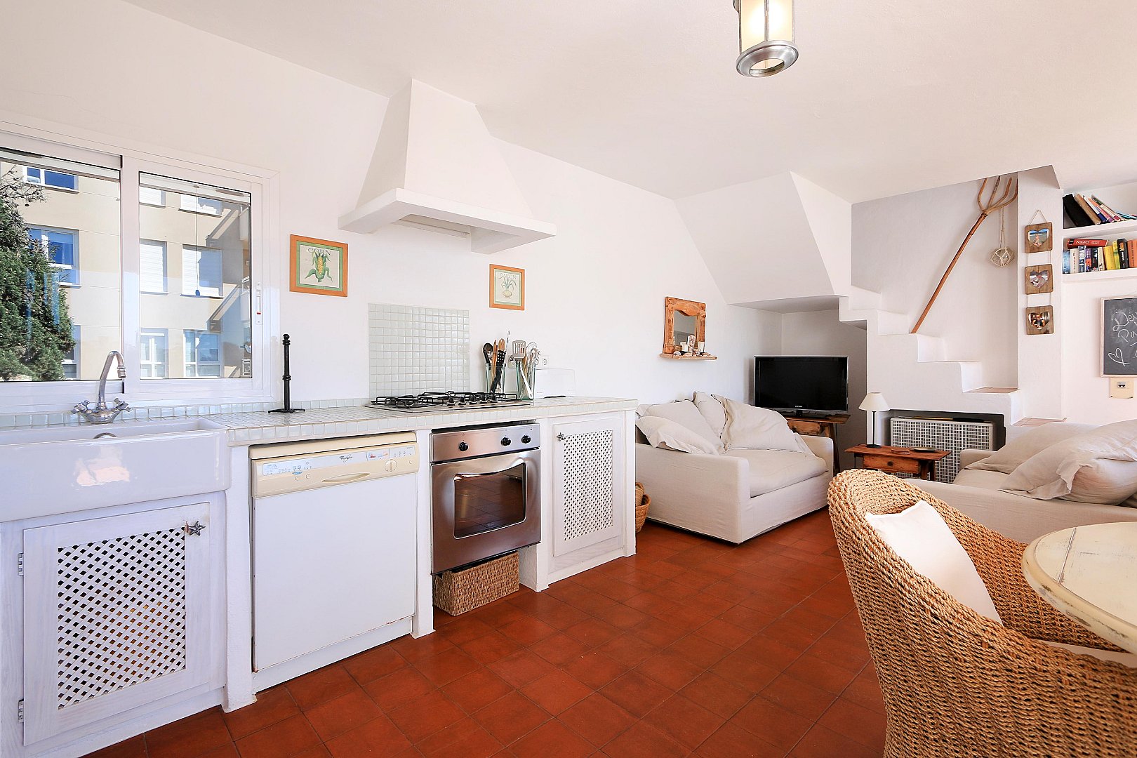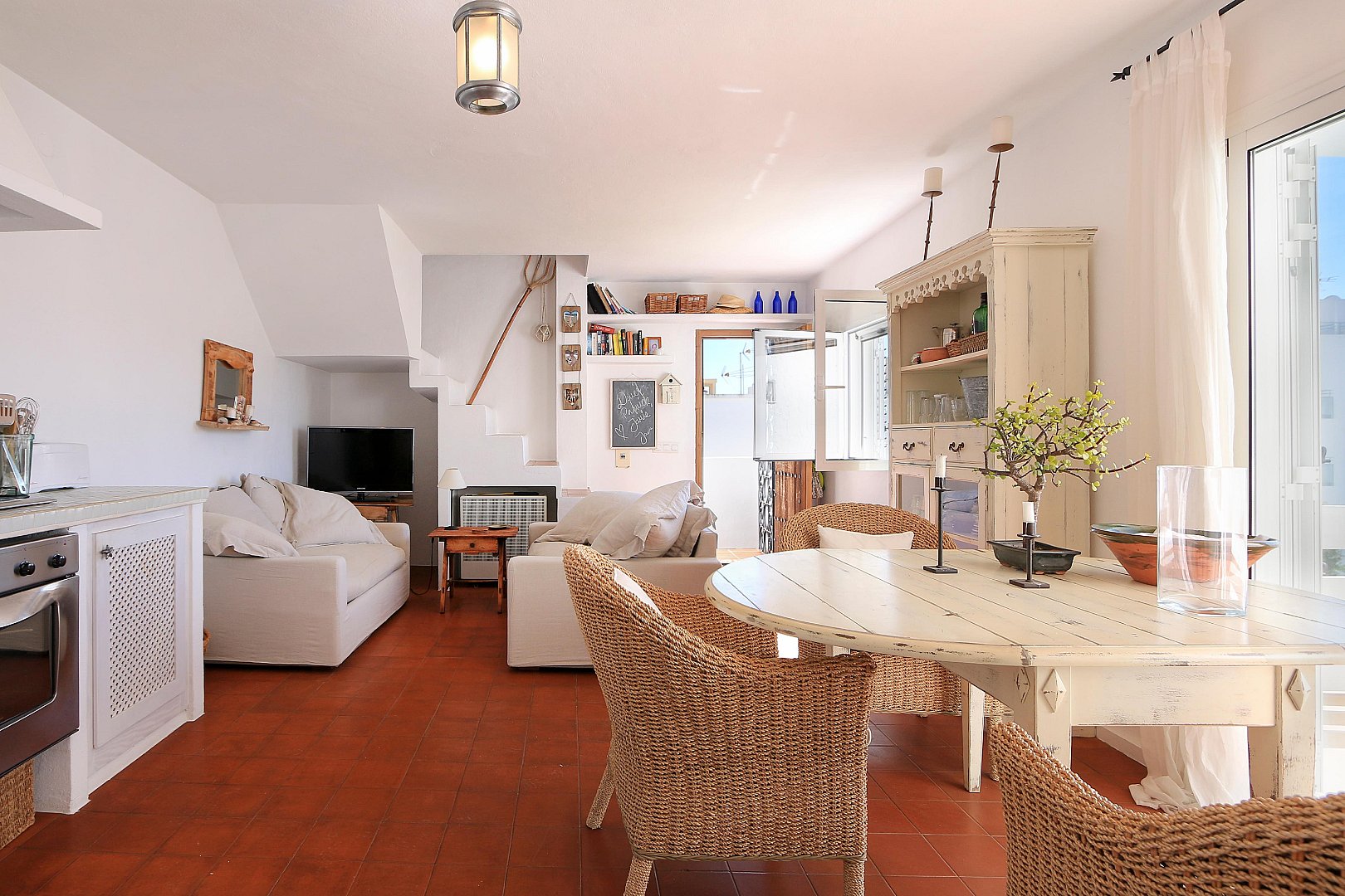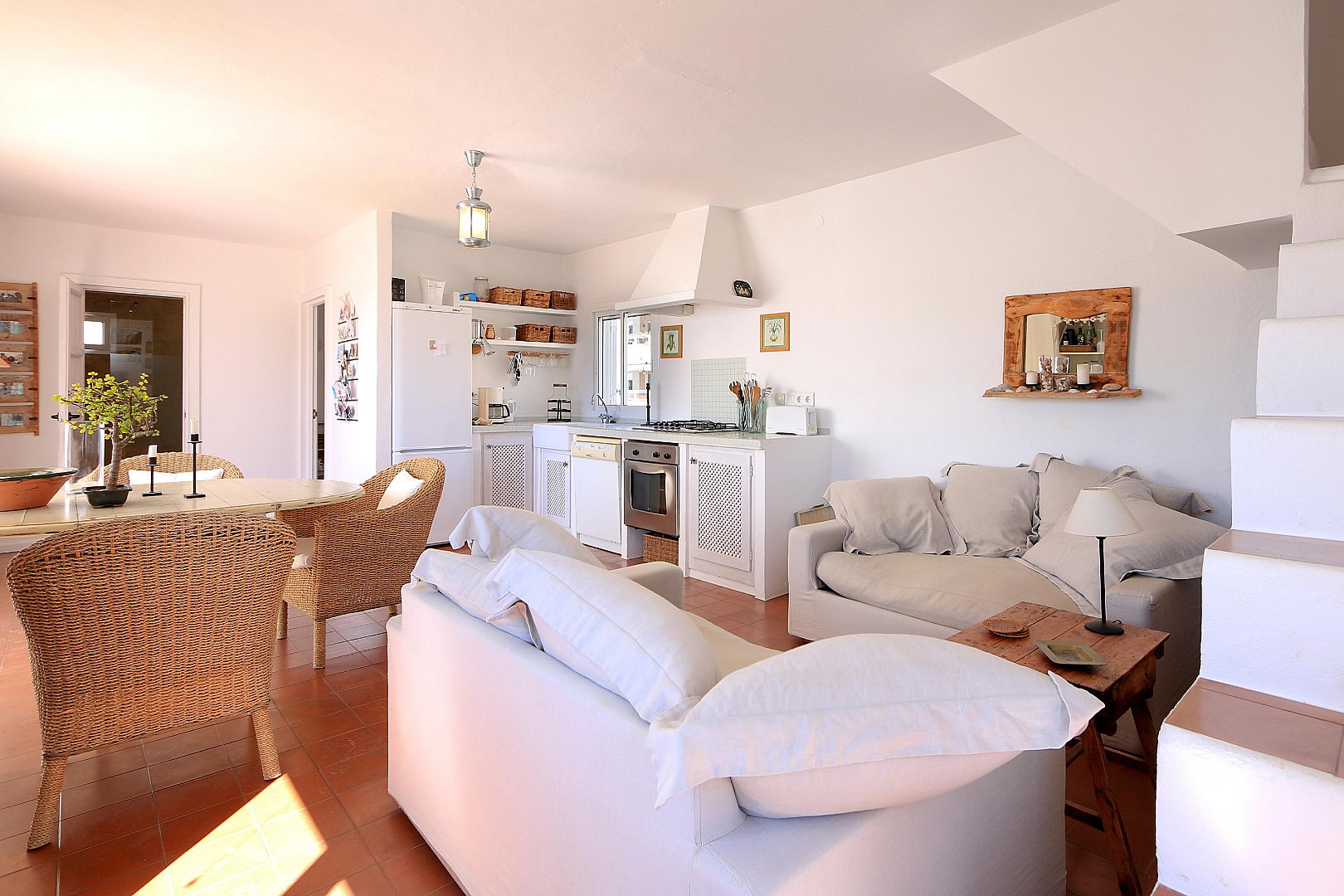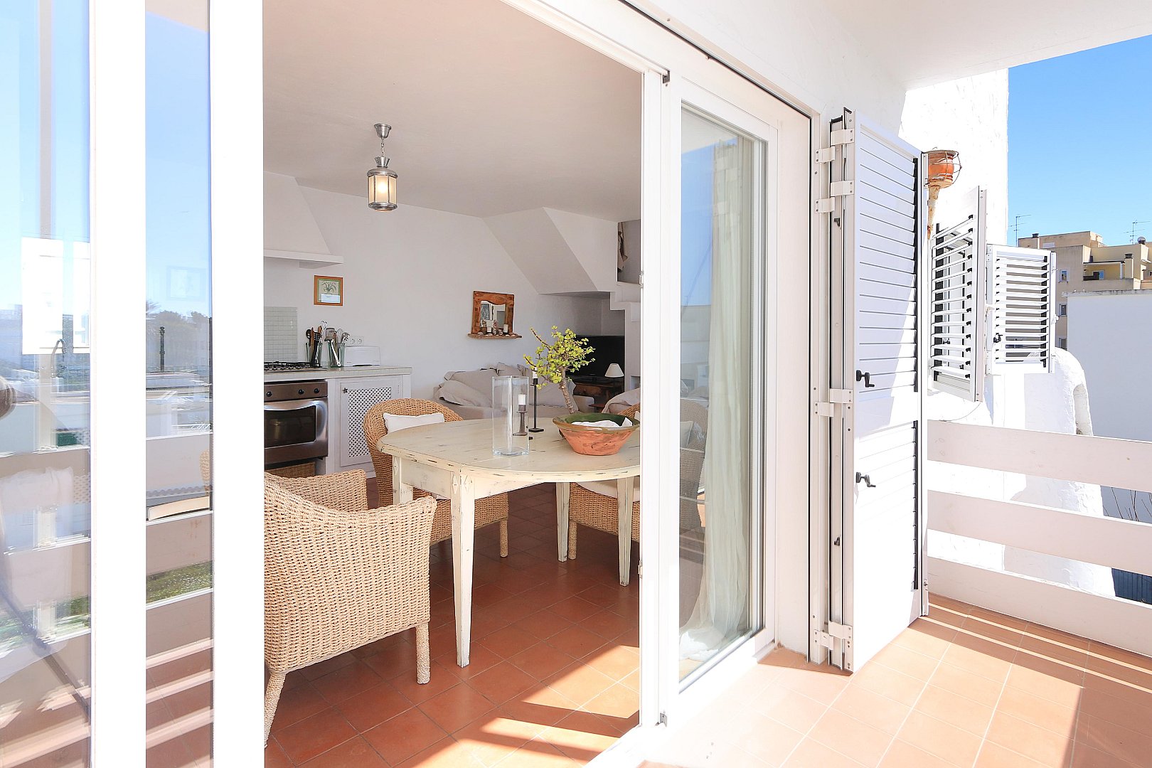 This cozy penthouse is located just a few steps from Talamanca Beach, in a quiet, low-traffic residential area that offers both privacy and a relaxed Mediterranean atmosphere. The location combines tranquility with convenience, as the beach, local restaurants, and the vibrant marina area can all be reached within a short walk. The home stands out for its brightness and its pleasant Mediterranean style, creating a warm and inviting living environment. The main living area features an open-plan layout with a modern kitchen that seamlessly connects to the living room. Thanks to its southwest orientation, the space is filled with natural light for much of the day, especially in the afternoon and evening. From the living room, there is direct access to a balcony, which provides a comfortable spot to enjoy the fresh air and the mild climate. On this level, the property offers two well-proportioned bedrooms, a full bathroom, and an additional guest toilet, making it ideal for both residents and visitors. The layout is practical and comfortable, ensuring privacy and functionality. The upper floor, which is accessed via an internal staircase, features another bedroom that can also be used as a guest room, office, or flexible living space. From here, you reach the spacious rooftop terrace, a true highlight of the property. The terrace includes a chill-out area designed for relaxing or entertaining, and it is equipped with an outdoor shower—perfect for cooling off on warm summer days. From this elevated position, you can enjoy lovely open views of Dalt Vila and the sea, creating a particularly special atmosphere both during the day and at sunset. The property also includes a private parking space, which is a valuable feature in this sought-after area and adds extra convenience to everyday living.