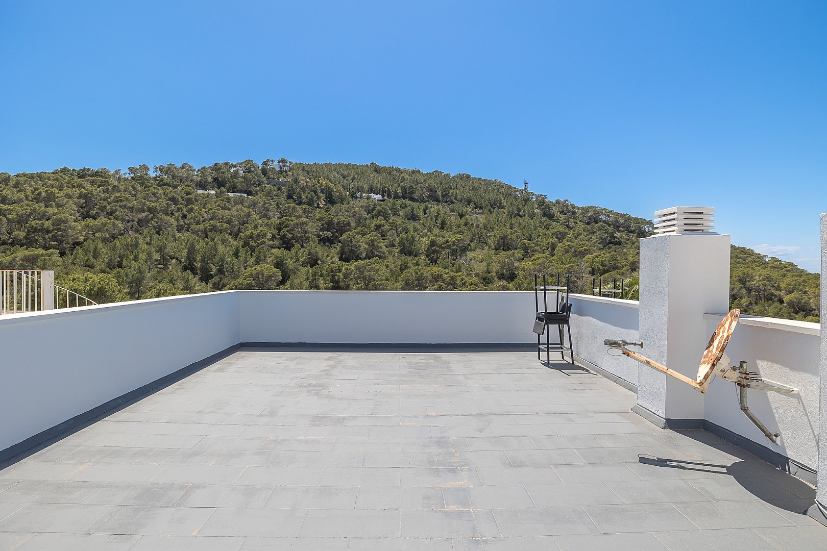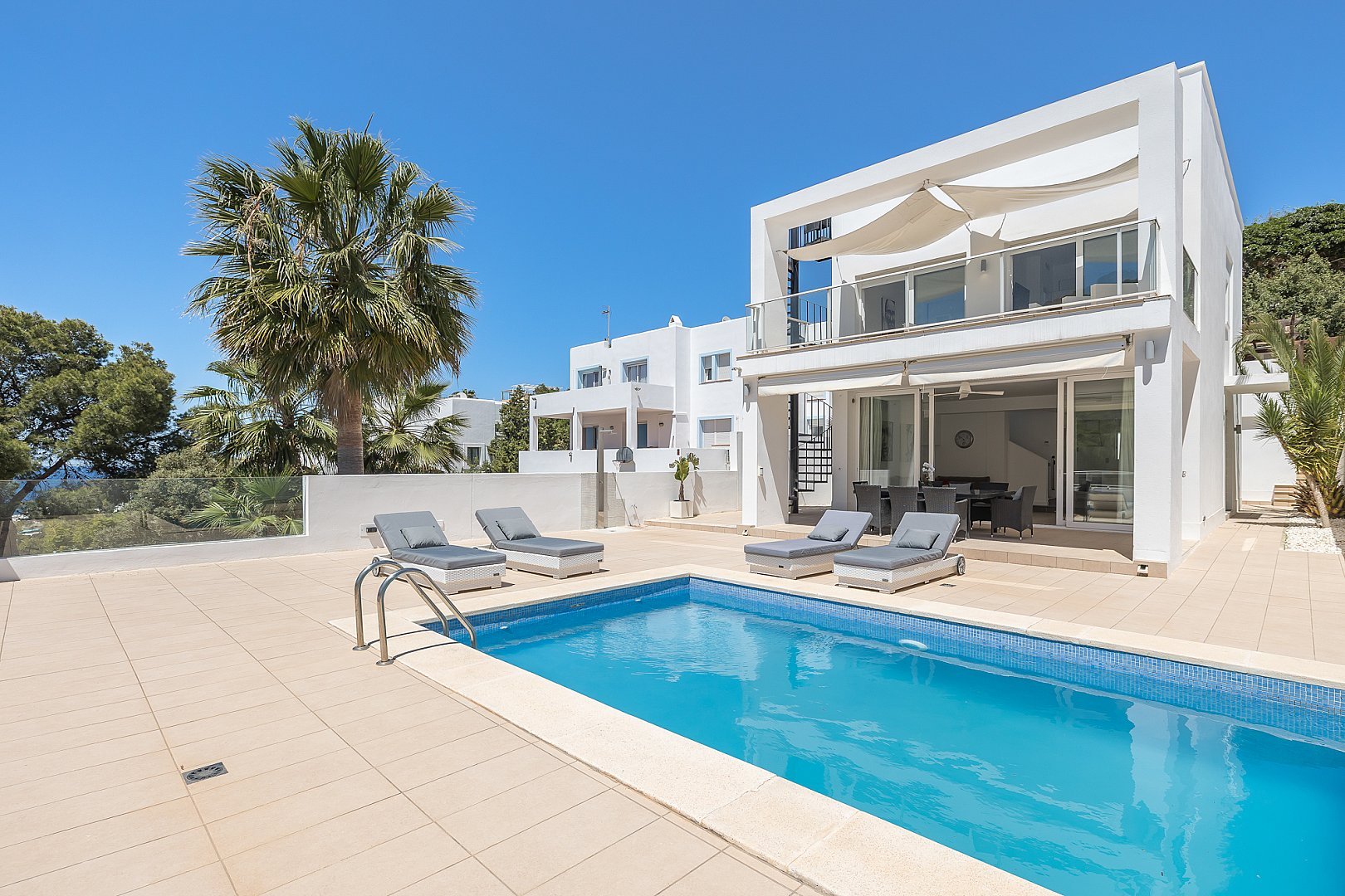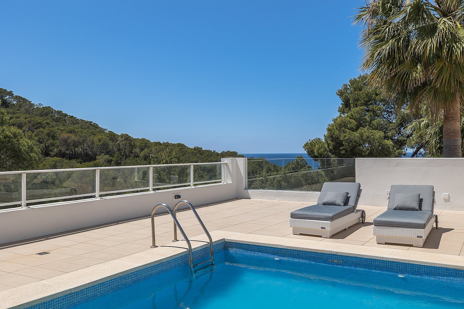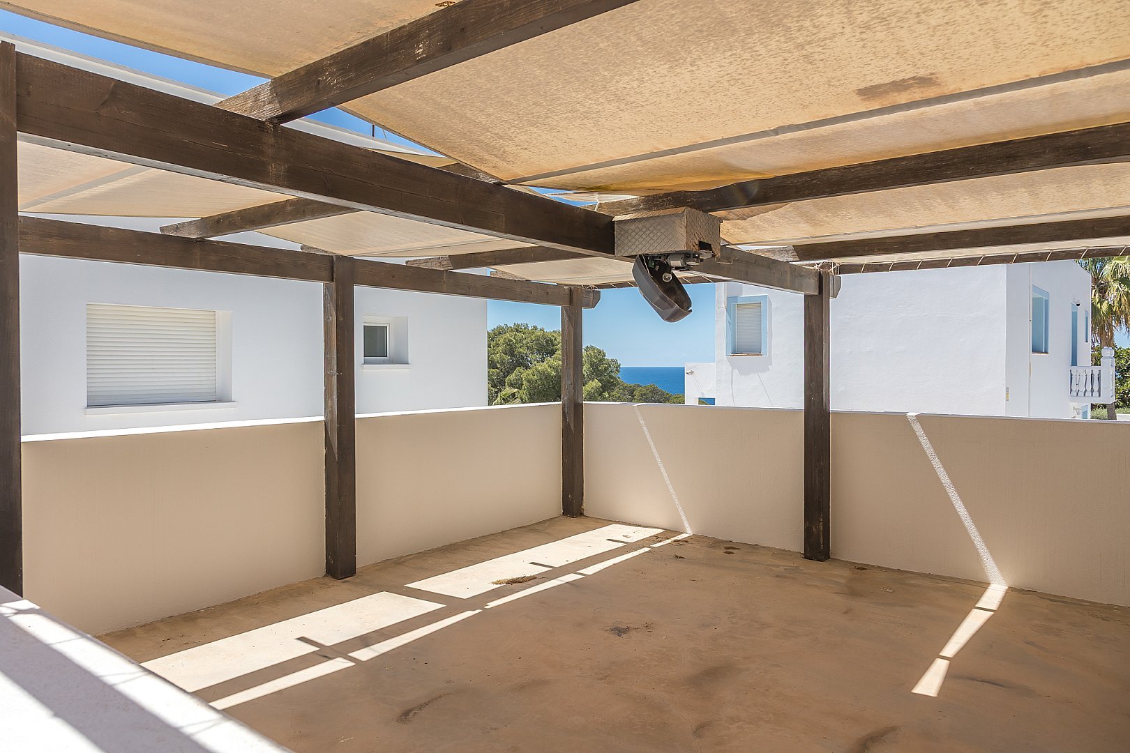 This recently renovated two-storey detached villa is quietly nestled near the beautiful Cala Vadella, offering peace, privacy, and convenience. Designed with space and light, the home features a generous living-dining area and a fully equipped kitchen on the ground floor, flowing out to a sun-soaked terrace and a private pool—perfect for relaxing or entertaining. From the terrace you have a wonderful unobstructed views to the green and as well to the sea. A few months in summer you can see the sunset in the sea. Upstairs, you’ll find three spacious bedrooms, two of which open onto a second terrace boasting stunning views of the lush surrounding landscape and the sea beyond. A separate storage room adds more inside space and two garage spaces are also belonging to the property.
