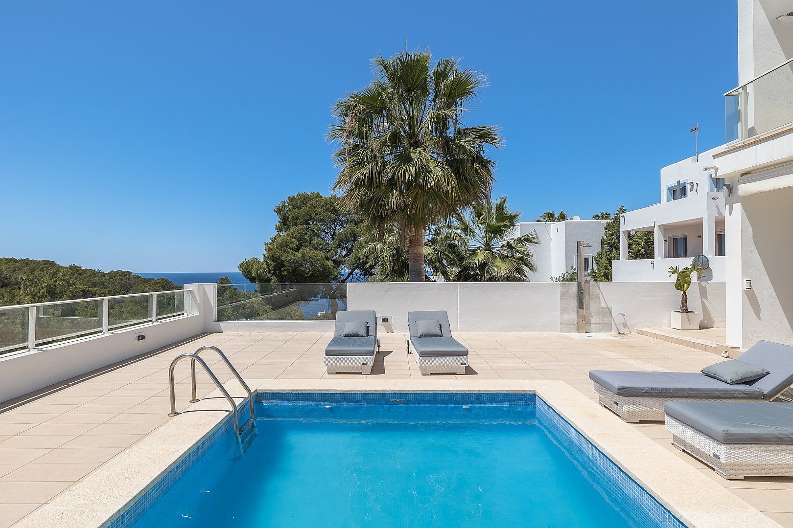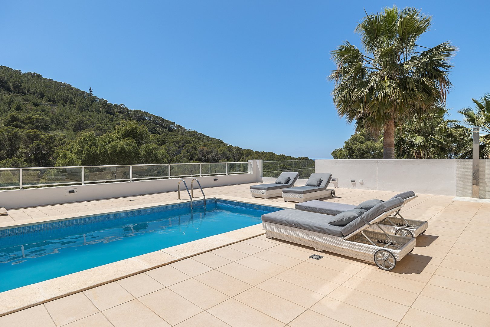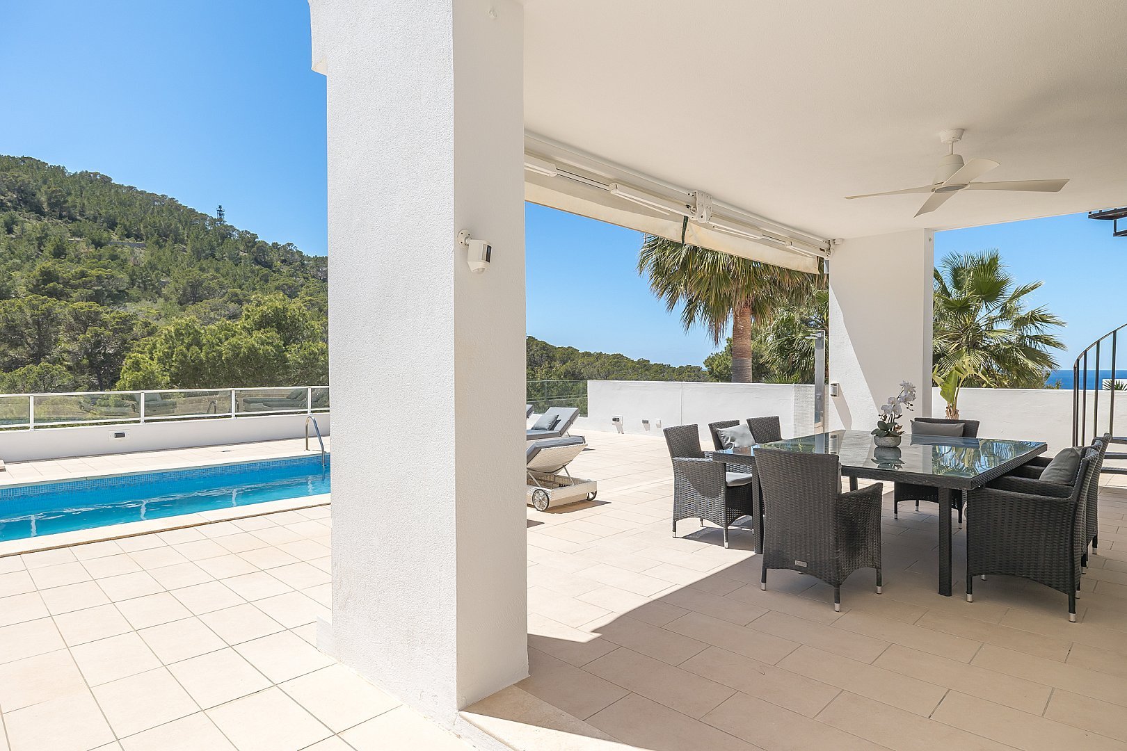 This recently renovated two-storey detached villa is quietly nestled near the beautiful Cala Vadella, offering peace, privacy, and convenience. Designed with space and light, the home features a generous living-dining area and a fully equipped kitchen on the ground floor, flowing out to a sun-soaked terrace and a private pool—perfect for relaxing or entertaining. From the terrace you have a wonderful unobstructed views to the green and as well to the sea. A few months in summer you can see the sunset in the sea. Upstairs, you’ll find three spacious bedrooms, two of which open onto a second terrace boasting stunning views of the lush surrounding landscape and the sea beyond. A separate storage room adds more inside space and two garage spaces are also belonging to the property.