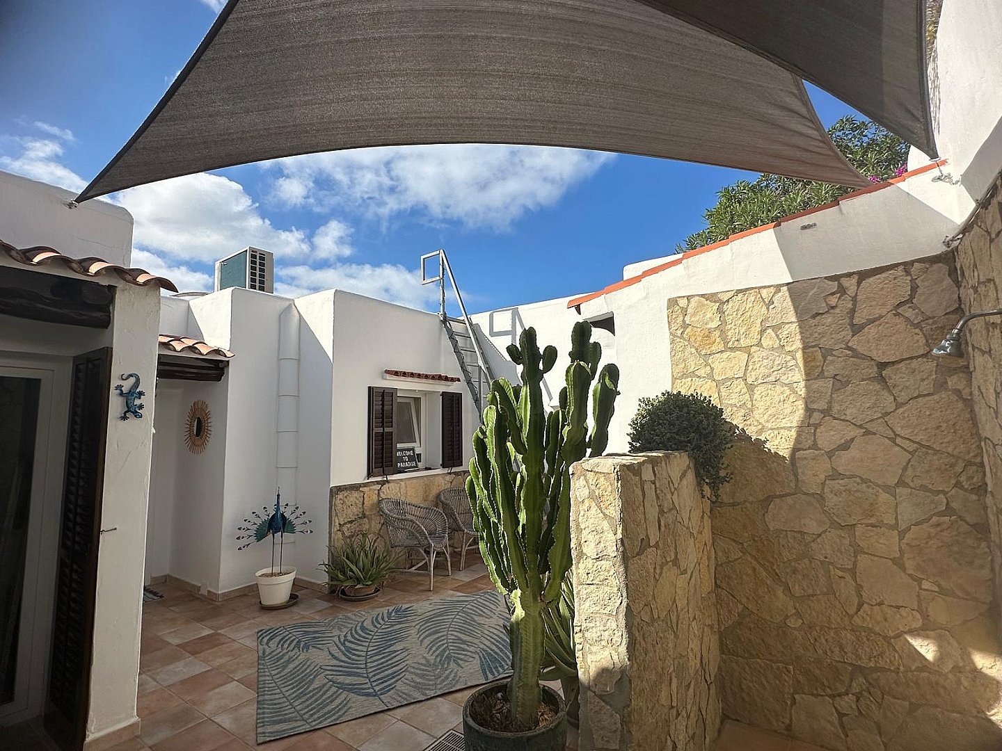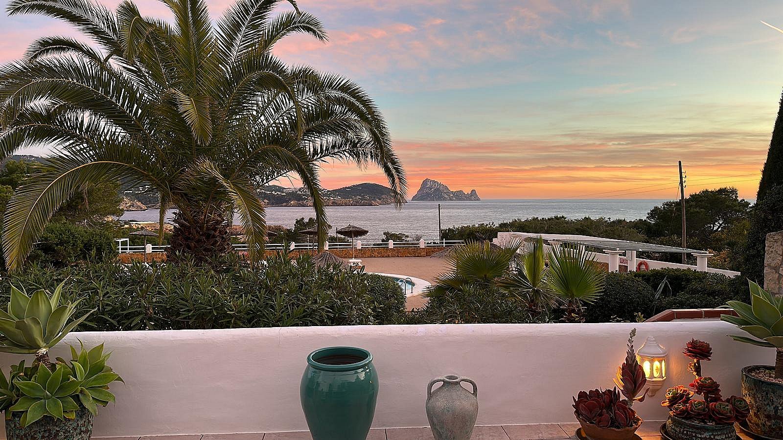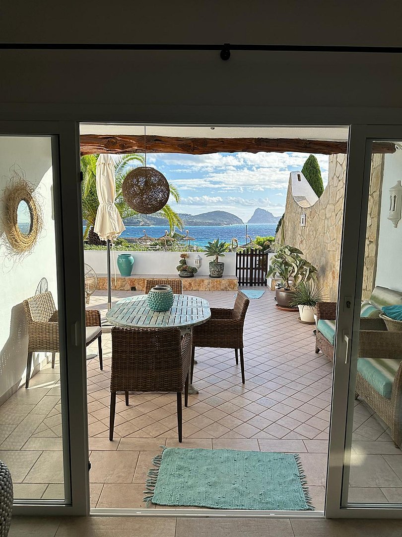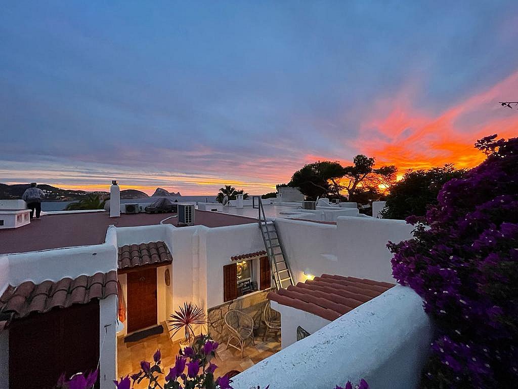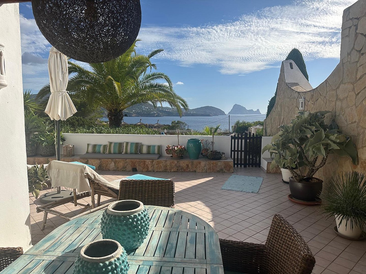 In the west of the island is this beautiful Ibizan house, located in a peaceful setting surrounded by nature. Situated right next to the small cove of Cala Codolar —one of the few original coves that Ibiza still retains— and just a few minutes' walk from Cala Conta, one of the most beautiful beaches on the island with its unforgettable sunsets. The property stands out for its special charm and its stunning panoramic views of the sea, Es Vedrà, and the bays stretching in front of it. The south-facing house offers the ideal space for a small family or a group of friends who wish to enjoy tranquility, nature, and the Mediterranean lifestyle in a privileged location. Its bright interiors, a large panoramic terrace, a charming patio, a walkable rooftop, and a well-maintained garden create a harmonious ensemble that invites relaxation and enjoyment. Among its features are a large sunny terrace with a natural stone wall and an outdoor fireplace, magnificent views of Es Vedrà, and direct access to the garden with palm trees. The house has two air-conditioned bedrooms, two modern bathrooms, and a cozy living room with a fireplace and open layout. In the patio, there are natural stone walls, an outdoor shower, a storage room, and a climate-controlled auxiliary room that can also be used as a third bedroom. From the rooftop, there is an impressive panoramic view of the sea and the natural surroundings. The property also includes a spacious garage. The house is situated in a privileged location within a large and well-maintained urbanization that offers two communal swimming pools. The house was completely renovated, is in excellent condition, and is ready to move into.