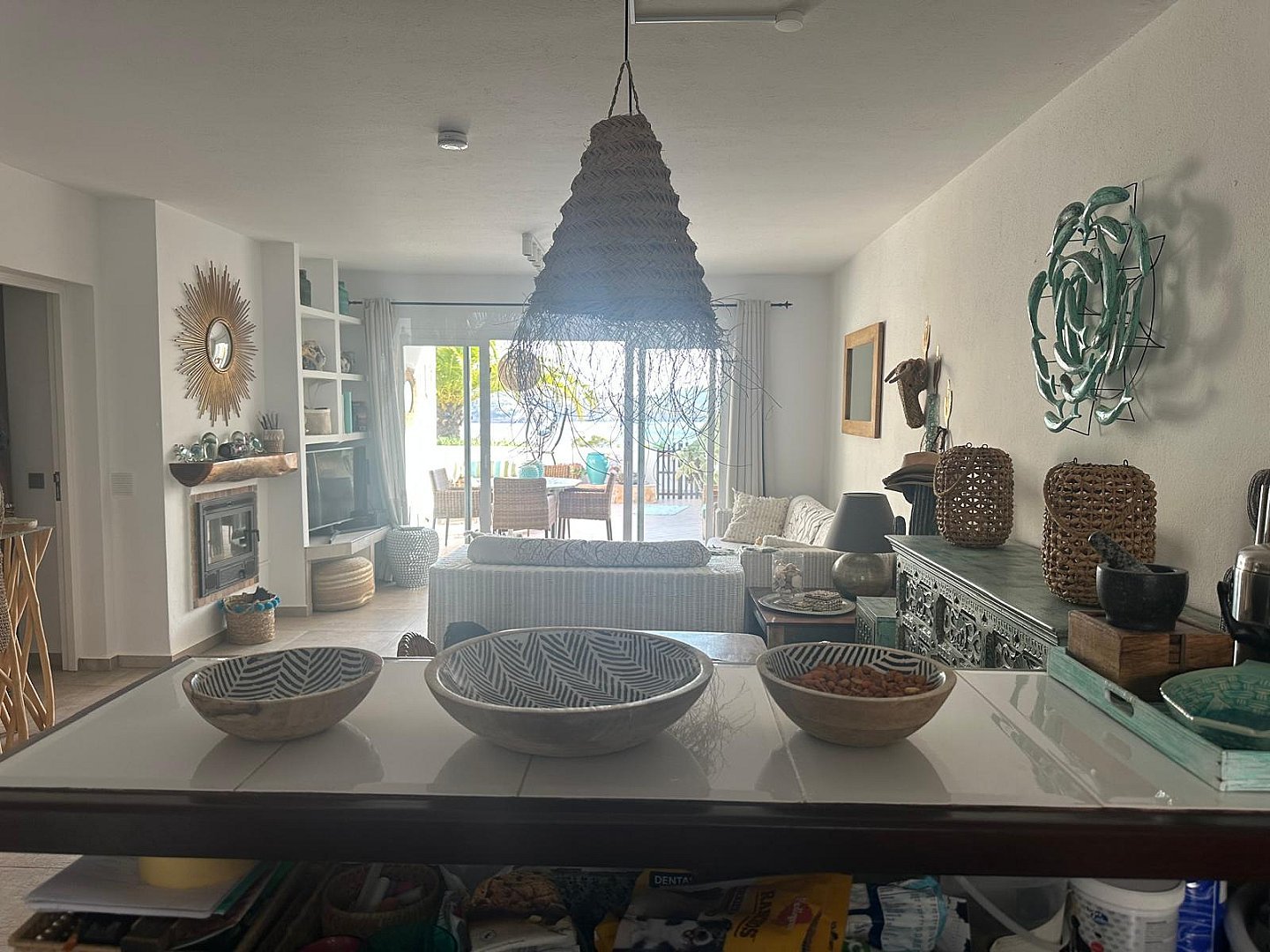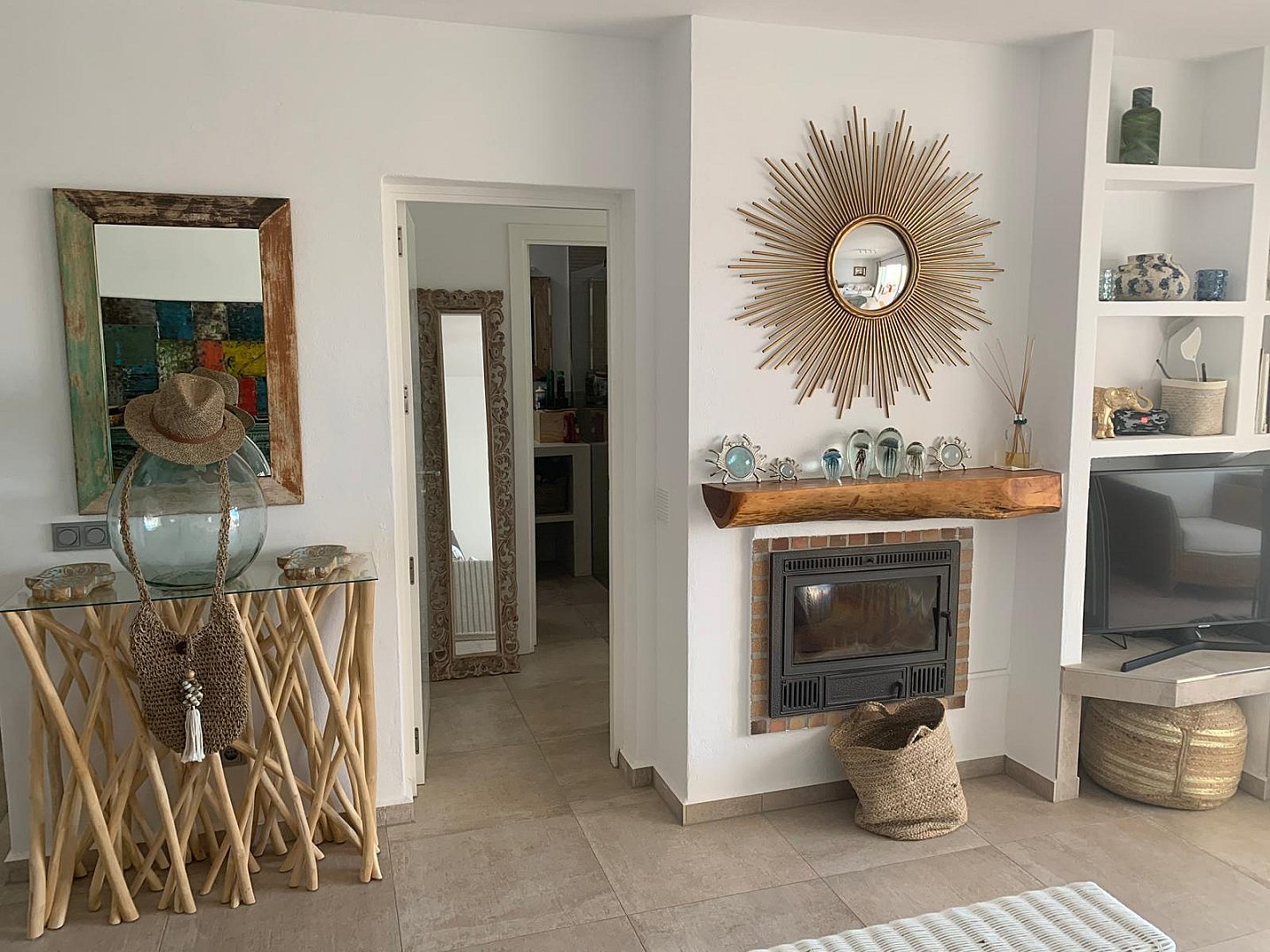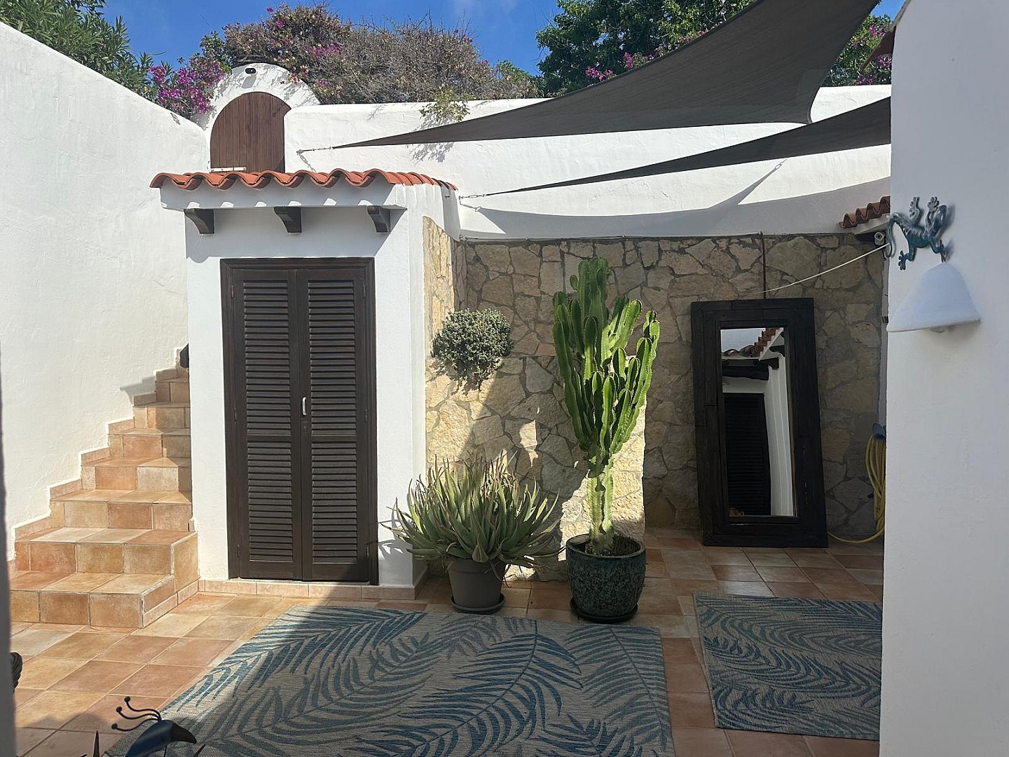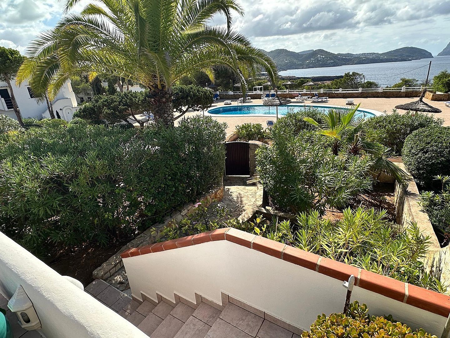 In the west of the island is this beautiful Ibizan house, located in a peaceful setting surrounded by nature. Situated right next to the small cove of Cala Codolar —one of the few original coves that Ibiza still retains— and just a few minutes' walk from Cala Conta, one of the most beautiful beaches on the island with its unforgettable sunsets. The property stands out for its special charm and its stunning panoramic views of the sea, Es Vedrà, and the bays stretching in front of it. The south-facing house offers the ideal space for a small family or a group of friends who wish to enjoy tranquility, nature, and the Mediterranean lifestyle in a privileged location. Its bright interiors, a large panoramic terrace, a charming patio, a walkable rooftop, and a well-maintained garden create a harmonious ensemble that invites relaxation and enjoyment. Among its features are a large sunny terrace with a natural stone wall and an outdoor fireplace, magnificent views of Es Vedrà, and direct access to the garden with palm trees. The house has two air-conditioned bedrooms, two modern bathrooms, and a cozy living room with a fireplace and open layout. In the patio, there are natural stone walls, an outdoor shower, a storage room, and a climate-controlled auxiliary room that can also be used as a third bedroom. From the rooftop, there is an impressive panoramic view of the sea and the natural surroundings. The property also includes a spacious garage. The house is situated in a privileged location within a large and well-maintained urbanization that offers two communal swimming pools. The house was completely renovated, is in excellent condition, and is ready to move into.