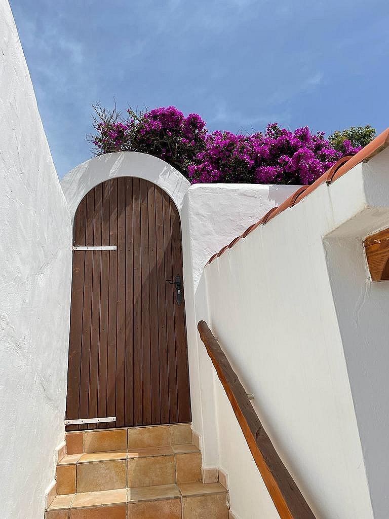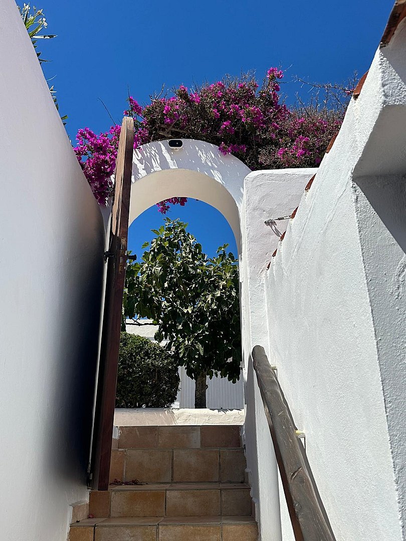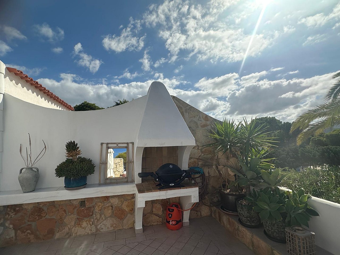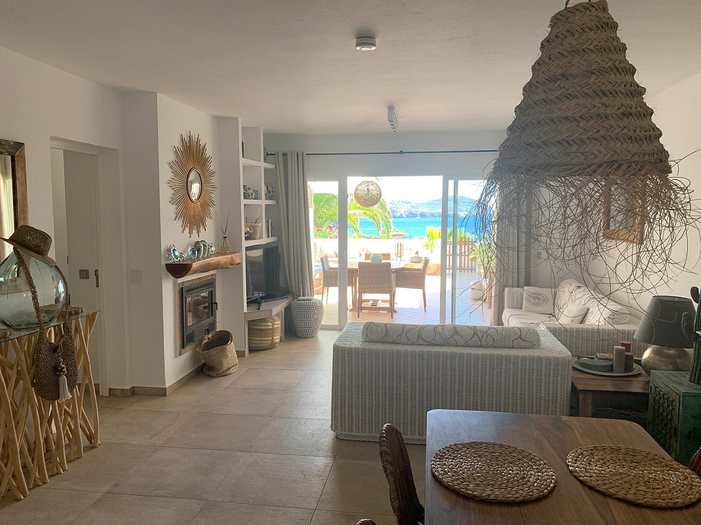In the west of the island is this beautiful Ibizan house, located in a peaceful setting surrounded by nature. Situated right next to the small cove of Cala Codolar —one of the few original coves that Ibiza still retains— and just a few minutes' walk from Cala Conta, one of the most beautiful beaches on the island with its unforgettable sunsets. The property stands out for its special charm and its stunning panoramic views of the sea, Es Vedrà, and the bays stretching in front of it. The south-facing house offers the ideal space for a small family or a group of friends who wish to enjoy tranquility, nature, and the Mediterranean lifestyle in a privileged location. Its bright interiors, a large panoramic terrace, a charming patio, a walkable rooftop, and a well-maintained garden create a harmonious ensemble that invites relaxation and enjoyment. Among its features are a large sunny terrace with a natural stone wall and an outdoor fireplace, magnificent views of Es Vedrà, and direct access to the garden with palm trees. The house has two air-conditioned bedrooms, two modern bathrooms, and a cozy living room with a fireplace and open layout. In the patio, there are natural stone walls, an outdoor shower, a storage room, and a climate-controlled auxiliary room that can also be used as a third bedroom. From the rooftop, there is an impressive panoramic view of the sea and the natural surroundings. The property also includes a spacious garage. The house is situated in a privileged location within a large and well-maintained urbanization that offers two communal swimming pools. The house was completely renovated, is in excellent condition, and is ready to move into.