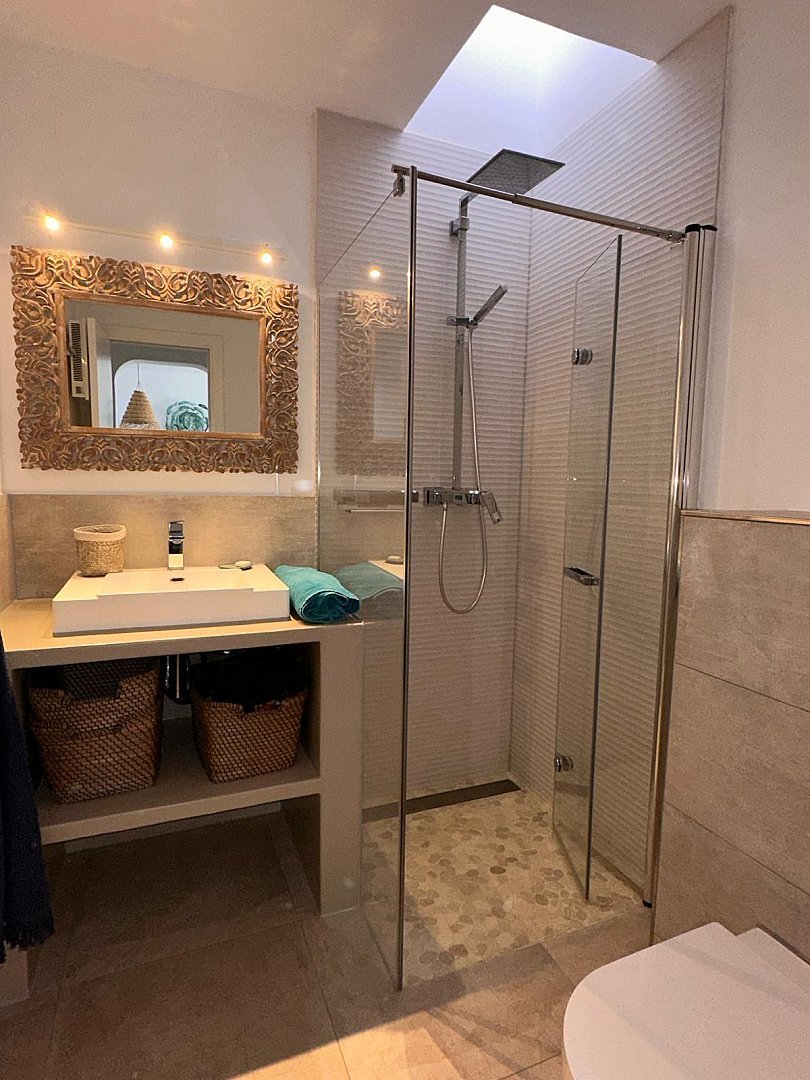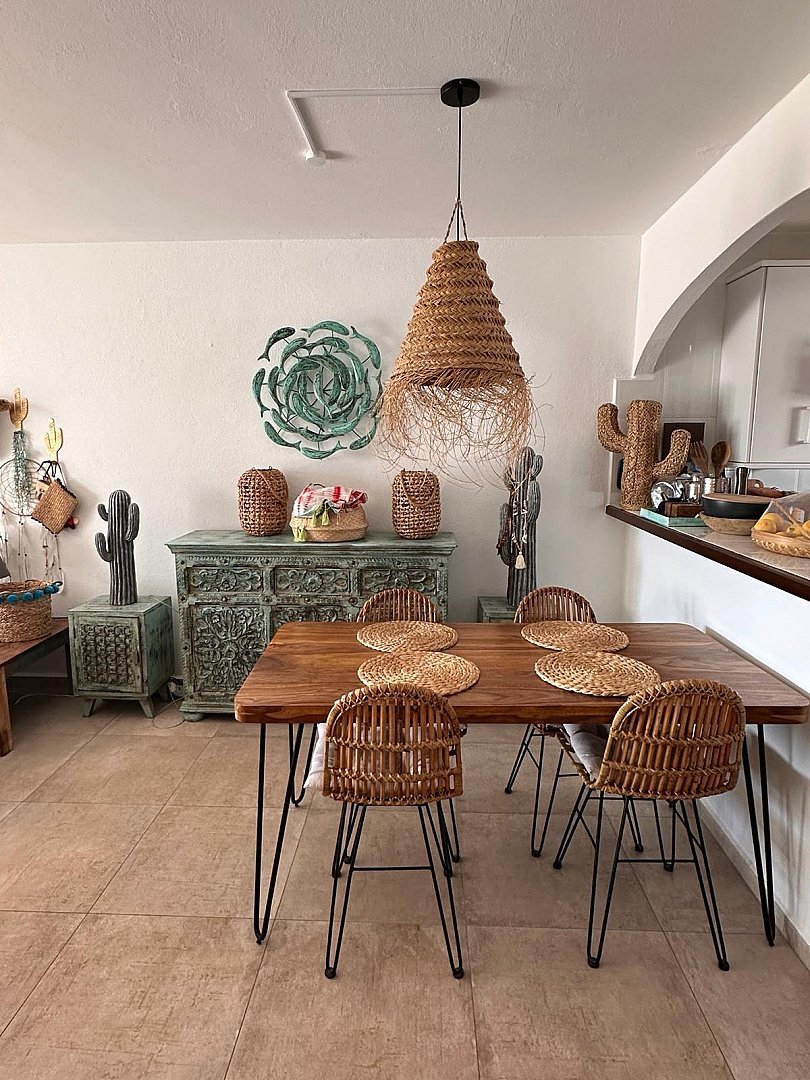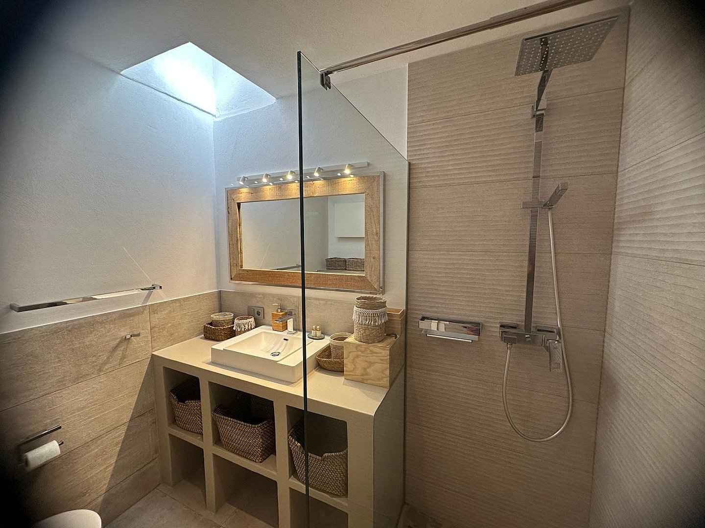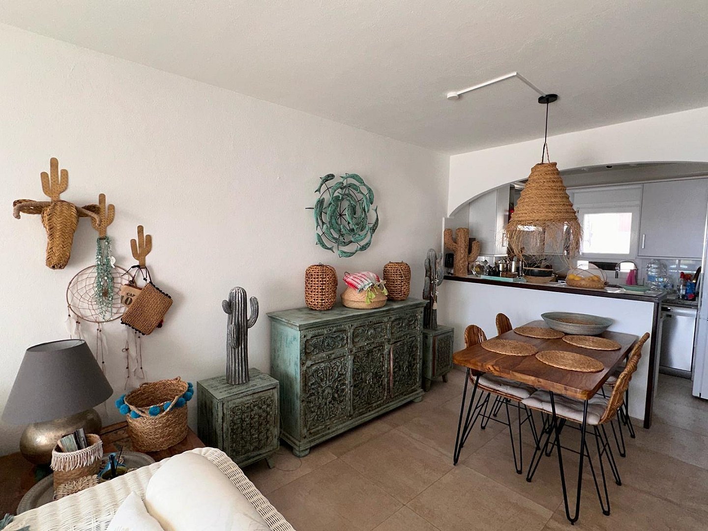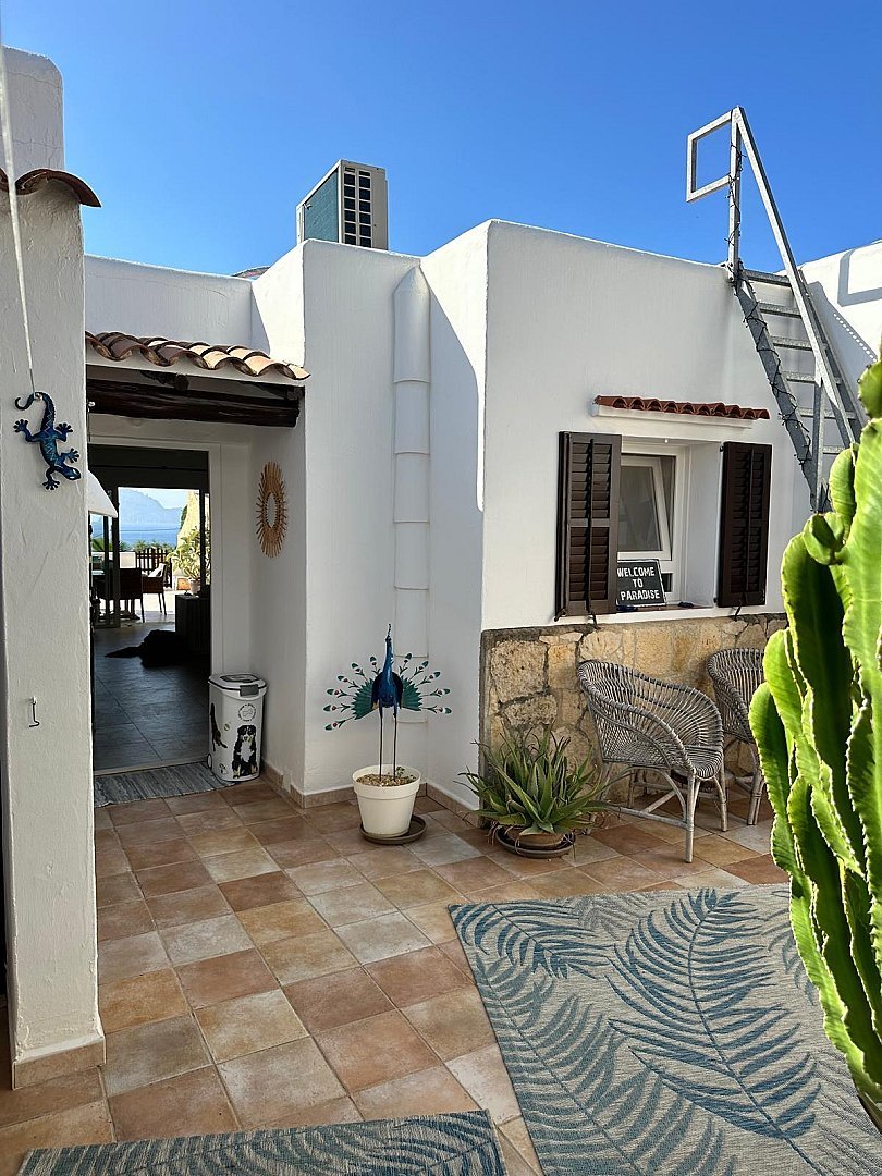 In the west of the island is this beautiful Ibizan house, located in a peaceful setting surrounded by nature. Situated right next to the small cove of Cala Codolar —one of the few original coves that Ibiza still retains— and just a few minutes' walk from Cala Conta, one of the most beautiful beaches on the island with its unforgettable sunsets. The property stands out for its special charm and its stunning panoramic views of the sea, Es Vedrà, and the bays stretching in front of it. The south-facing house offers the ideal space for a small family or a group of friends who wish to enjoy tranquility, nature, and the Mediterranean lifestyle in a privileged location. Its bright interiors, a large panoramic terrace, a charming patio, a walkable rooftop, and a well-maintained garden create a harmonious ensemble that invites relaxation and enjoyment. Among its features are a large sunny terrace with a natural stone wall and an outdoor fireplace, magnificent views of Es Vedrà, and direct access to the garden with palm trees. The house has two air-conditioned bedrooms, two modern bathrooms, and a cozy living room with a fireplace and open layout. In the patio, there are natural stone walls, an outdoor shower, a storage room, and a climate-controlled auxiliary room that can also be used as a third bedroom. From the rooftop, there is an impressive panoramic view of the sea and the natural surroundings. The property also includes a spacious garage. The house is situated in a privileged location within a large and well-maintained urbanization that offers two communal swimming pools. The house was completely renovated, is in excellent condition, and is ready to move into.
