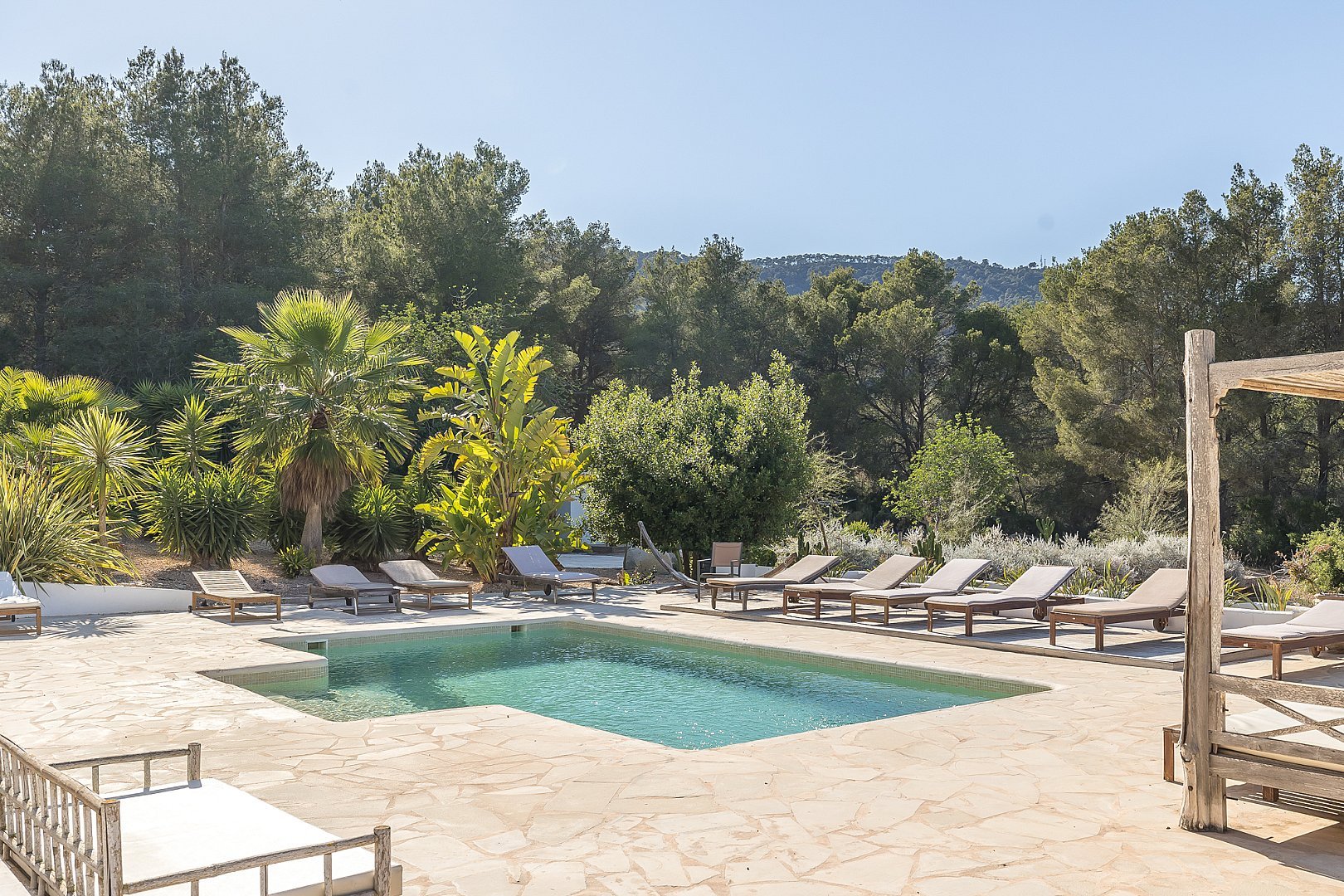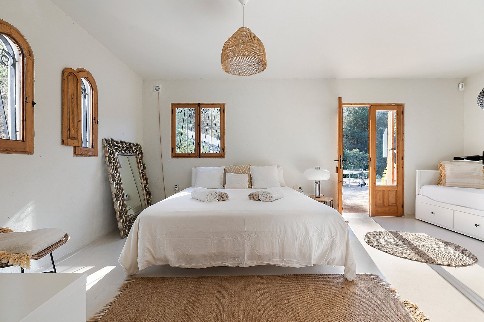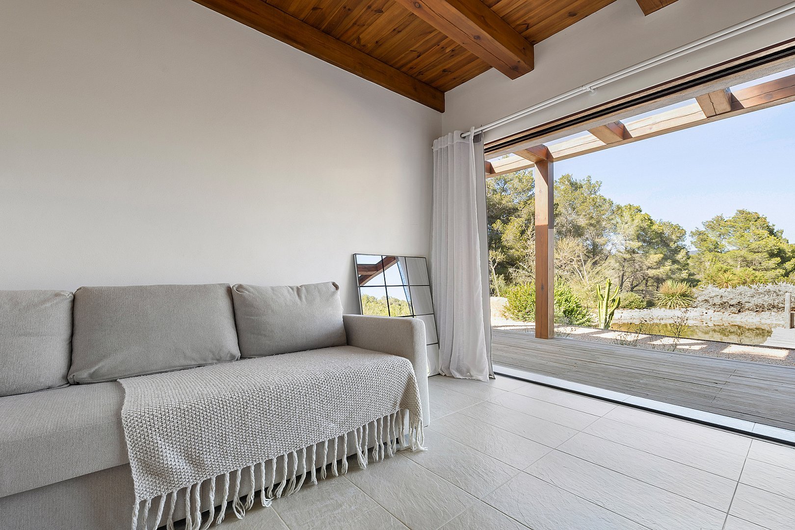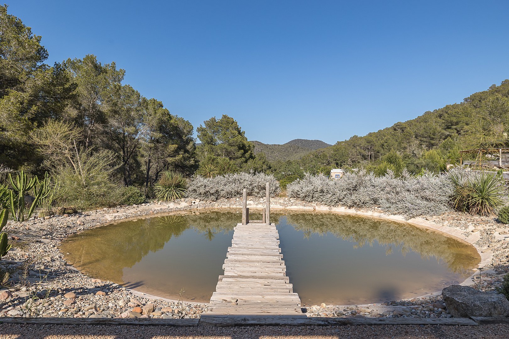 This exclusive villa is located in the sought-after location of Es Cubells and combines traditional architecture with modern luxury. The property was built in 1979 and extensively modernised in 2014. It is set on a spacious plot and comprises a separate guest house in addition to the main villa. The main villa offers six bedrooms and four bathrooms and is characterised by high-quality materials such as concrete floors and custom-made built-in wardrobes. The fully equipped kitchen is fitted with modern appliances and the open-plan design creates a bright, inviting atmosphere. The open-plan layout provides impressive views of the surrounding nature and enhances the feeling of tranquillity and privacy. In addition to the villa, the property has a separate guest house to ensure the comfort and privacy of visitors or family members. The property also includes a picturesque lake, which emphasises the natural beauty of the surroundings and offers a unique retreat. The swimming pool, spacious terrace and balcony invite relaxation and leisure activities. A fireplace in the living area provides cosy warmth and atmosphere, while an advanced security system with alarm system and electronic gate provides additional security. Heat pump heating ensures a comfortable temperature throughout the property all year round. This property offers a rare opportunity to live in one of the most exclusive areas of Ibiza, combining luxurious comfort with an exceptional location and privacy.