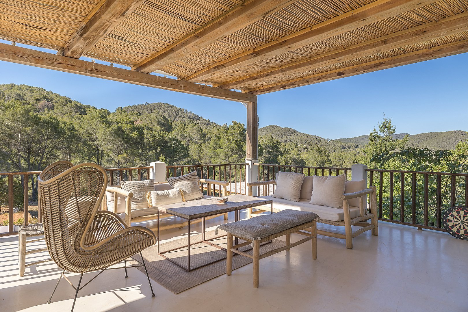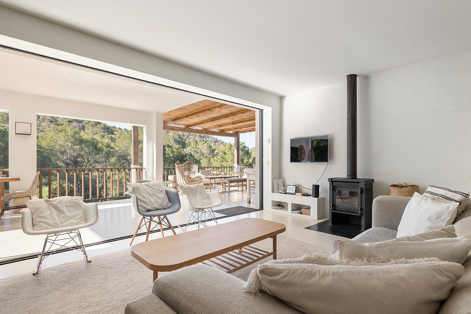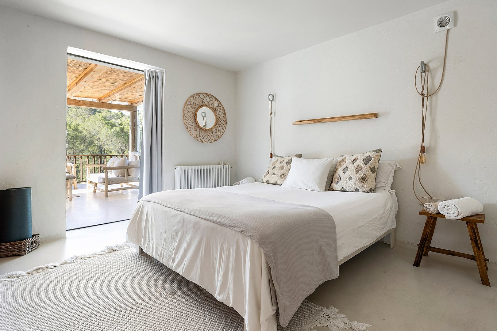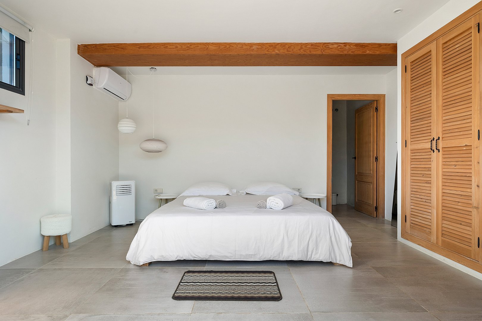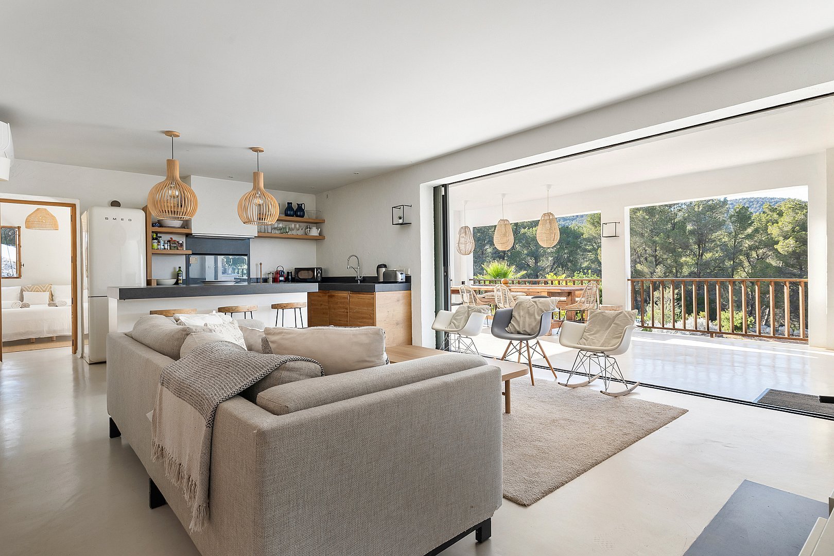 This exclusive villa is located in the sought-after location of Es Cubells and combines traditional architecture with modern luxury. The property was built in 1979 and extensively modernised in 2014. It is set on a spacious plot and comprises a separate guest house in addition to the main villa. The main villa offers six bedrooms and four bathrooms and is characterised by high-quality materials such as concrete floors and custom-made built-in wardrobes. The fully equipped kitchen is fitted with modern appliances and the open-plan design creates a bright, inviting atmosphere. The open-plan layout provides impressive views of the surrounding nature and enhances the feeling of tranquillity and privacy. In addition to the villa, the property has a separate guest house to ensure the comfort and privacy of visitors or family members. The property also includes a picturesque lake, which emphasises the natural beauty of the surroundings and offers a unique retreat. The swimming pool, spacious terrace and balcony invite relaxation and leisure activities. A fireplace in the living area provides cosy warmth and atmosphere, while an advanced security system with alarm system and electronic gate provides additional security. Heat pump heating ensures a comfortable temperature throughout the property all year round. This property offers a rare opportunity to live in one of the most exclusive areas of Ibiza, combining luxurious comfort with an exceptional location and privacy.