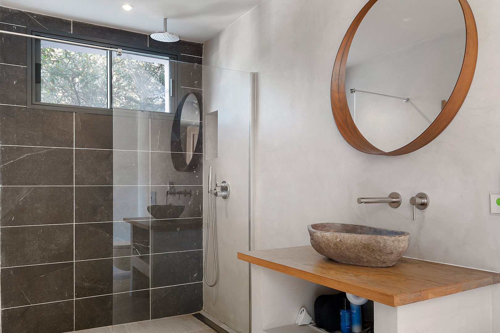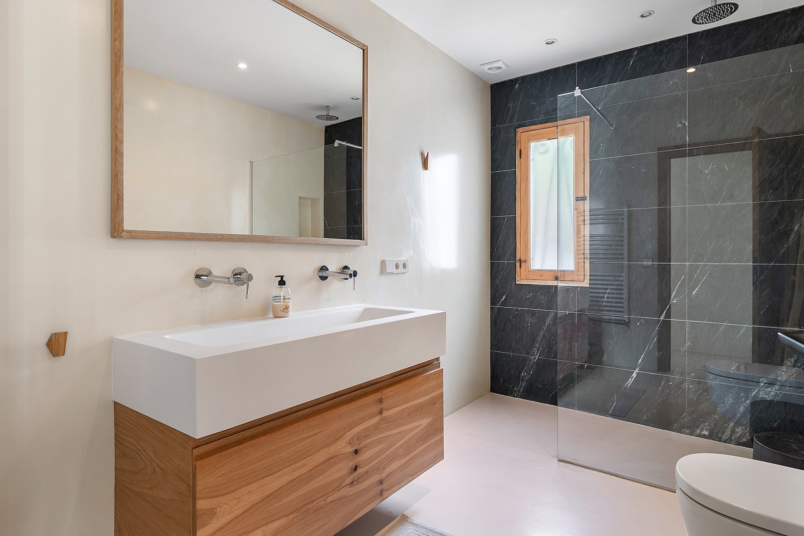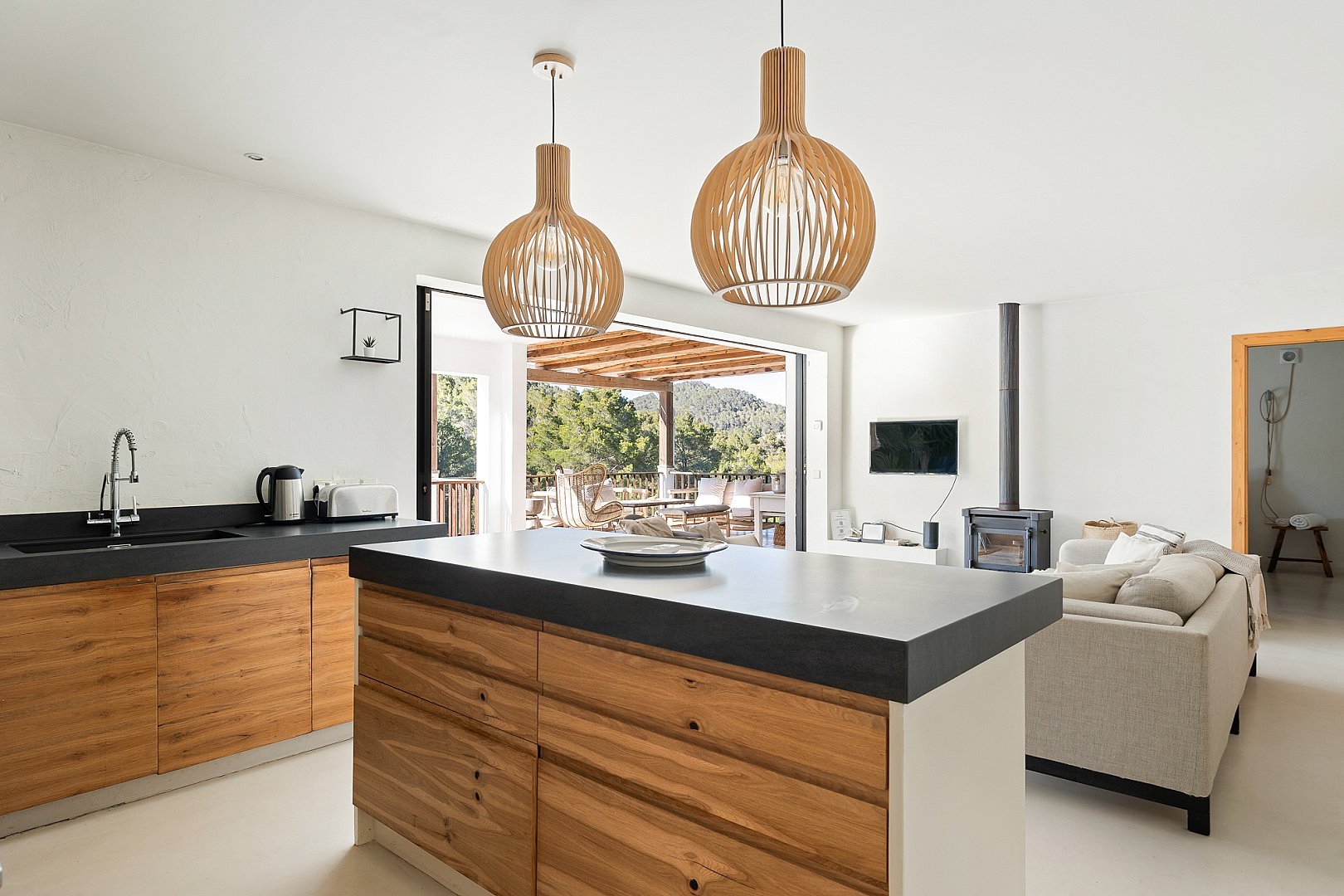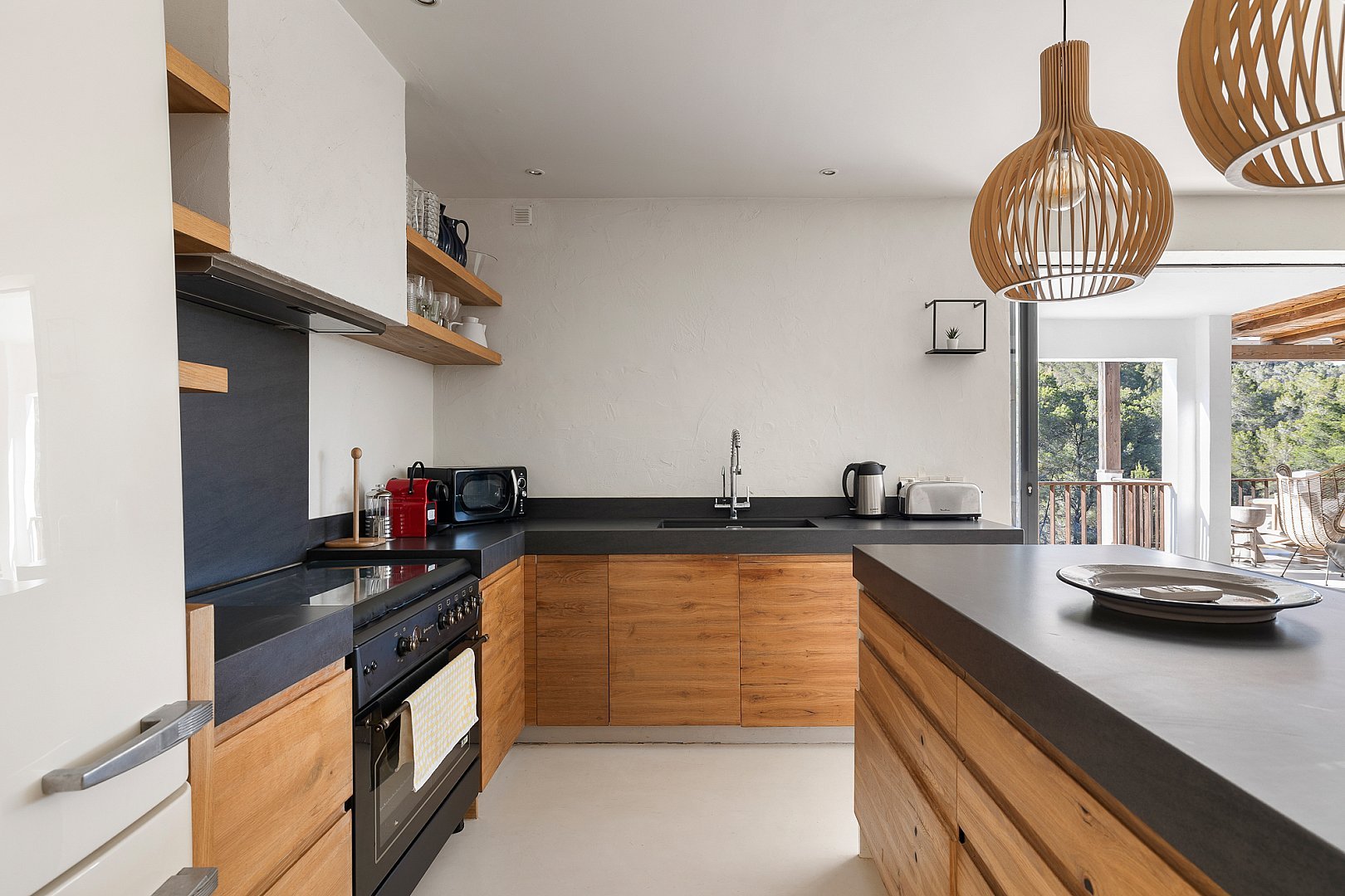 This exclusive villa is located in the sought-after location of Es Cubells and combines traditional architecture with modern luxury. The property was built in 1979 and extensively modernised in 2014. It is set on a spacious plot and comprises a separate guest house in addition to the main villa. The main villa offers six bedrooms and four bathrooms and is characterised by high-quality materials such as concrete floors and custom-made built-in wardrobes. The fully equipped kitchen is fitted with modern appliances and the open-plan design creates a bright, inviting atmosphere. The open-plan layout provides impressive views of the surrounding nature and enhances the feeling of tranquillity and privacy. In addition to the villa, the property has a separate guest house to ensure the comfort and privacy of visitors or family members. The property also includes a picturesque lake, which emphasises the natural beauty of the surroundings and offers a unique retreat. The swimming pool, spacious terrace and balcony invite relaxation and leisure activities. A fireplace in the living area provides cosy warmth and atmosphere, while an advanced security system with alarm system and electronic gate provides additional security. Heat pump heating ensures a comfortable temperature throughout the property all year round. This property offers a rare opportunity to live in one of the most exclusive areas of Ibiza, combining luxurious comfort with an exceptional location and privacy.