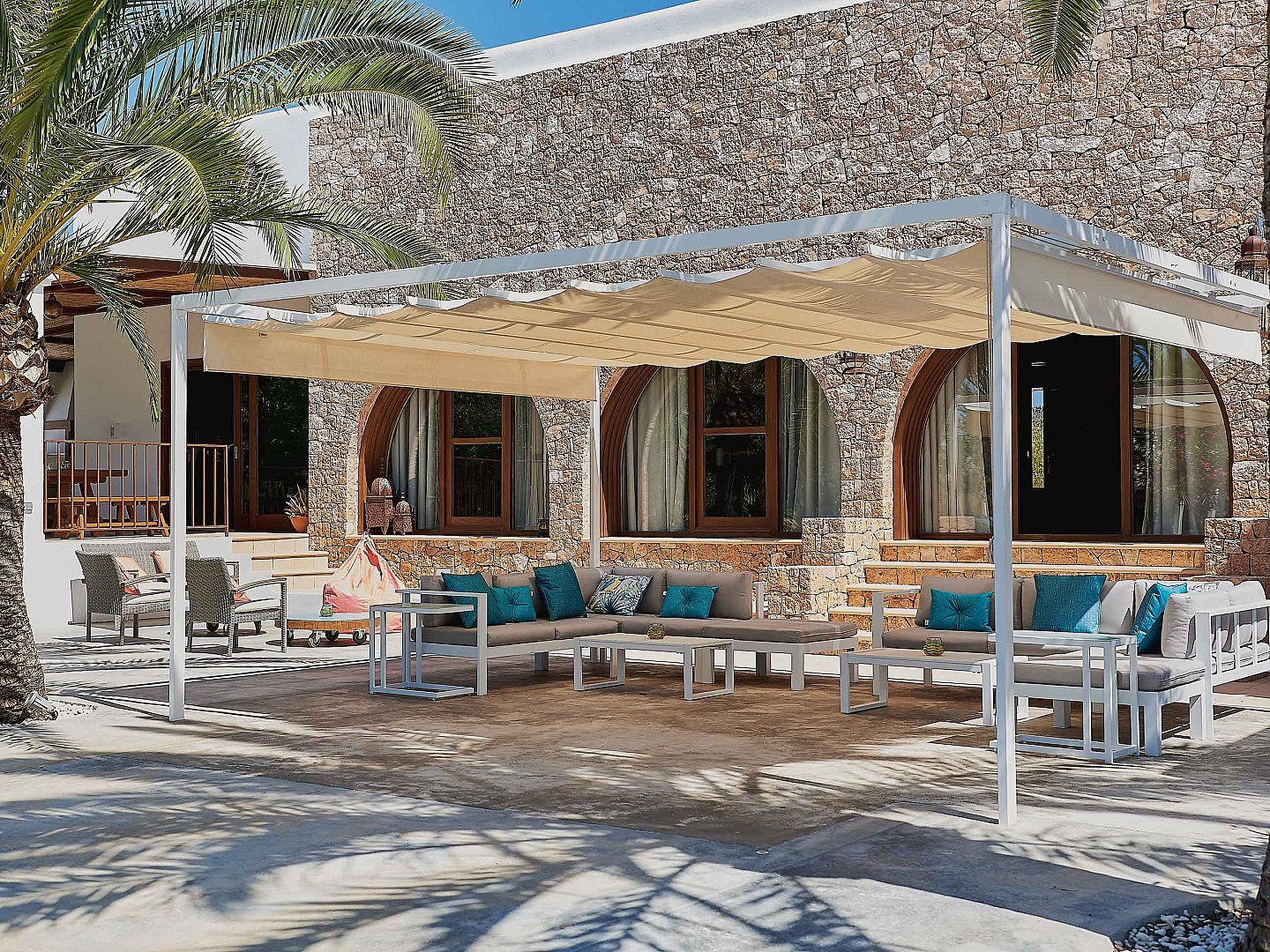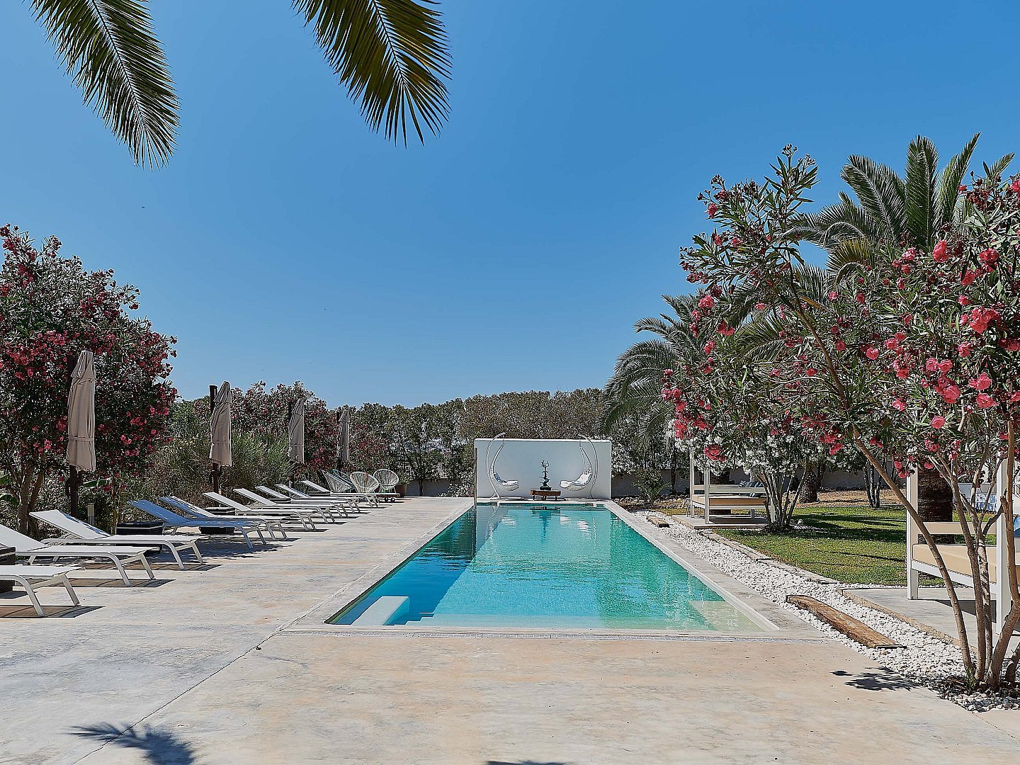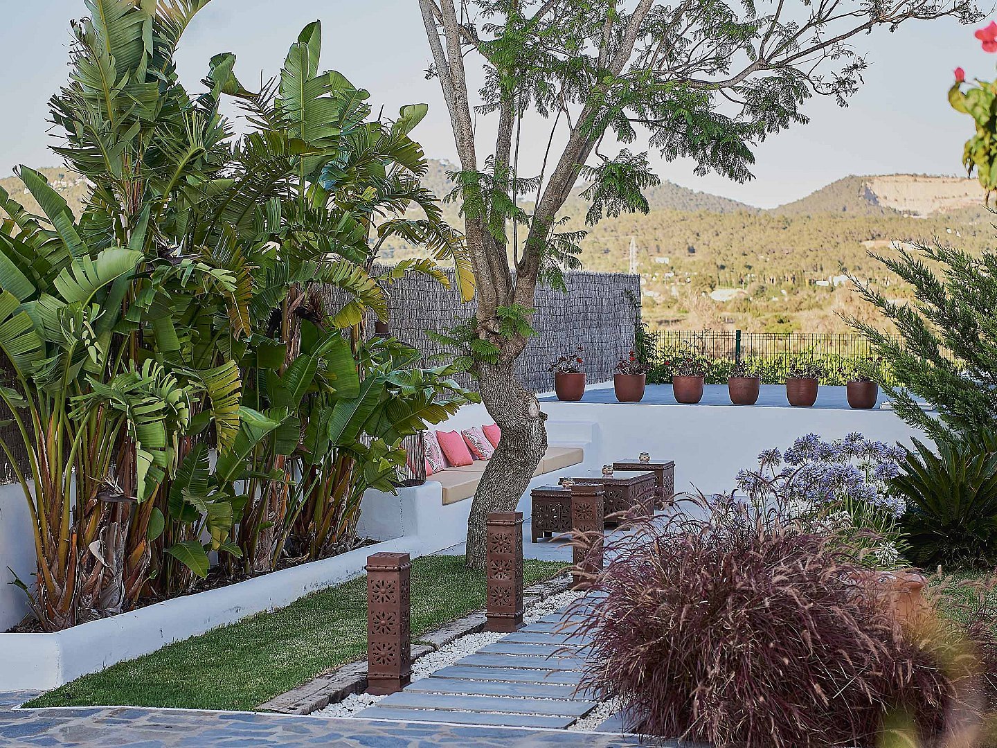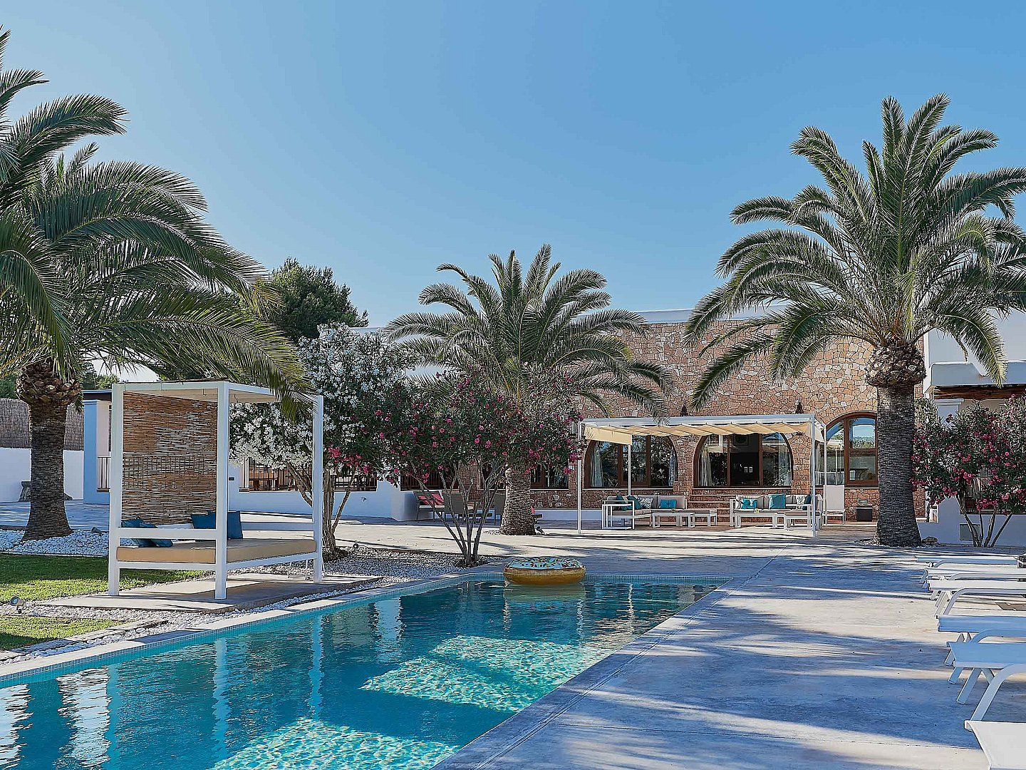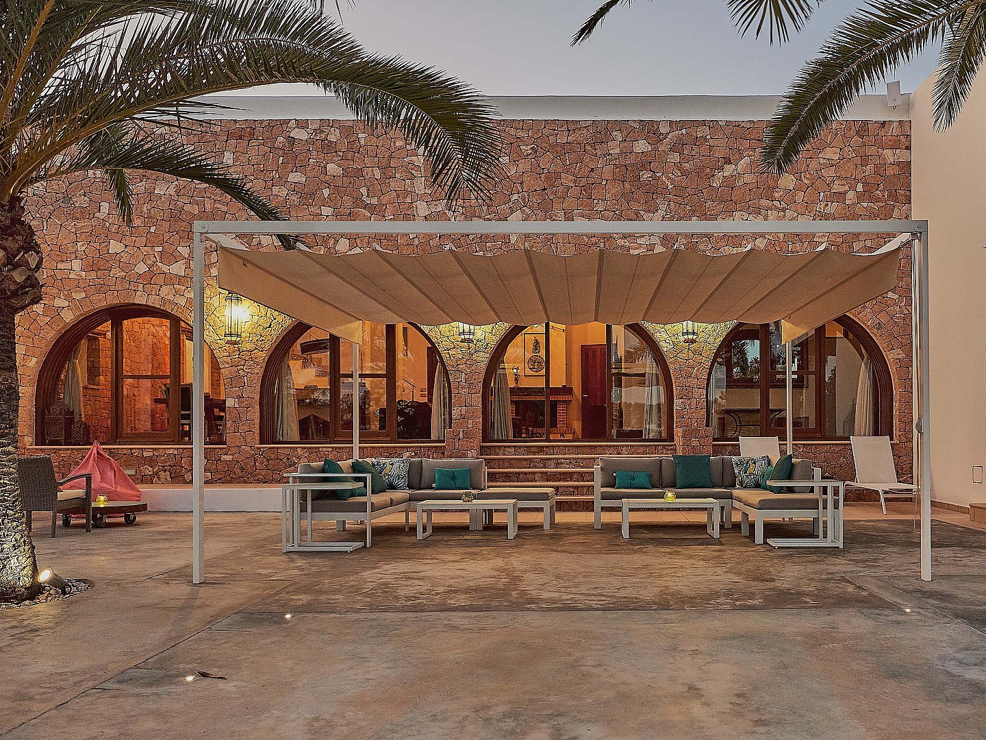 This villa is located in a unique natural setting, very close to Ibiza Town on the edge of Puig den Valls and only about 5 km from Ibiza Town. This quality finished villa consists of five double bedrooms (one with en-suite bathroom and terrace) five bathrooms (one with jacuzzi and another outdoor), a modern fully equipped kitchen with access to the barbecue area, a large living room with fireplace and 5-metre-high ceilings made of Sabina wood. Outside we find a very elegant and well-maintained garden, a 13-metre swimming pool with sun loungers surrounded by palm trees, Balinese beds, chill-out areas with several sofas and tables and a covered barbecue area with dining area. All amenities to enjoy the great summer days.