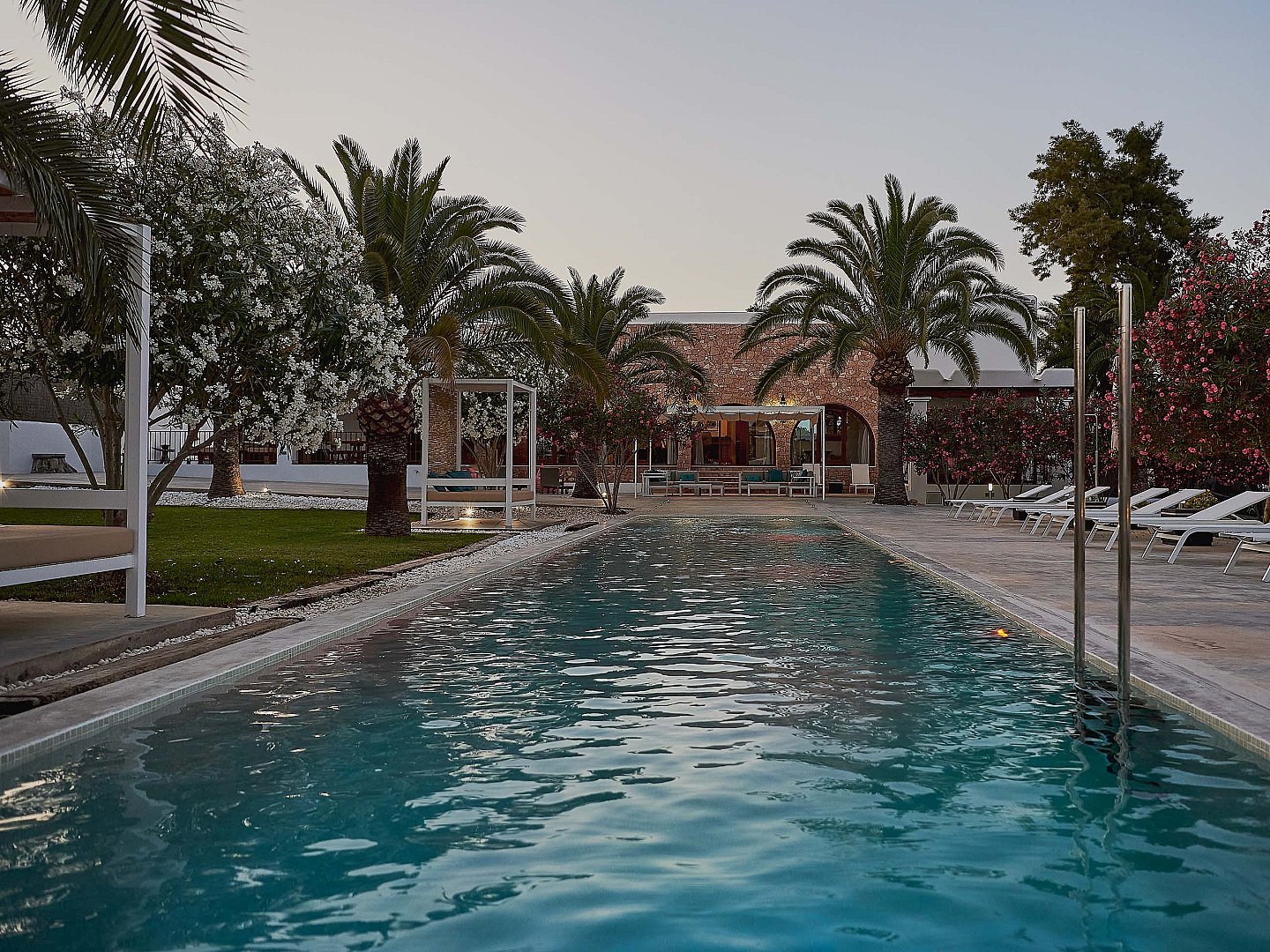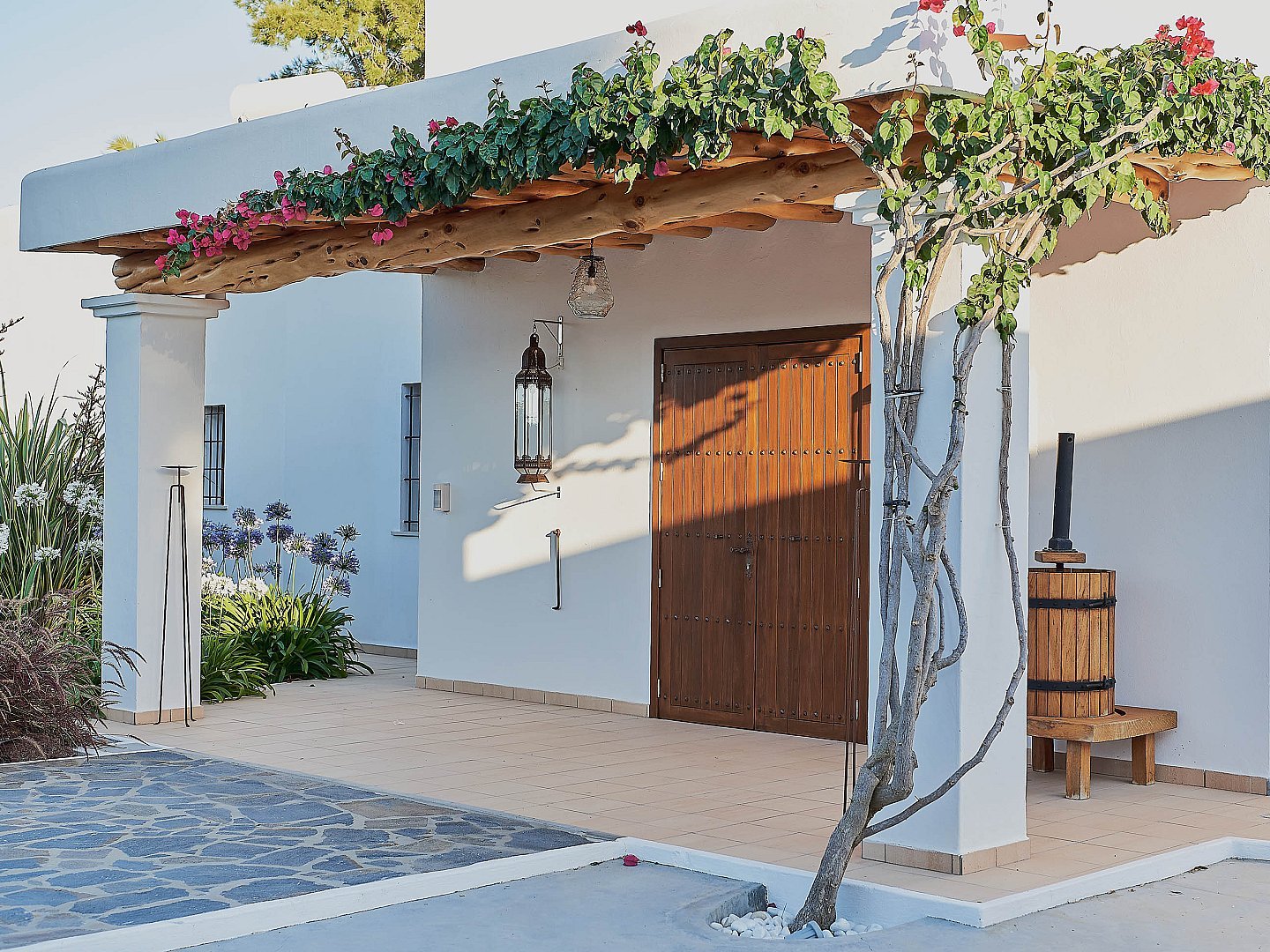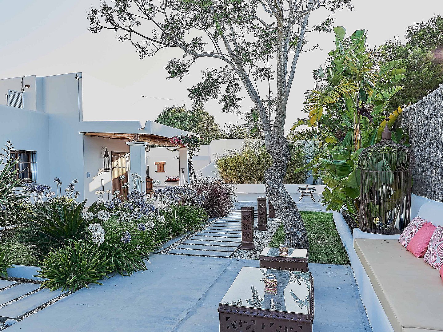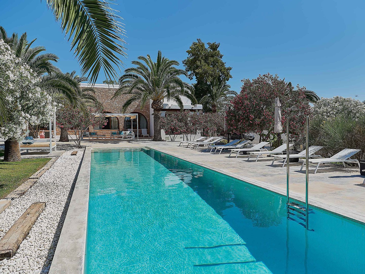 This villa is located in a unique natural setting, very close to Ibiza Town on the edge of Puig den Valls and only about 5 km from Ibiza Town. This quality finished villa consists of five double bedrooms (one with en-suite bathroom and terrace) five bathrooms (one with jacuzzi and another outdoor), a modern fully equipped kitchen with access to the barbecue area, a large living room with fireplace and 5-metre-high ceilings made of Sabina wood. Outside we find a very elegant and well-maintained garden, a 13-metre swimming pool with sun loungers surrounded by palm trees, Balinese beds, chill-out areas with several sofas and tables and a covered barbecue area with dining area. All amenities to enjoy the great summer days.