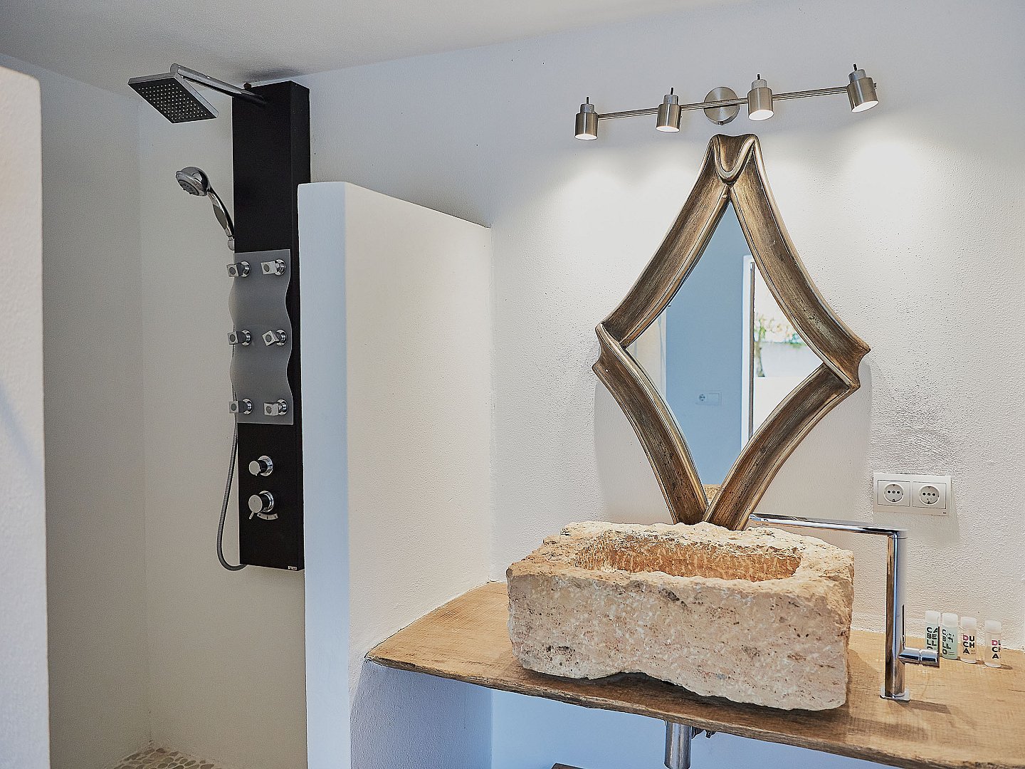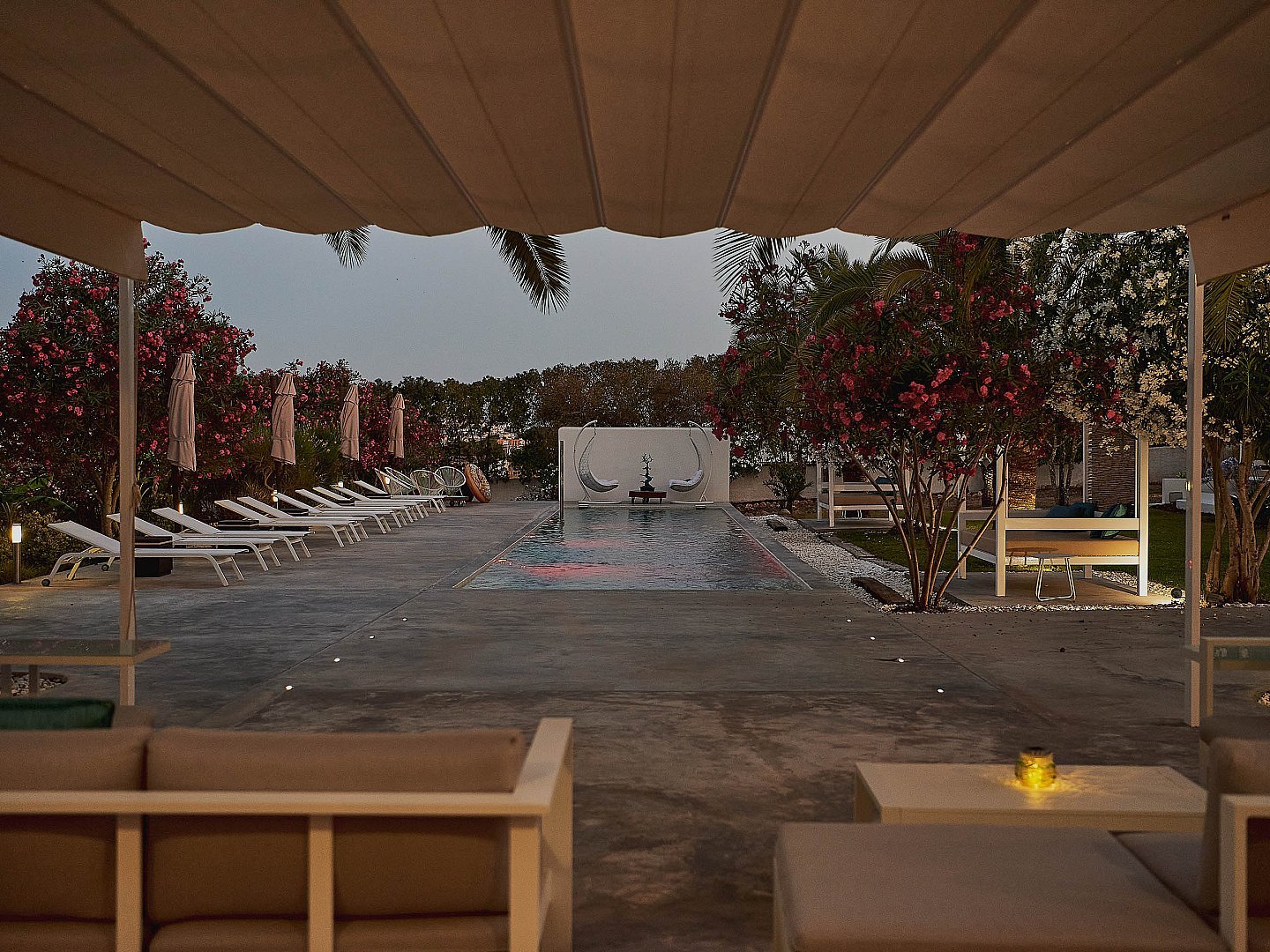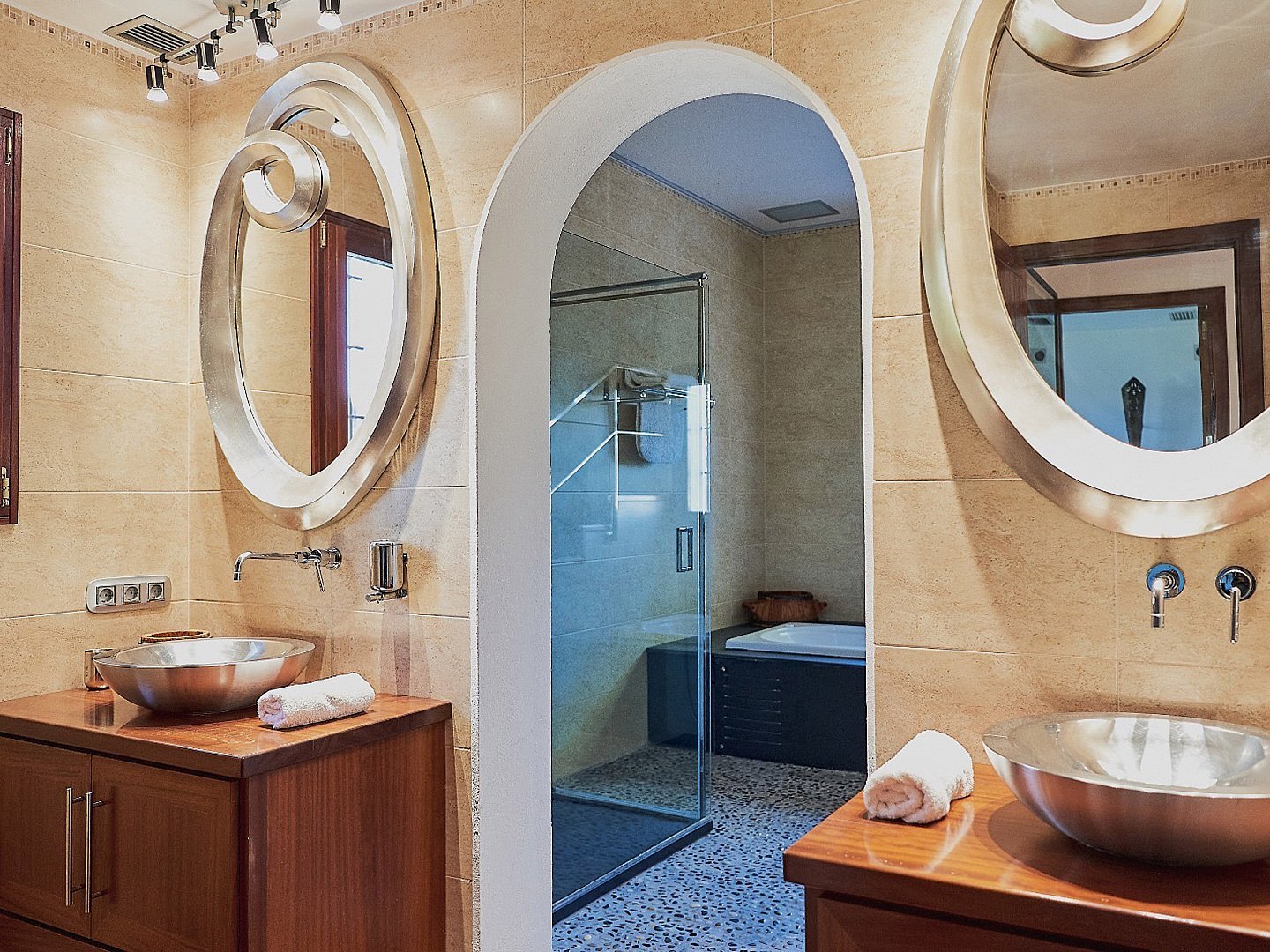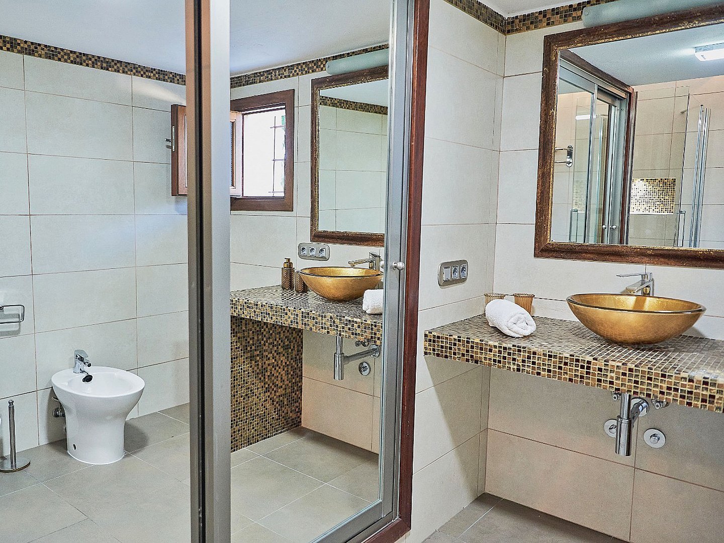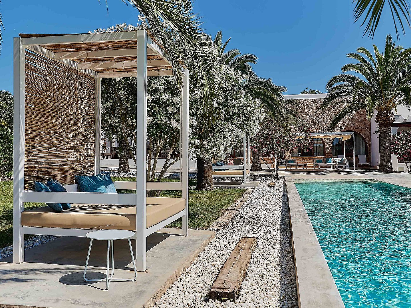 This villa is located in a unique natural setting, very close to Ibiza Town on the edge of Puig den Valls and only about 5 km from Ibiza Town. This quality finished villa consists of five double bedrooms (one with en-suite bathroom and terrace) five bathrooms (one with jacuzzi and another outdoor), a modern fully equipped kitchen with access to the barbecue area, a large living room with fireplace and 5-metre-high ceilings made of Sabina wood. Outside we find a very elegant and well-maintained garden, a 13-metre swimming pool with sun loungers surrounded by palm trees, Balinese beds, chill-out areas with several sofas and tables and a covered barbecue area with dining area. All amenities to enjoy the great summer days.