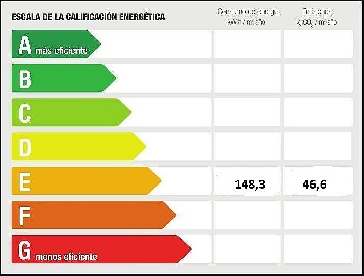Energy consumption value 148.3 kWh/(m2*a) · CO2 emission 46.6 kg/m2 · CO2 Emission Rating E · Energy efficiency rating E