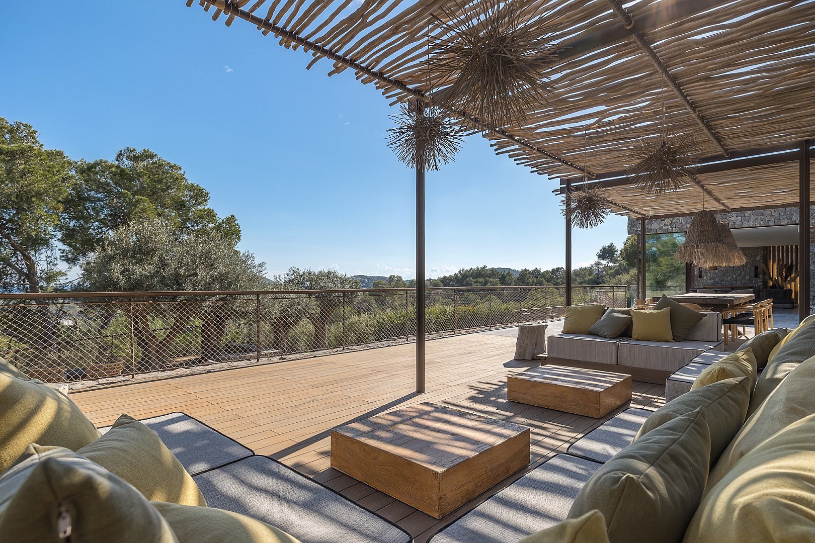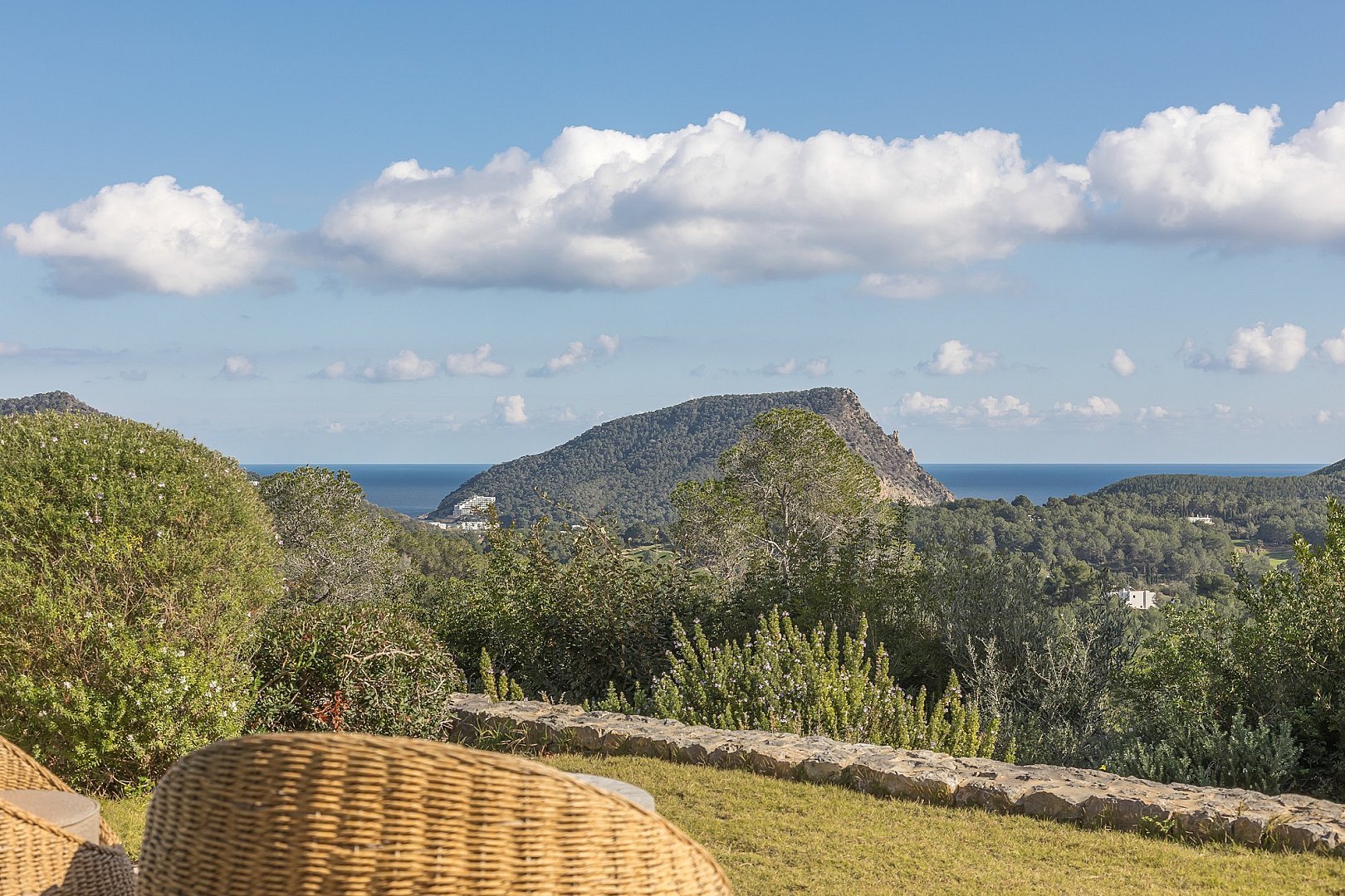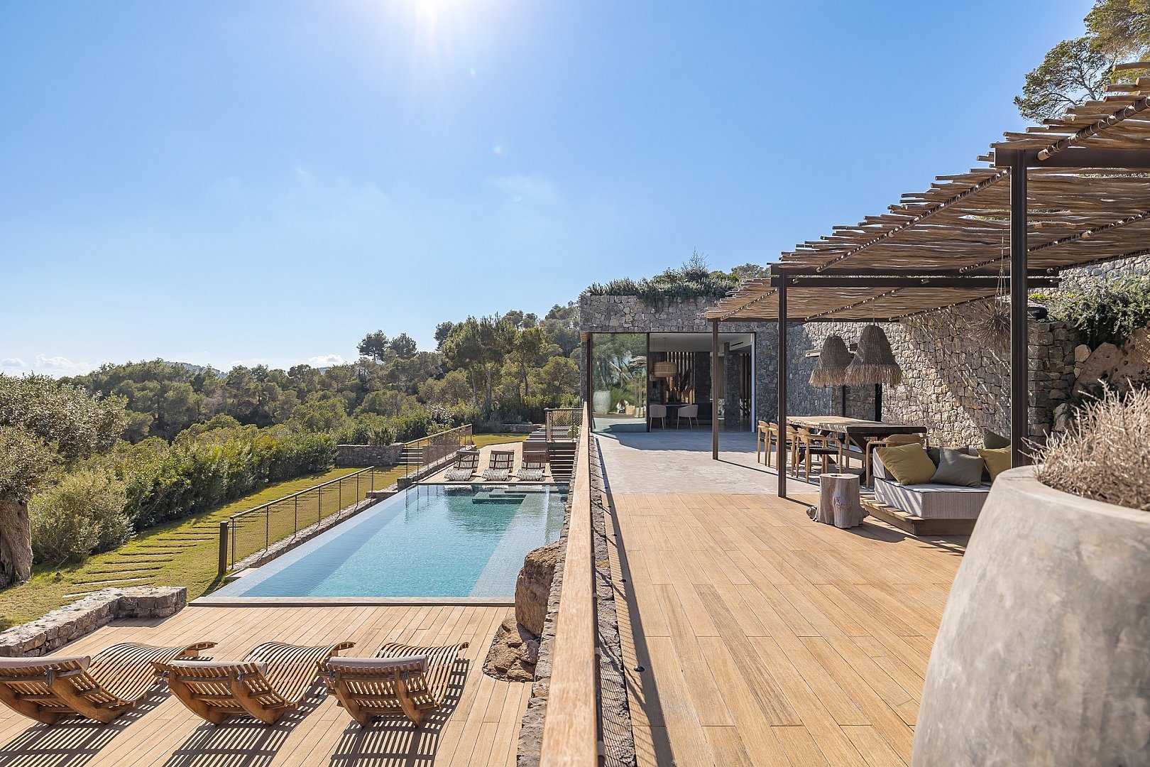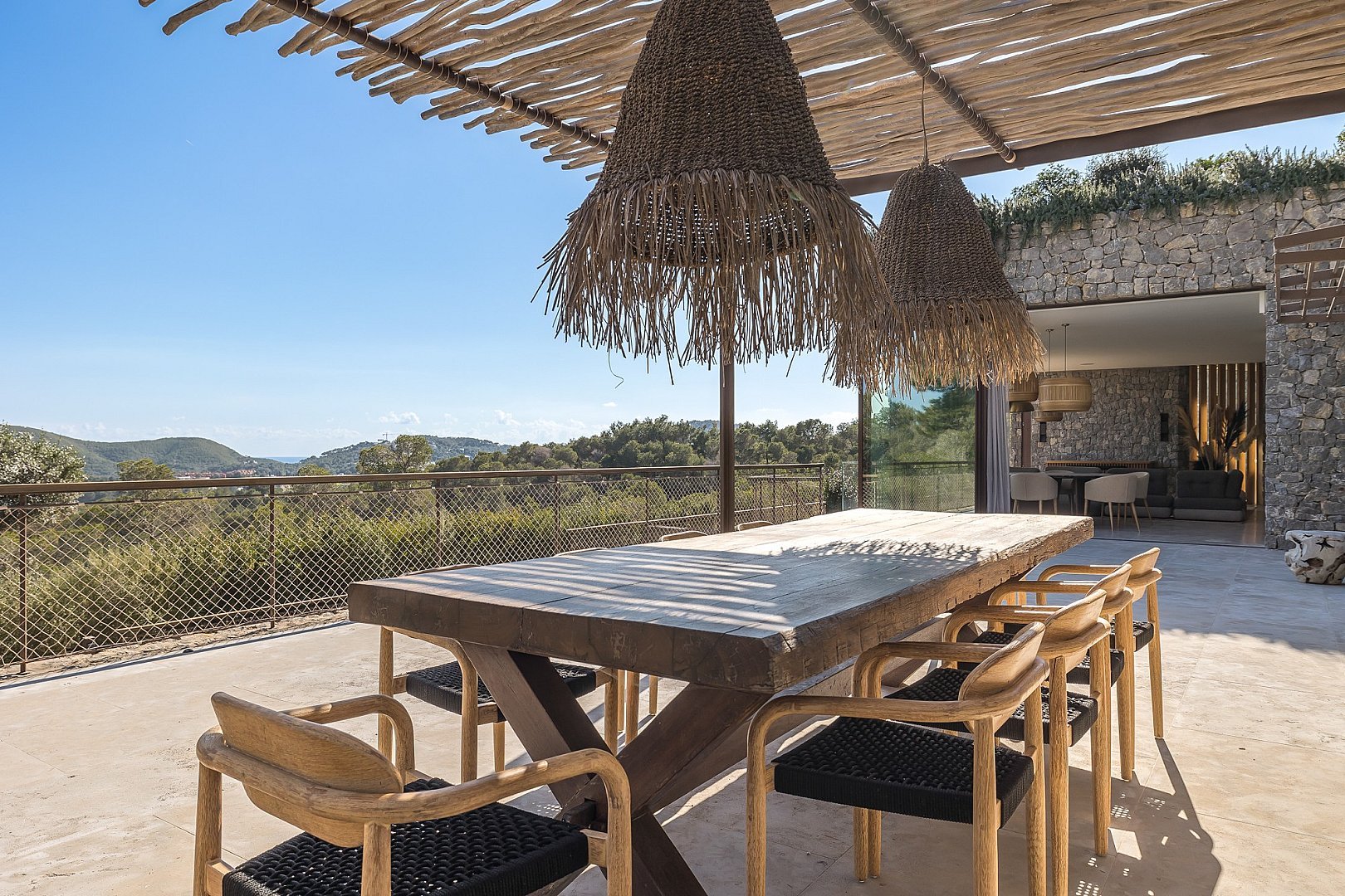 This exceptional newly built property perfectly combines comfort and luxury. Located in a privileged setting, high in the mountains, it offers breathtaking panoramic views all the way to the sea. Its unbeatable location, close to the exclusive golf course, offers the perfect balance between privacy and proximity to the best services of the island. Designed with natural materials of the highest quality, every detail has been carefully selected to integrate harmoniously with the landscape. The house features spacious and bright bedrooms, each with en-suite bathroom and an elegant walk-in closet. The open concept kitchen, equipped with high-end appliances, offers spectacular views of the mountains and gives access to an air-conditioned wine cellar, a paradise for wine lovers. It opens to the living-dining room, a space designed to enjoy the beauty of the surroundings, with unparalleled views of the valley, the mountains and the sea. Outside, a fully equipped kitchen, a laundry room and a bathroom complement the spectacular swimming pool, ideal for relaxing and enjoying the Mediterranean climate. A unique property that invites you to live an incomparable experience on the island.