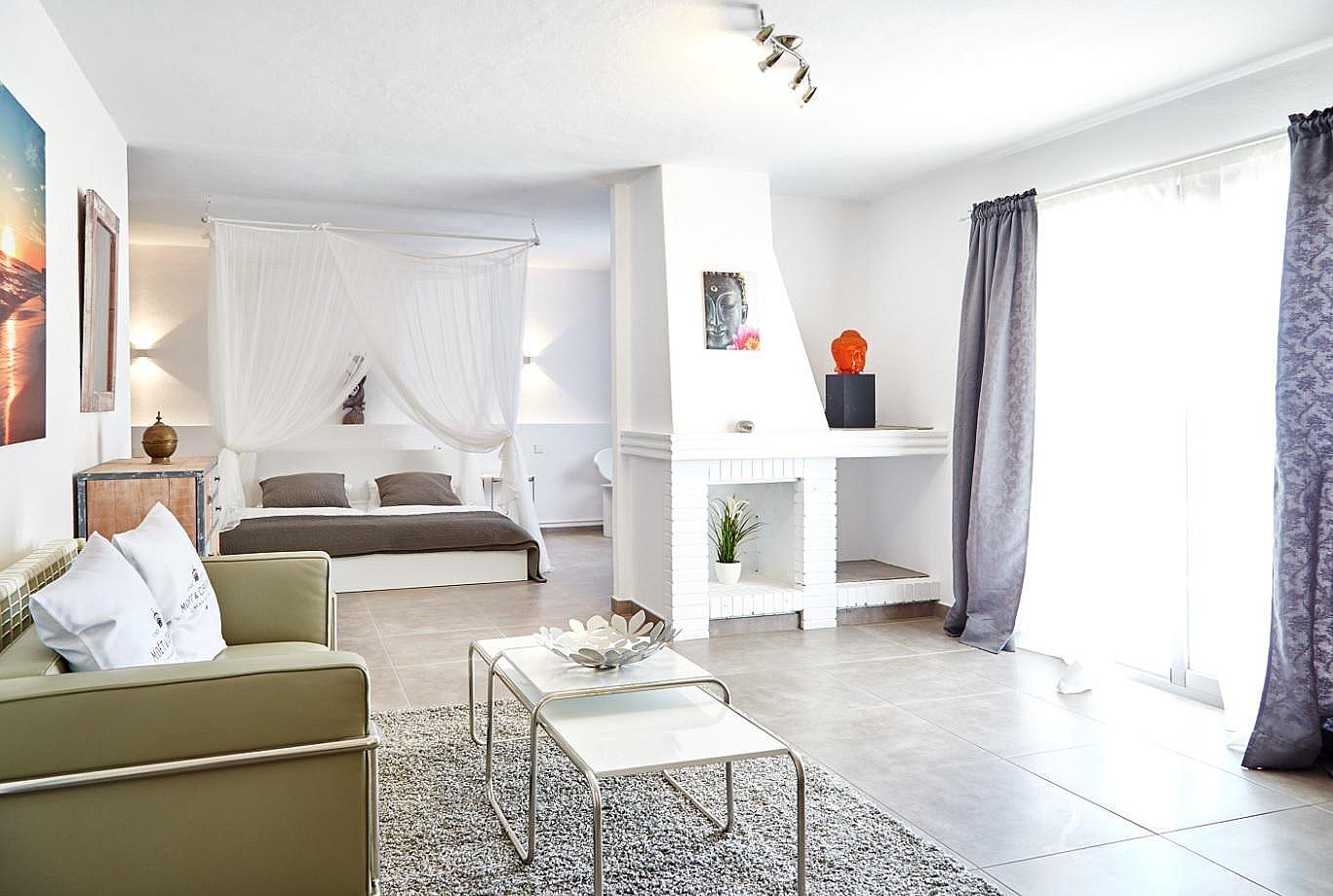 - Dormitorios 3 y 4: Dos amplias suites con pequeñas zonas de estar, grandes camas dobles, baños en suite con ducha, aire acondicionado, entrada independiente y zona de descanso exterior con sofás y una pequeña mesa de comedor.