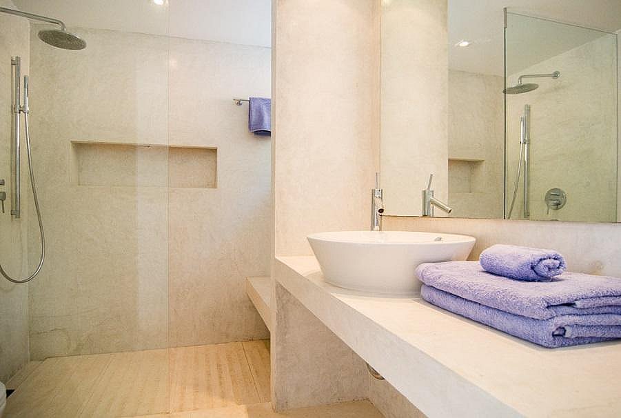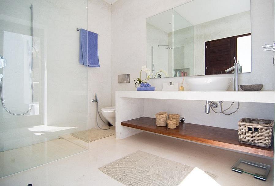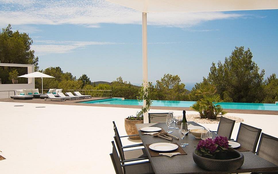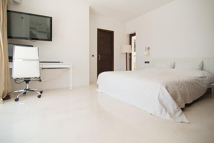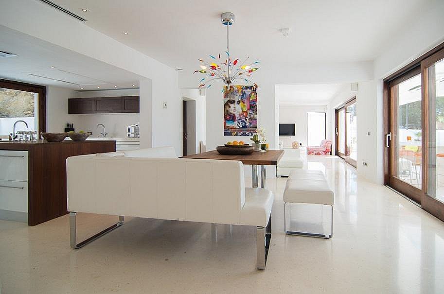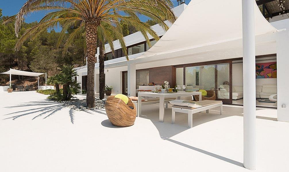 La villa fue construida en 2003 por el reconocido arquitecto Jaime Romano. Recientemente reformada, su magnífica decoración es moderna y cómoda, con varias unidades de aire acondicionado alrededor de la casa para garantizar un interior fresco. El suelo es una hermosa piedra pulida y se extiende por toda la villa que está equipada con grandes puertas correderas dando ligereza a sus espacios. Esta disposición asegura vistas a la terraza de la piscina, al fantástico mar ibicenco y al atardecer.