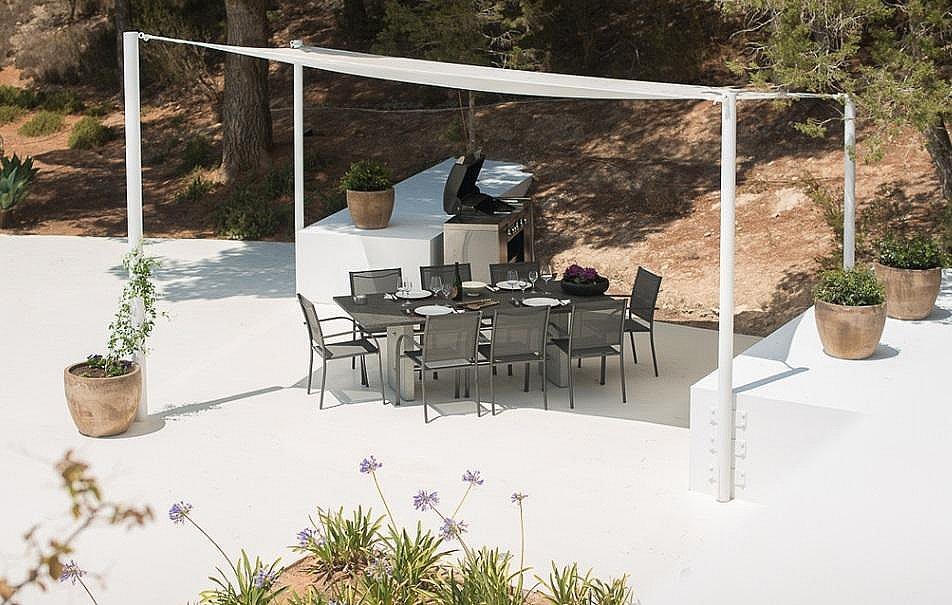 - 3 salas de estar-comedor cubiertas con toldos para retirarse a la sombra, uno de ellos con una barbacoa de gas