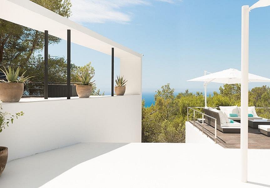 Esta villa de diseño se alza sobre una colina al oeste de la ciudad de San José, con una vista panorámica de la hermosa puesta de sol sobre el mar y las islas de Conillera. La villa de más de 350m2 está situada en una parcela de 6.000m2. Se halla sobre una terraza plana de 450m2, que da a toda la villa un aspecto minimalista y elegante.