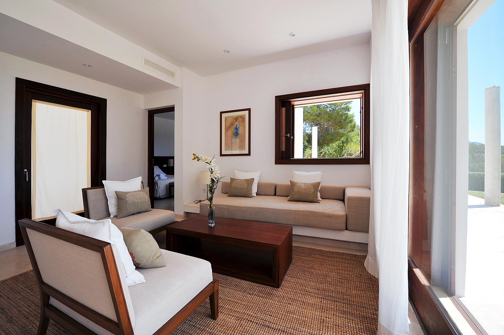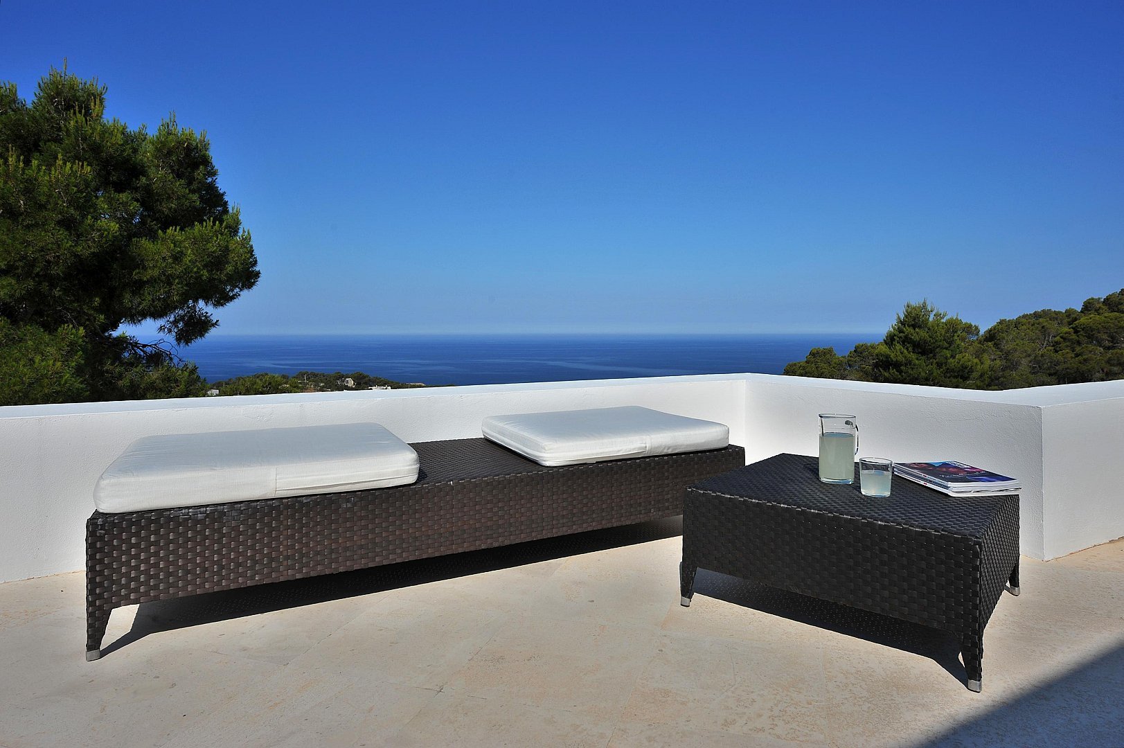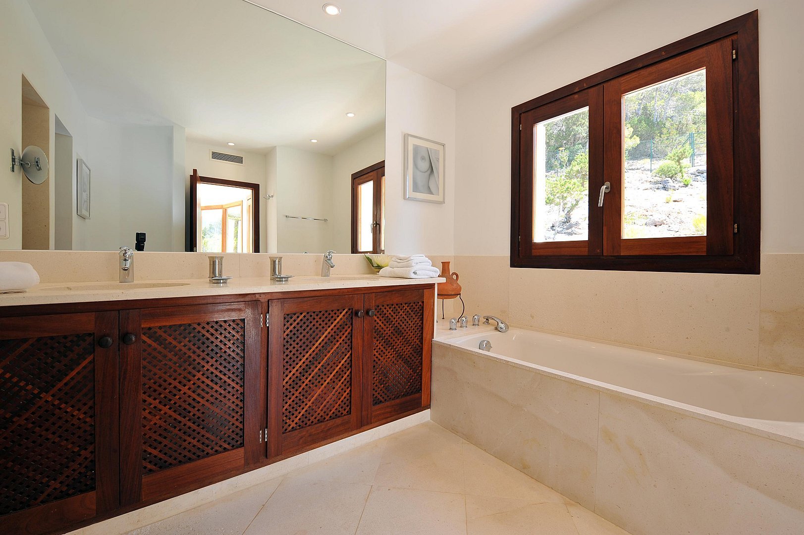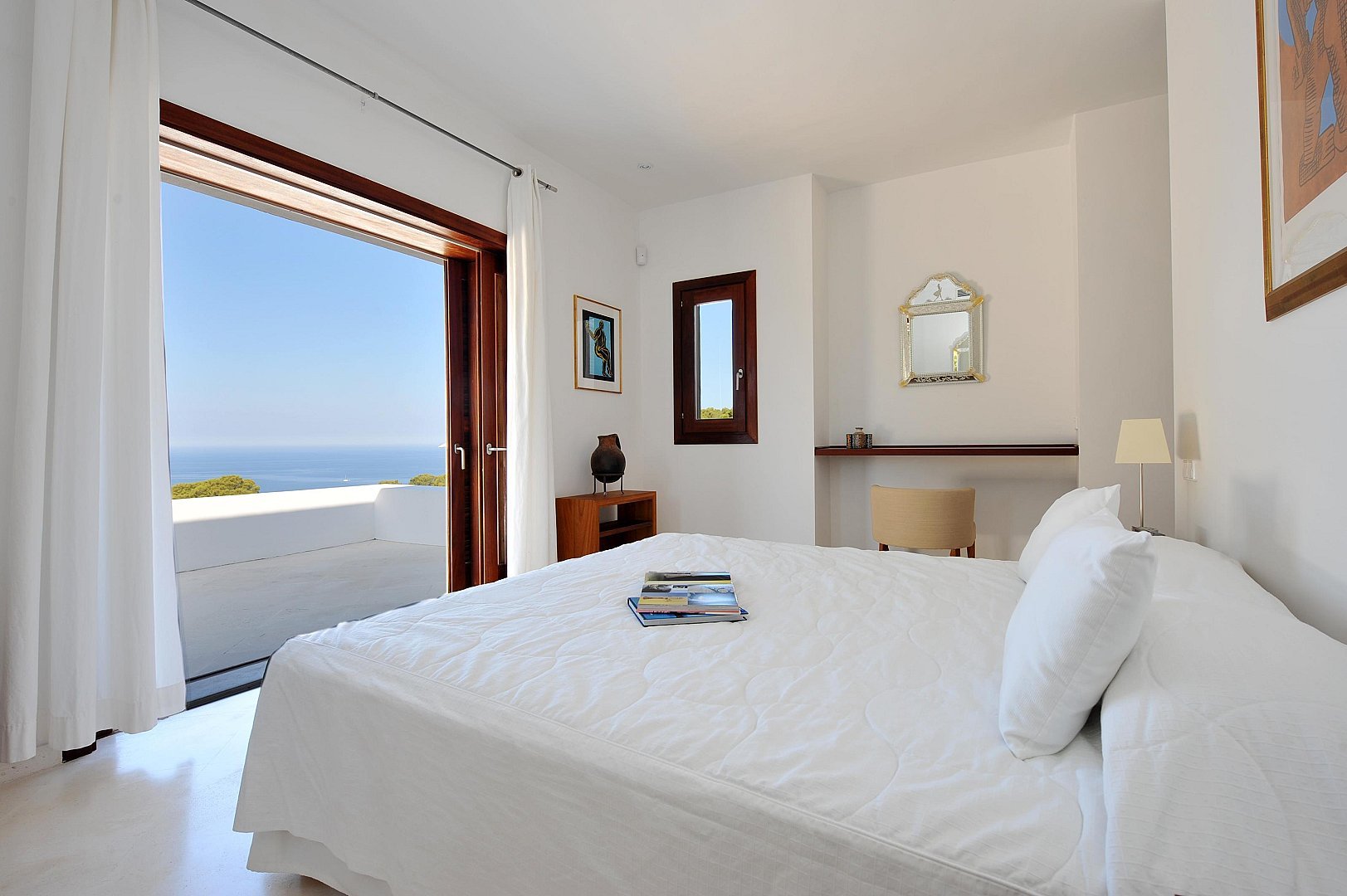 Esta impresionante propiedad está situada en las montañas cercanas a Cala Vadella. El pintoresco pueblo de San José con sus tiendas y restaurantes se encuentra a 10min en coche. La ciudad de Ibiza está a 25min conduciendo. La playa de Cala Vadella es ideal para familias y se encuentra a tán sólo 5min en coche.