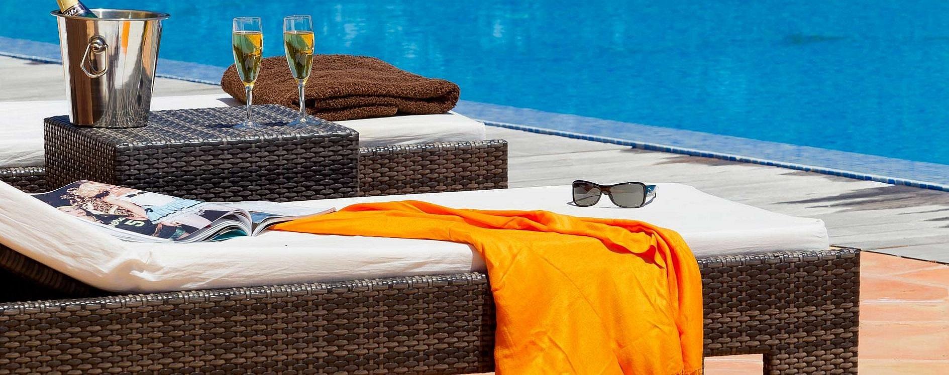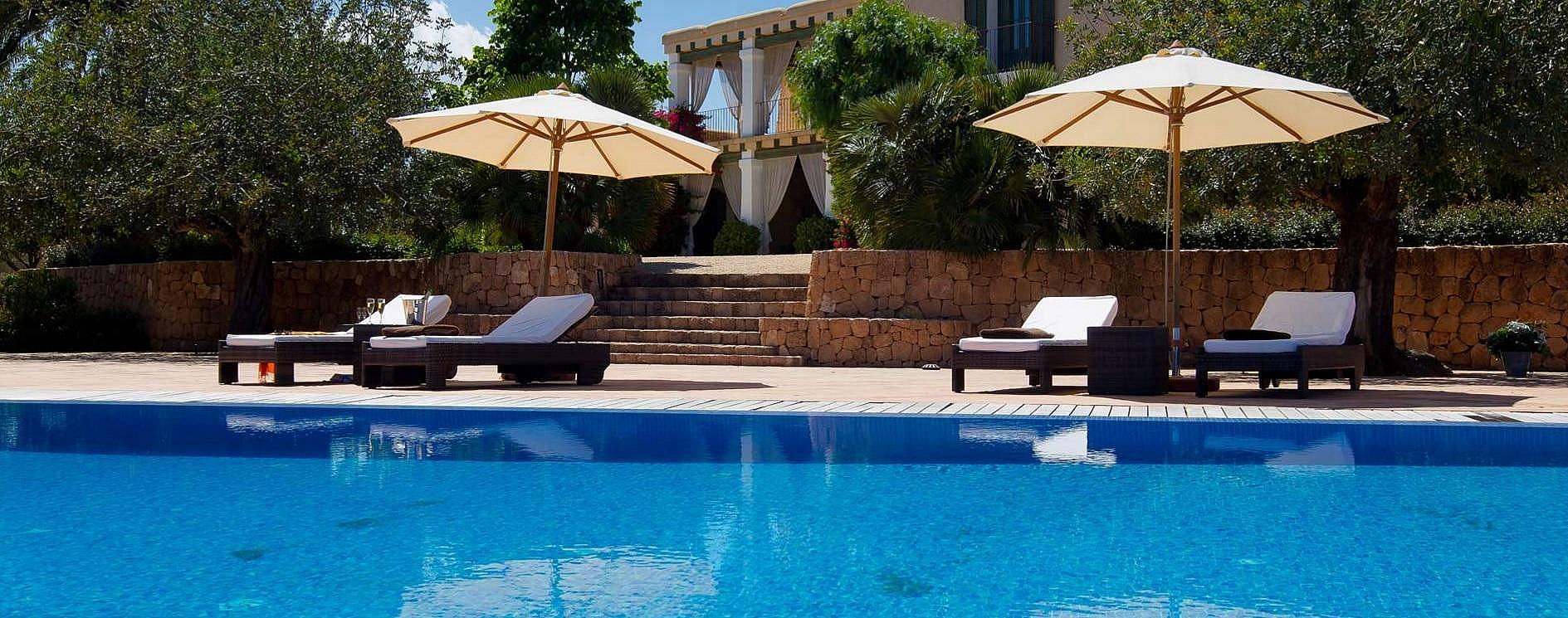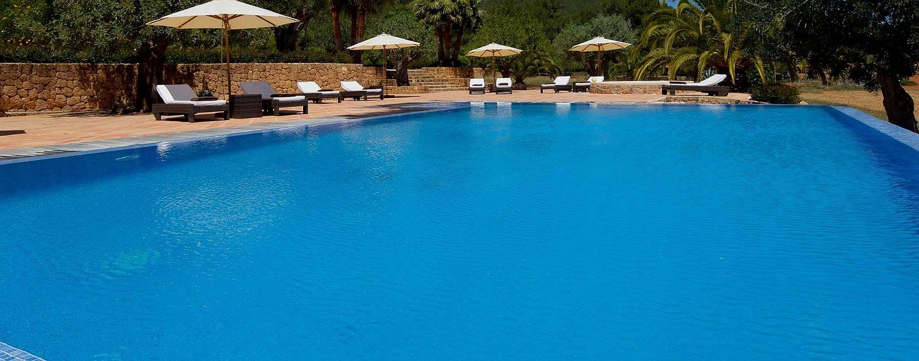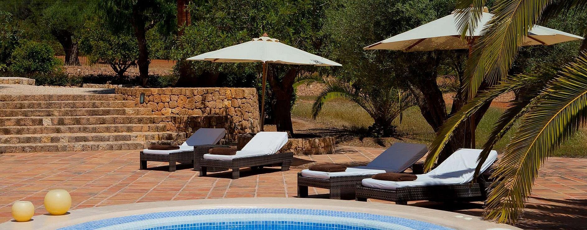 - Amplia zona junto a la piscina con tumbonas, sombrillas y muebles de exterior