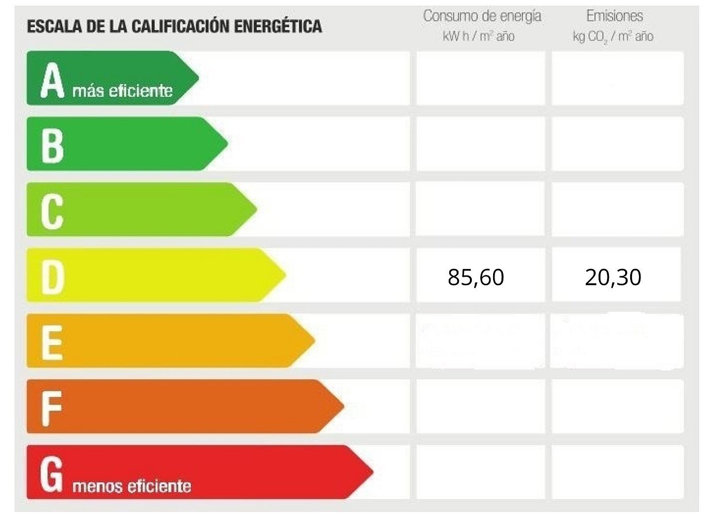Valor de consumo energético 85.6 kWh/(m2*a) · Emisiones CO2 20.3 kg/m2 · Escala de Emisiones de CO2 D · Tipo de calefacción Aire · Clase de eficiencia energética D