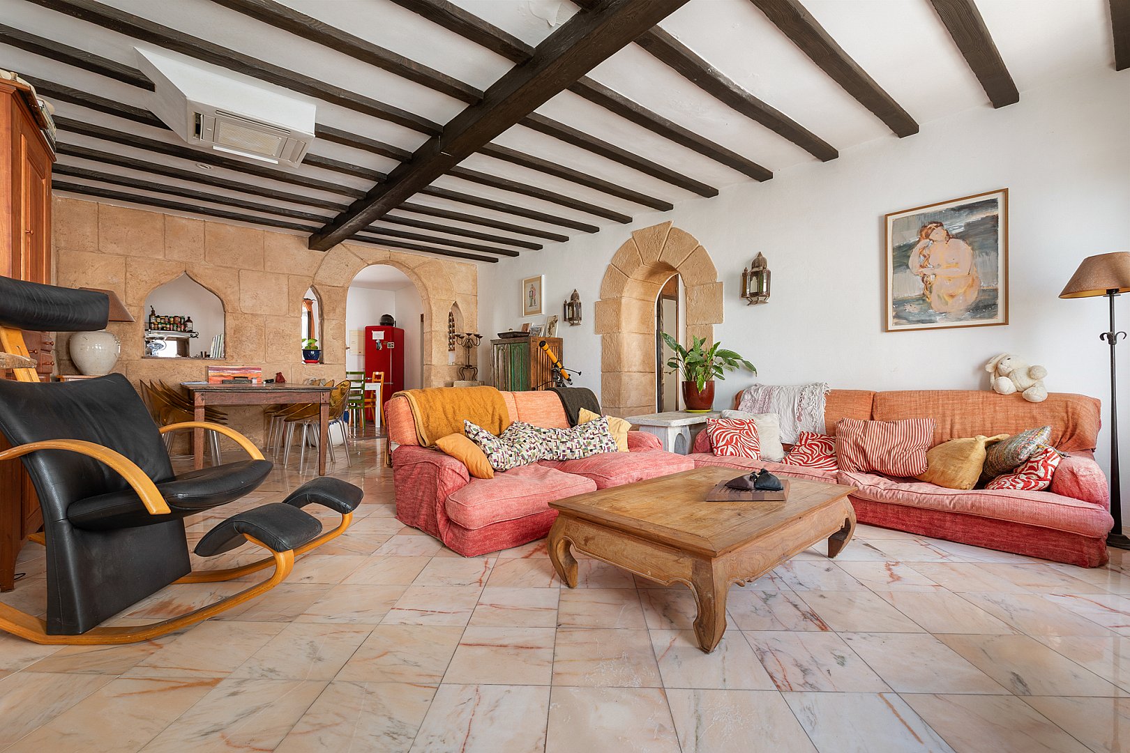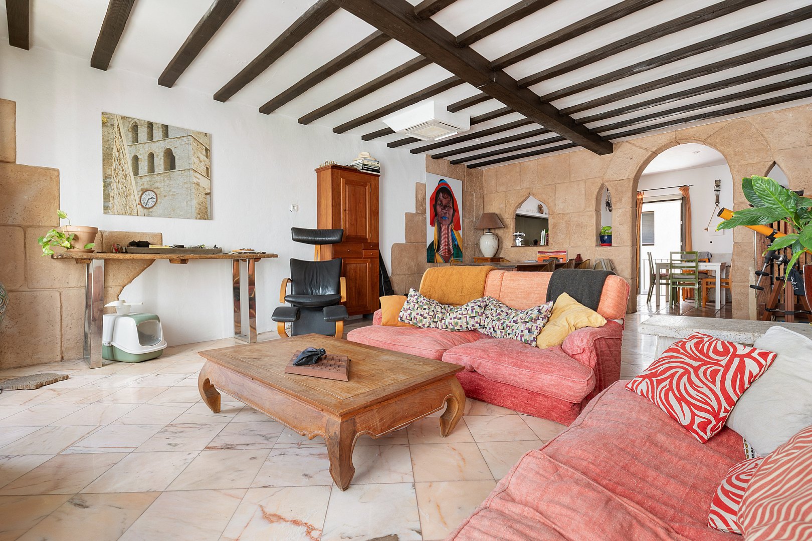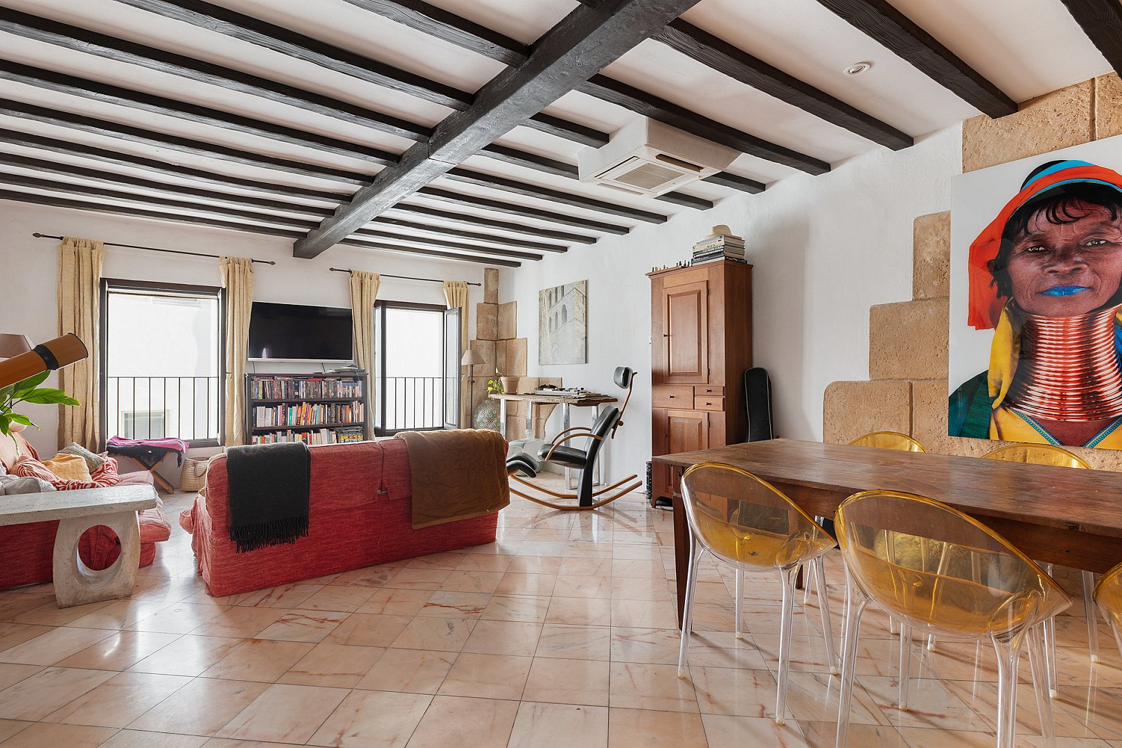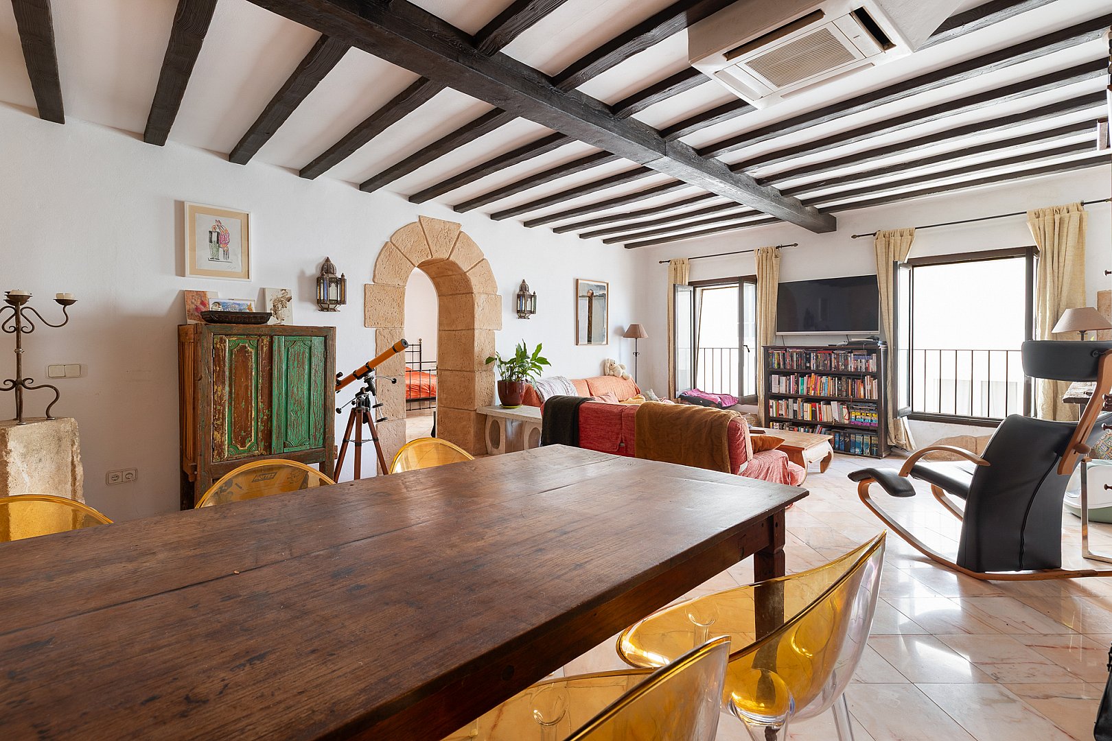 En el corazón de La Marina de Ibiza, este apartamento, bellamente presentado, ofrece tres estancias bien proporcionadas, incluidas dos habitaciones y dos baños, en un edificio con mucho carácter que data de 1920. Un refinado sentido del espacio y la luz define los interiores, donde el encanto atemporal se fusiona sin esfuerzo con una cómoda vida moderna. El apartamento está lleno de luz natural, lo que realza la sensación de amplitud en toda la vivienda. En su núcleo, una elegante cocina de planta abierta se integra perfectamente con la zona de estar, creando un espacio fluido y acogedor, perfecto tanto para la vida diaria como para recibir invitados. El salón es notablemente amplio y excepcionalmente cómodo, concebido como un lugar acogedor para relajarse, manteniendo a la vez una sofisticación discreta. Sobre él, los techos acabados en hermosa madera de sabina aportan calidez, textura y un distintivo carácter ibicenco que realza todo el espacio. La distribución está cuidadosamente pensada para una vida cotidiana sin esfuerzo, lo que lo convierte en un refugio ideal en la isla. La vivienda ofrece maravillosas vistas al puerto y al mar: un entorno idílico para disfrutar del estilo de vida mediterráneo, desde mañanas tranquilas hasta atardeceres. Con su procedencia clásica y su estado impecable, la vivienda ofrece un lujo discreto en un enclave muy codiciado. Una oportunidad excepcional de adquirir una residencia en Ibiza donde patrimonio, confort y estilo se unen en perfecto equilibrio, lista para disfrutar desde el momento en que llegas.