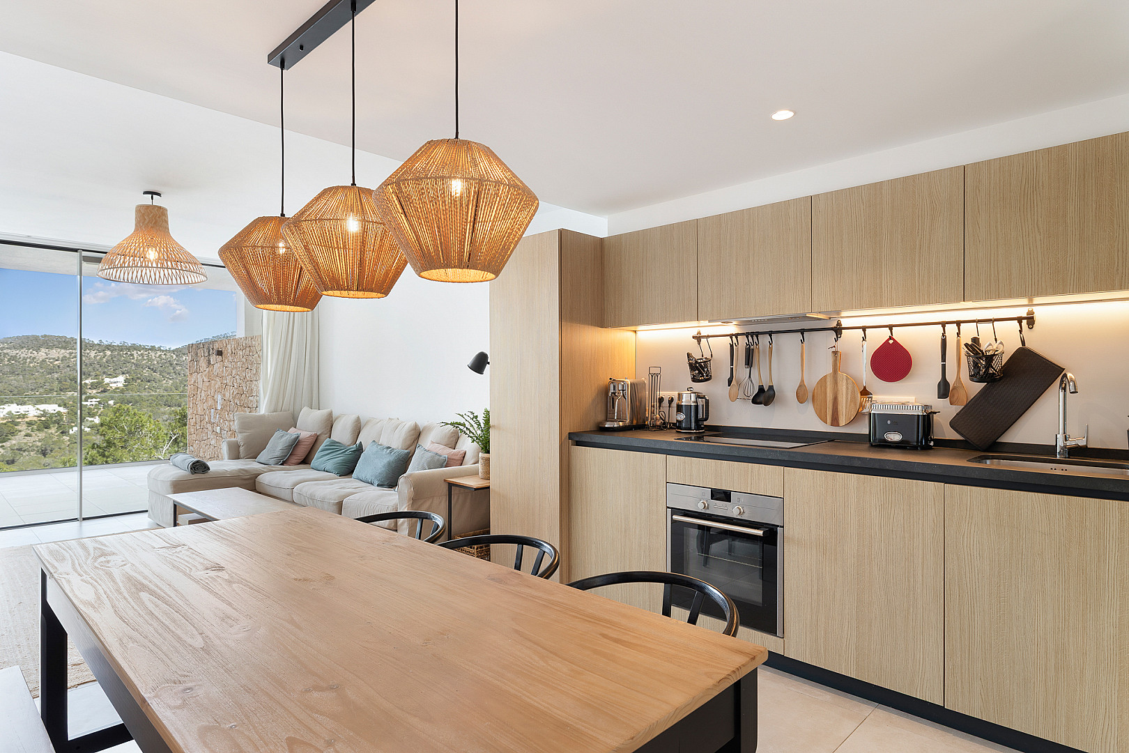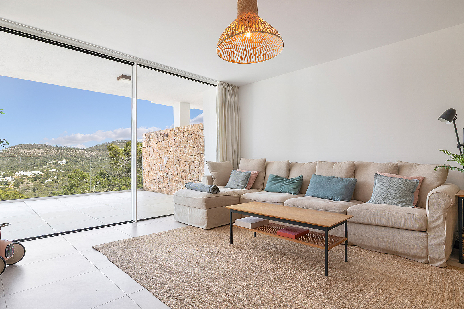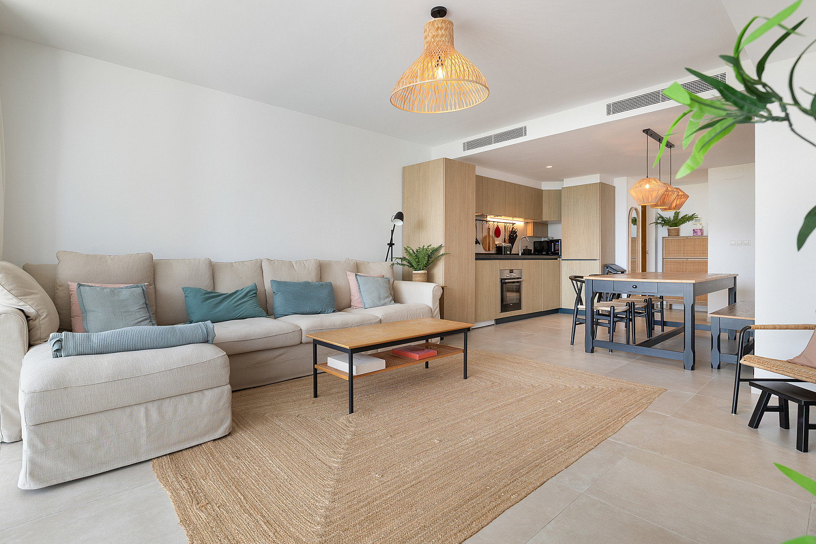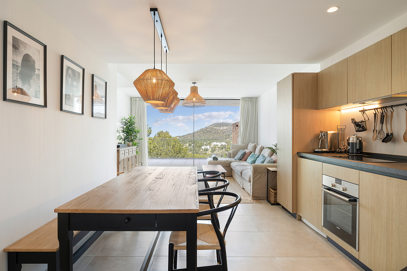 Este apartamento de nueva construcción ha sido acabado con los más altos estándares que ofrece la construcción en Ibiza. Cuenta con un amplio dormitorio principal con espacio suficiente para un armario y un cuarto de baño en suite. Un segundo dormitorio, con su propia terraza privada, se complementa con un cuarto de baño adicional para invitados. La zona diáfana de cocina, comedor y salón crea un espacio acogedor, perfecto para disfrutar de momentos agradables con amigos y familiares. Una gran terraza con vistas parciales al mar y panorámicas ofrece el escenario ideal para relajarse al aire libre y disfrutar de la refrescante brisa veraniega. La propiedad también incluye una plaza de garaje totalmente cubierta y un trastero privado. Una de las características más destacadas de esta comunidad es su excepcional gama de servicios. Los residentes pueden disfrutar de una piscina exterior abierta todo el año, un gimnasio totalmente equipado, vestuarios con duchas, así como una zona de sauna y jacuzzi.