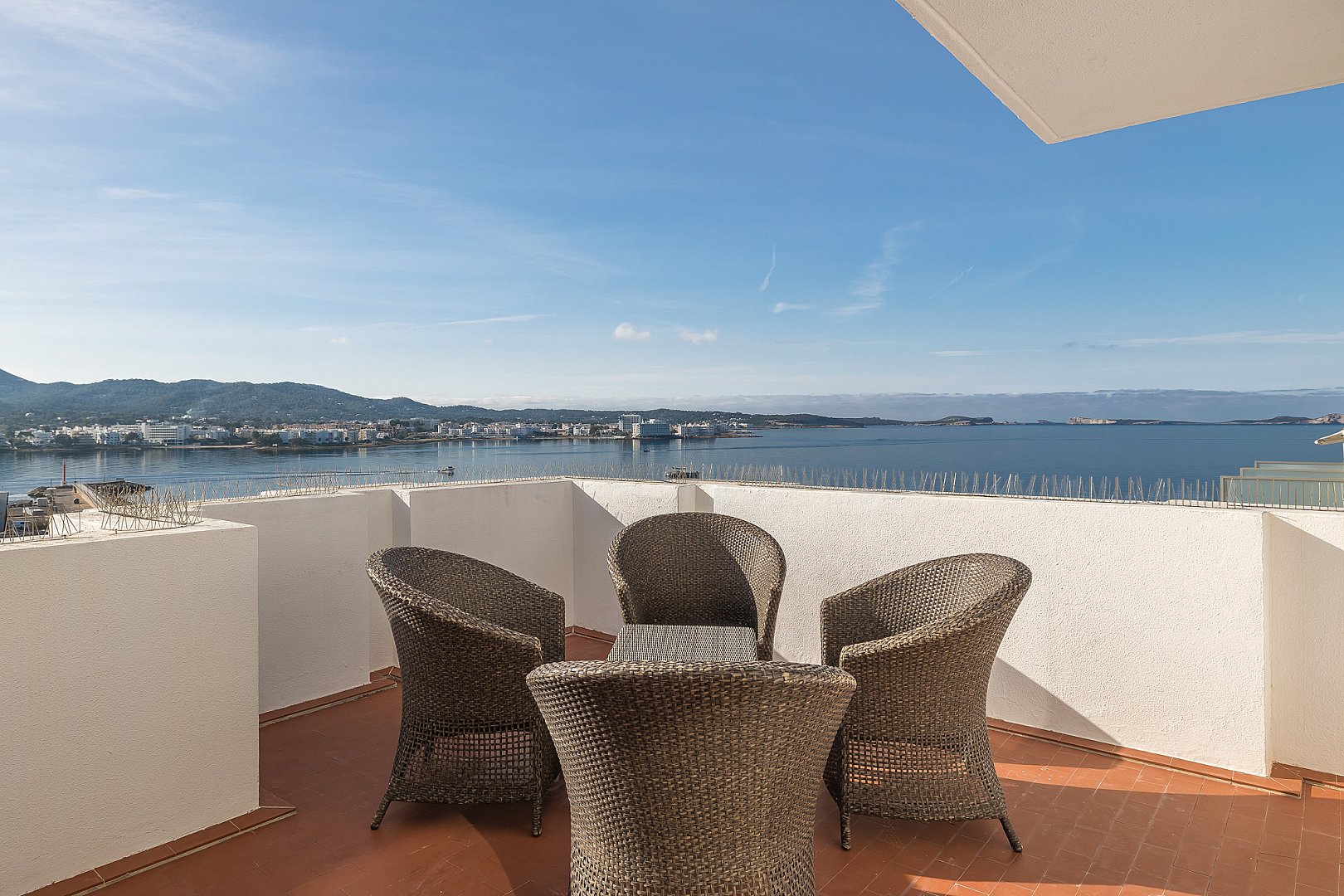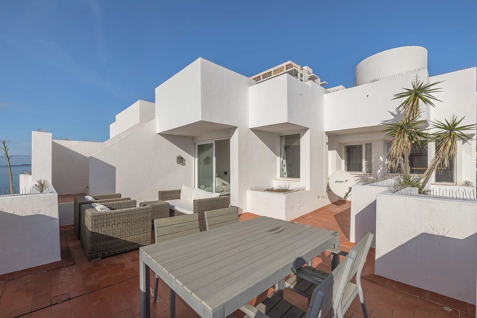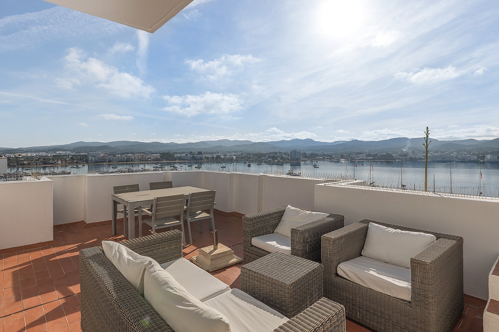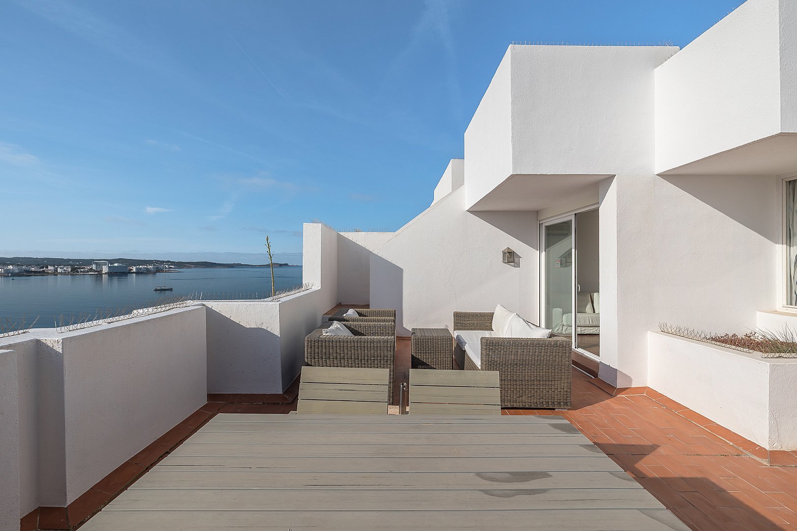 Este excepcional ático es el resultado de la fusión perfecta de dos apartamentos en una amplia residencia, ocupando el último piso del edificio. Situado directamente frente a la Bahía de San Antonio, la propiedad disfruta de vistas ininterrumpidas y luz solar durante todo el día, creando un ambiente de vida luminoso y estimulante desde la mañana hasta la noche. El interior ofrece un diseño bien equilibrado con dos salas de estar, tres dormitorios de generoso tamaño y dos baños modernos, diseñados para combinar comodidad con funcionalidad. Cada espacio se siente abierto y acogedor, realzado por la luz natural que fluye a través del apartamento gracias a su orientación privilegiada. Sin embargo, lo que realmente distingue a este ático es su extraordinario espacio exterior. La propiedad cuenta con una terraza notablemente grande que se extiende a lo largo de dos niveles, ofreciendo infinitas posibilidades para la vida al aire libre. Ya sea para tomar el sol, entretener a los invitados, cenar bajo el cielo abierto o simplemente relajarse mientras se contempla la bahía, esta terraza de múltiples niveles transforma la vivienda en un retiro urbano privado y la eleva a una oferta rara y muy deseable.