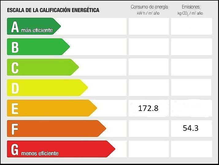 Año de construcción 2009 · Valor de consumo energético 172.8 kWh/(m2*a) · Emisiones CO2 54.3 kg/m2 · Escala de Emisiones de CO2 F · Clase de eficiencia energética E