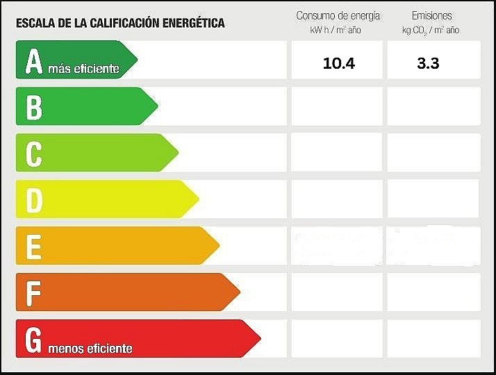Año de construcción 2023 · Valor de consumo energético 10.4 kWh/(m2*a) · Emisiones CO2 3.3 kg/m2 · Escala de Emisiones de CO2 A · Clase de eficiencia energética A