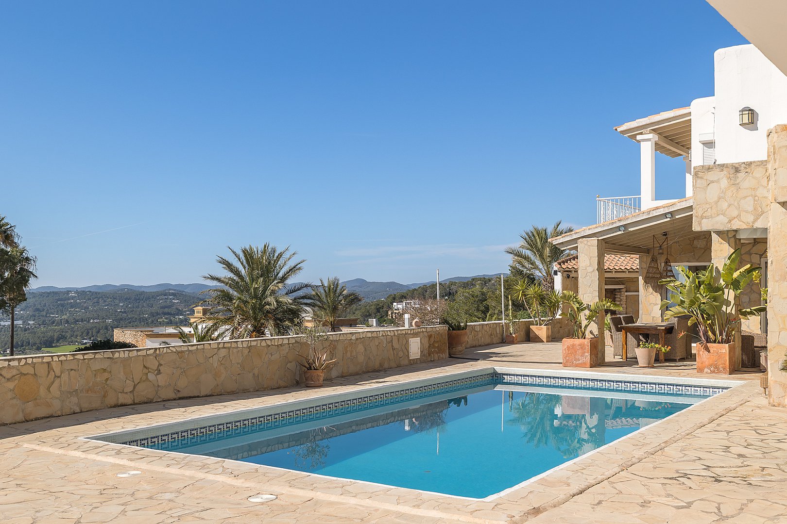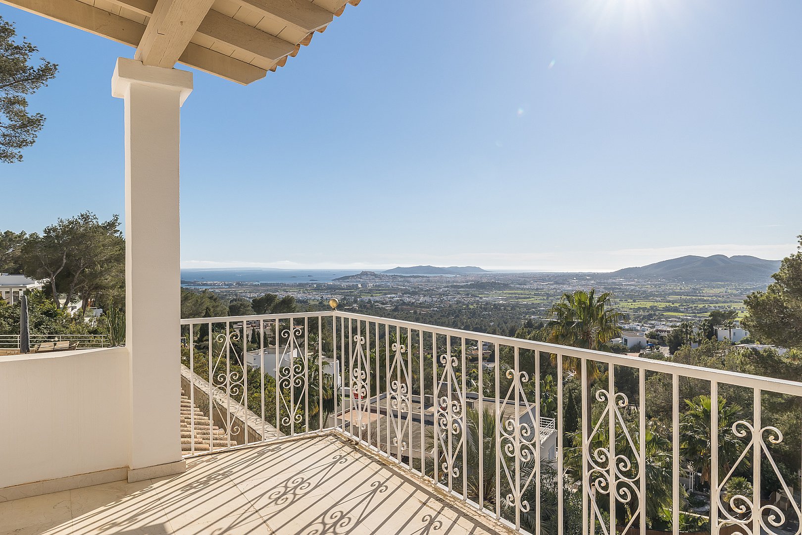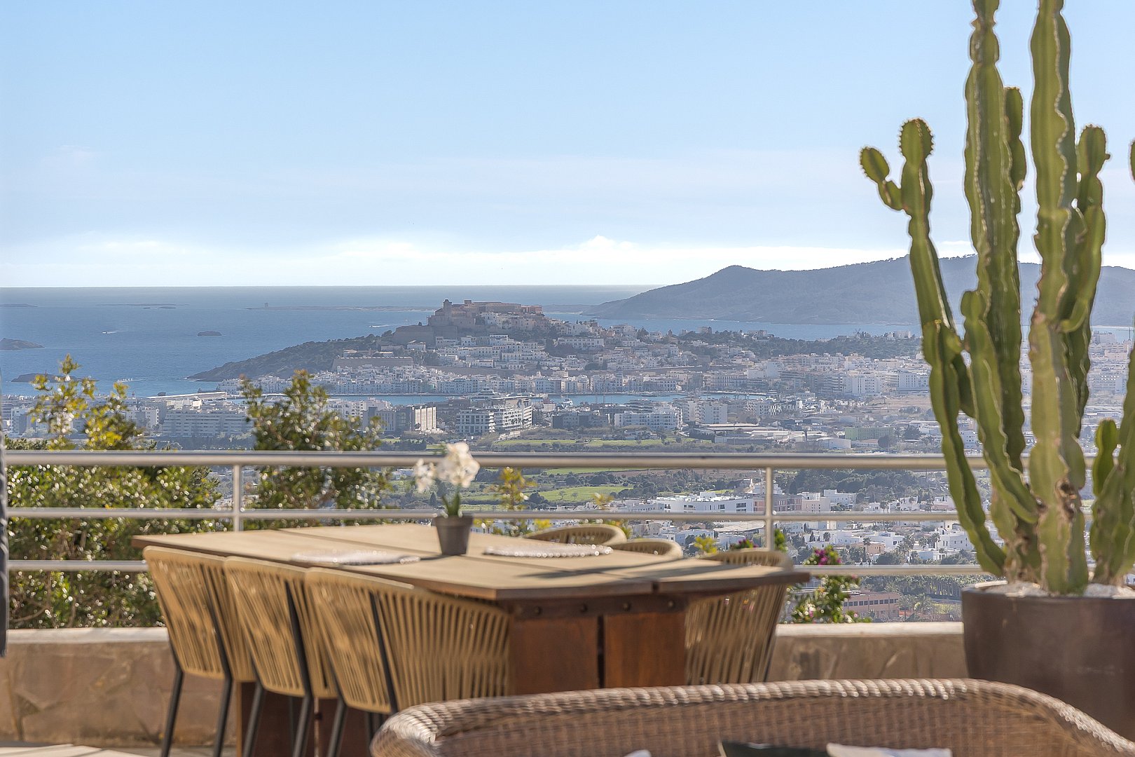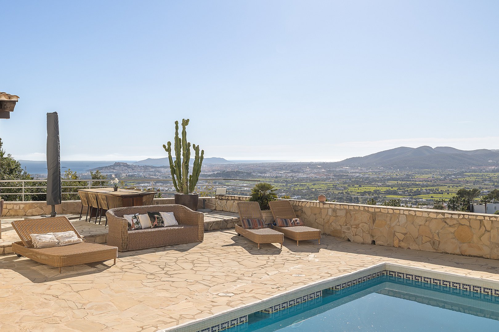 En la urbanización privada y vigilada de Can Furnet, situada en uno de los puntos más altos del complejo, se encuentra esta villa con una ubicación panorámica excepcional. Desde aquí se disfruta de una vista panorámica de 360 grados sin obstáculos sobre las colinas circundantes, el casco histórico de Dalt Vila, el mar Mediterráneo y la isla de Formentera. La ubicación combina privacidad con la proximidad a la ciudad de Ibiza y a los principales puntos de interés de la isla. La arquitectura de la propiedad se basa en un concepto de distribución funcional con varias áreas independientes. La vivienda se divide en dos unidades principales y se complementa con un estudio independiente y un apartamento de invitados totalmente equipado. Esto hace que la villa sea adecuada tanto para familias numerosas como para alojar invitados o personal. La planta superior está dedicada completamente a la suite principal. Incluye un amplio vestidor, un baño con jacuzzi y vistas a las montañas, así como una zona privada de spa con hammam. En total, la villa dispone de seis dormitorios, cada uno con su propio baño. La zona exterior está dominada por una amplia área de piscina con varias terrazas. Estas ofrecen diferentes espacios para tomar el sol, relajarse o disfrutar de comidas al aire libre. Desde la mayoría de las zonas se puede disfrutar de vistas al paisaje y al mar. La propiedad ofrece una base constructiva sólida y potencial para una modernización personalizada. Gracias a su ubicación especial y a su generosa distribución, puede convertirse en una residencia de alto nivel en una de las zonas residenciales más demandadas de Ibiza.