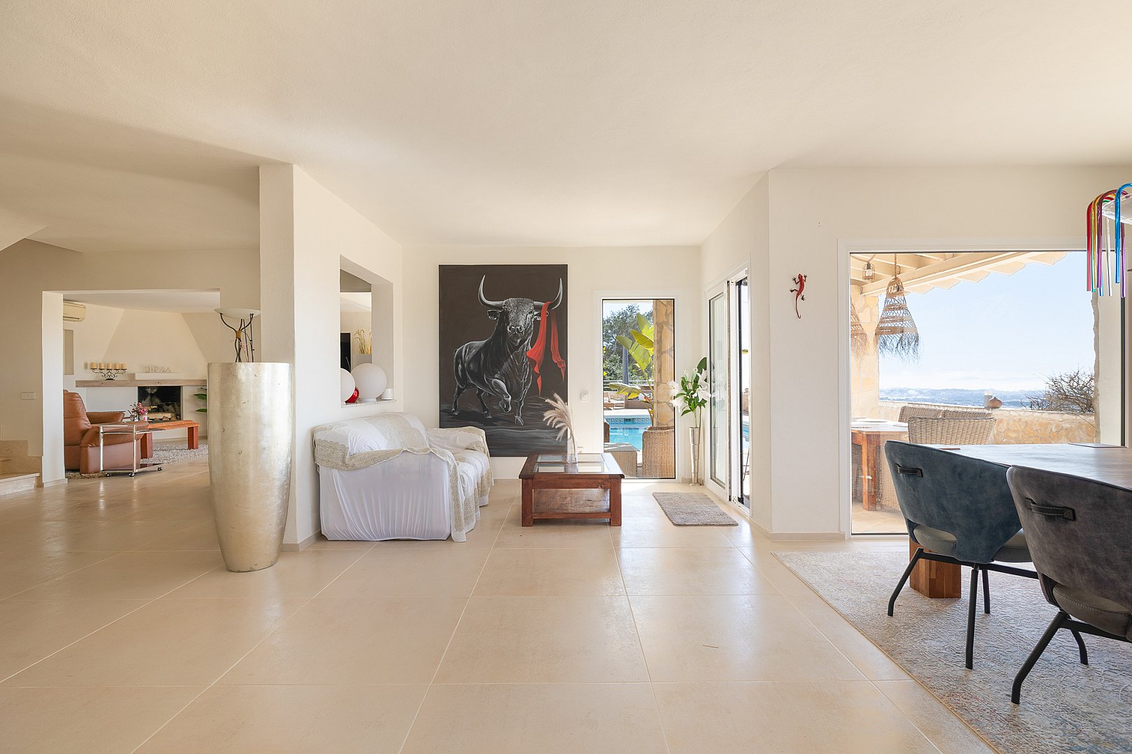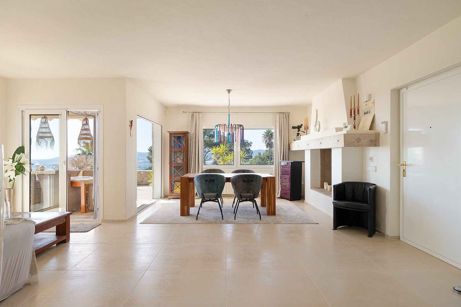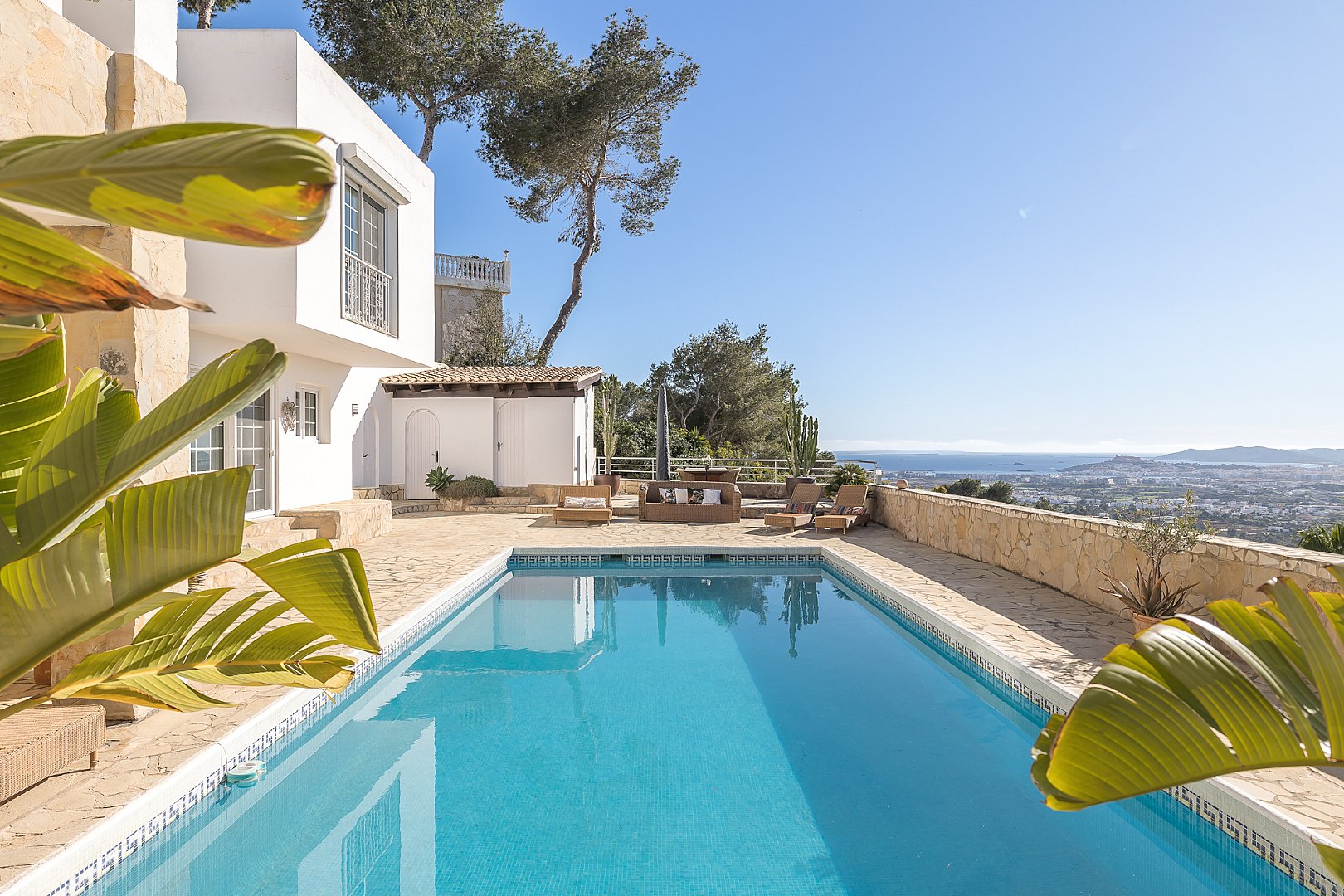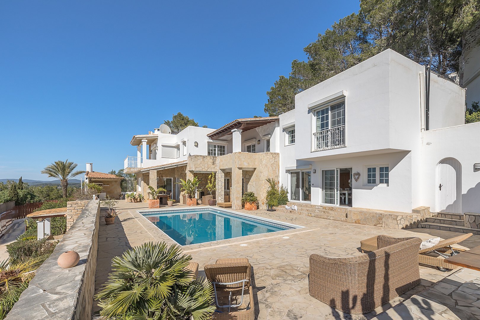 En la urbanización privada y vigilada de Can Furnet, situada en uno de los puntos más altos del complejo, se encuentra esta villa con una ubicación panorámica excepcional. Desde aquí se disfruta de una vista panorámica de 360 grados sin obstáculos sobre las colinas circundantes, el casco histórico de Dalt Vila, el mar Mediterráneo y la isla de Formentera. La ubicación combina privacidad con la proximidad a la ciudad de Ibiza y a los principales puntos de interés de la isla. La arquitectura de la propiedad se basa en un concepto de distribución funcional con varias áreas independientes. La vivienda se divide en dos unidades principales y se complementa con un estudio independiente y un apartamento de invitados totalmente equipado. Esto hace que la villa sea adecuada tanto para familias numerosas como para alojar invitados o personal. La planta superior está dedicada completamente a la suite principal. Incluye un amplio vestidor, un baño con jacuzzi y vistas a las montañas, así como una zona privada de spa con hammam. En total, la villa dispone de seis dormitorios, cada uno con su propio baño. La zona exterior está dominada por una amplia área de piscina con varias terrazas. Estas ofrecen diferentes espacios para tomar el sol, relajarse o disfrutar de comidas al aire libre. Desde la mayoría de las zonas se puede disfrutar de vistas al paisaje y al mar. La propiedad ofrece una base constructiva sólida y potencial para una modernización personalizada. Gracias a su ubicación especial y a su generosa distribución, puede convertirse en una residencia de alto nivel en una de las zonas residenciales más demandadas de Ibiza.