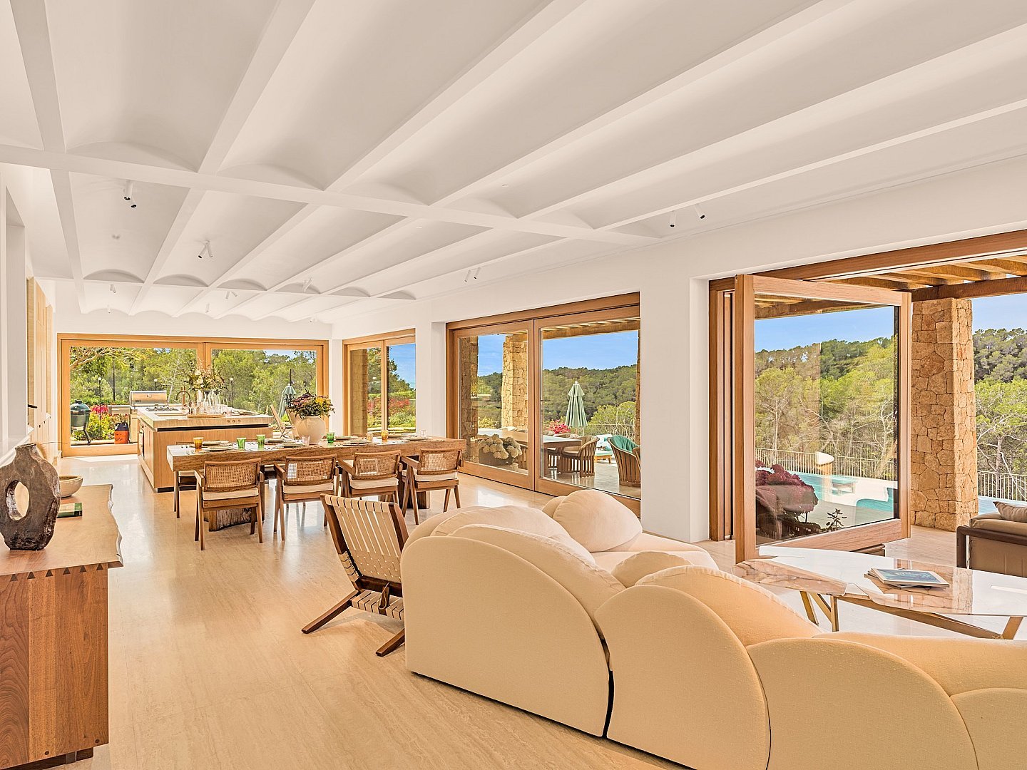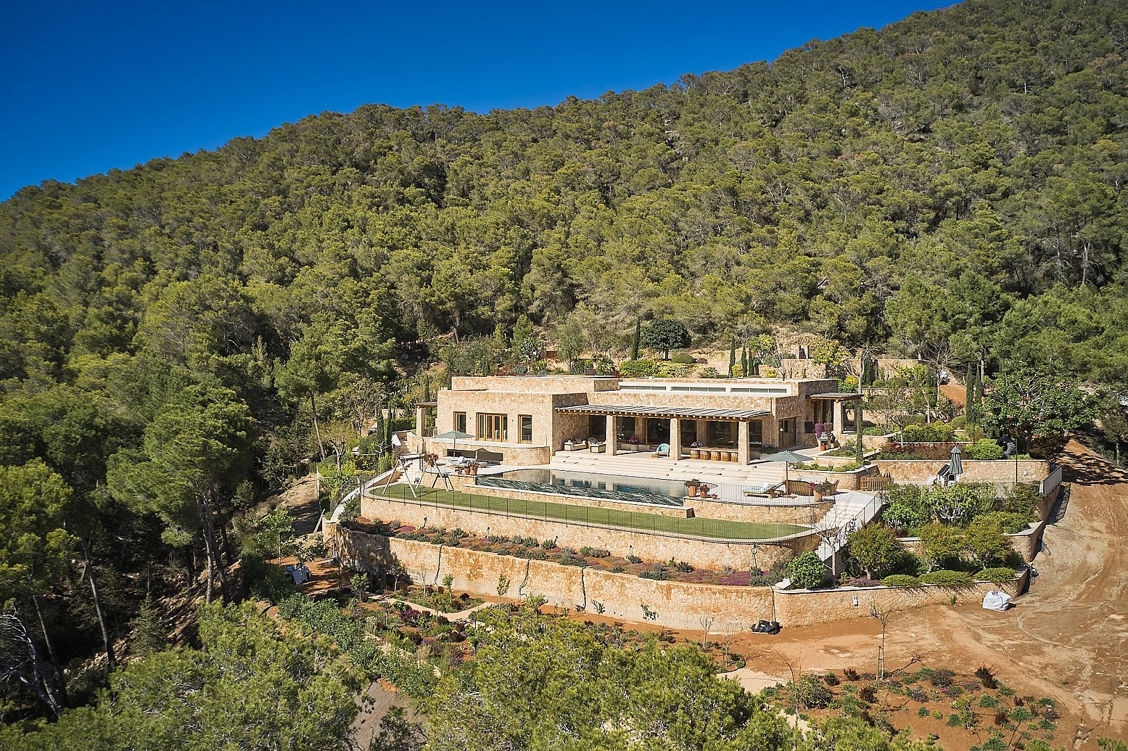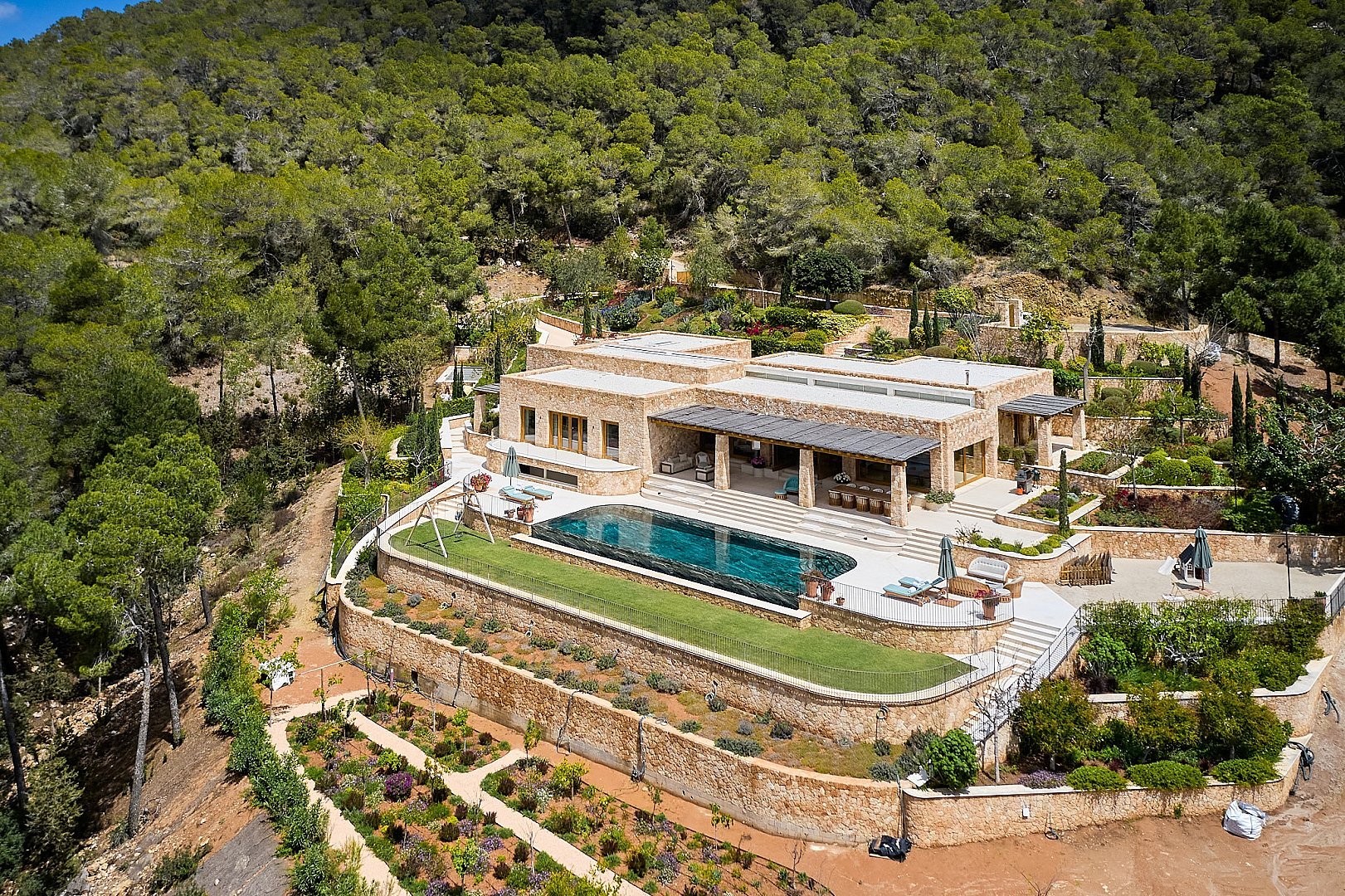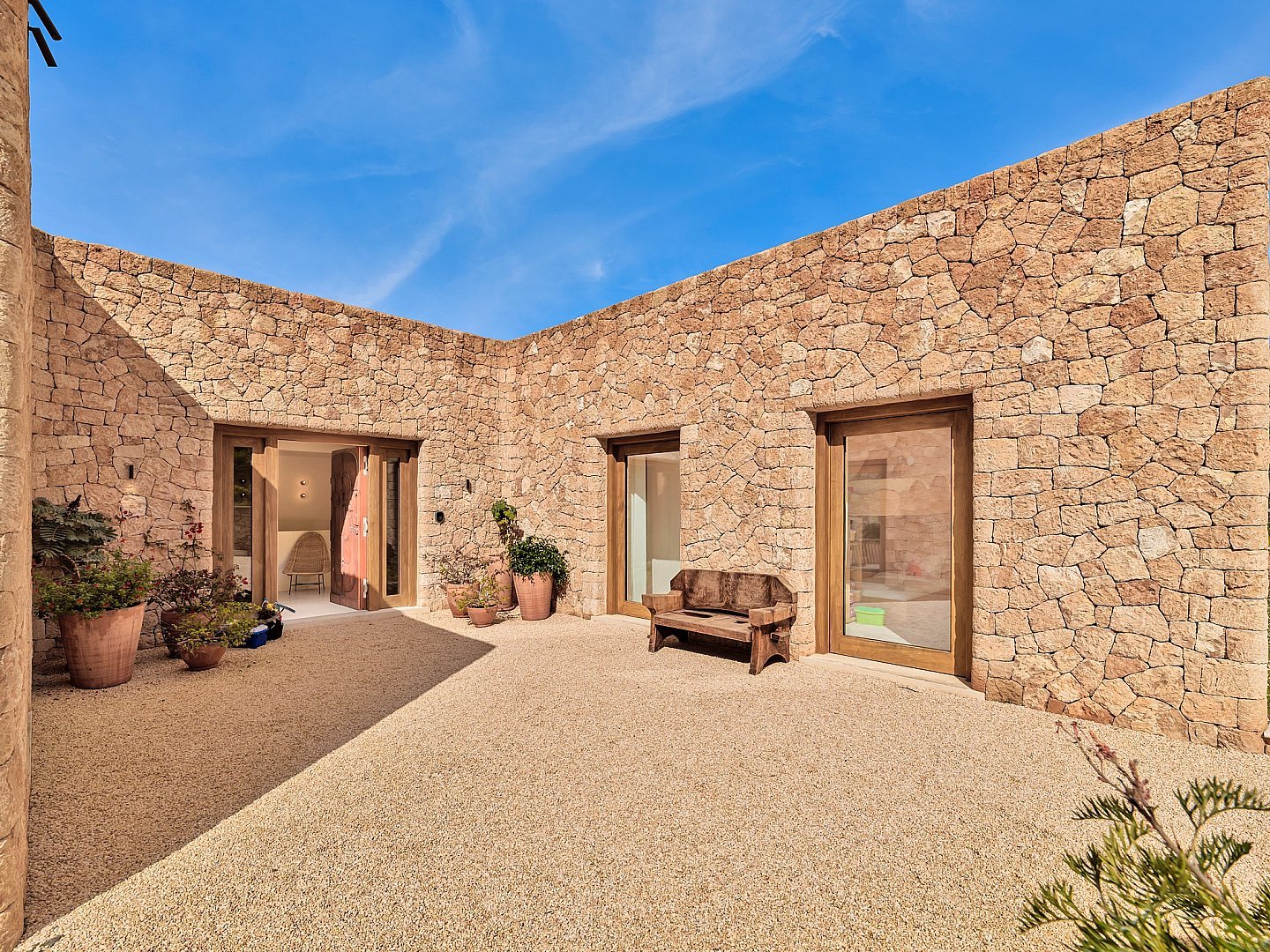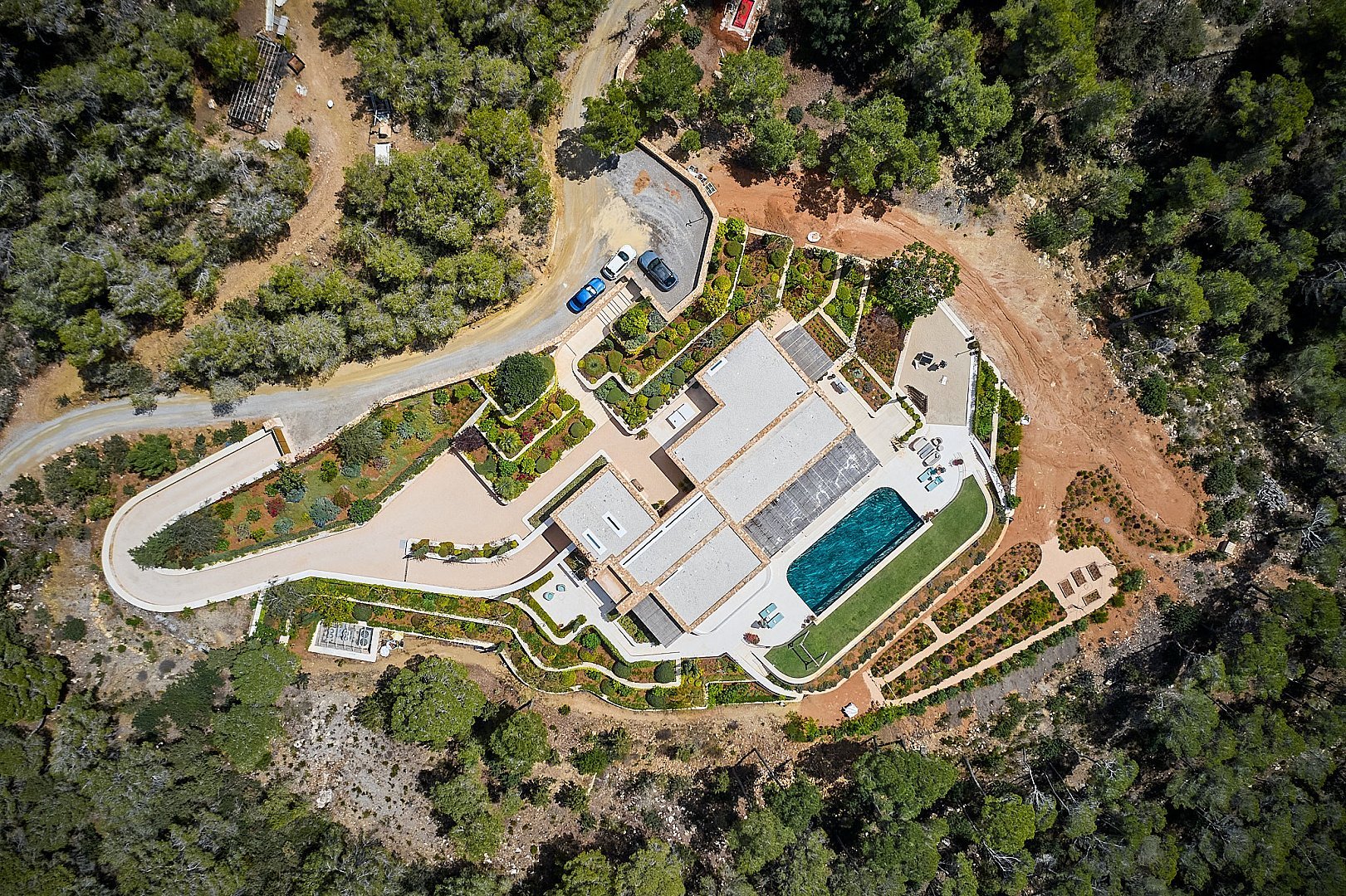 A pocos pasos de Cala Mastella y cerca del tradicional pueblo de San Carlos, esta casa está situada en una gran parcela de terreno con vistas lejanas al mar. La propiedad está en perfecta armonía con el paisaje circundante. La forma en que la casa ha sido construida, utilizando el diseño y la arquitectura tradicional con una sutil mezcla de elementos contemporáneos, es única. A través de la enorme puerta se entra en el luminoso nivel principal de la casa, con sus techos altos y curvados que hacen referencia a los métodos de construcción tradicionales y también ofrece claraboyas ocultas para traer el sol mediterráneo directamente a la casa. Aquí se encuentra el enorme salón en dos niveles, una cocina abierta y a medida construida con materiales de la más alta calidad, que ofrece una elegante mezcla de travertino romano, roble natural y bronce de cañón. Grandes puertas automáticas de cristal conducen a la terraza, que ofrece un amplio espacio para una zona chill-out, así como una zona de comedor al aire libre. Los escalones que conducen de la terraza a la piscina están bien pensados para ofrecer otra opción para sentarse o tumbarse y disfrutar del sol de Ibiza, junto a la llamativa piscina climatizada de mármol Lapponia Verde. Un completo sistema de sonido proporciona la experiencia musical perfecta dentro y fuera de la casa. Hay seis dormitorios en total, todos ellos construidos con materiales de primera calidad. Dos de ellos son master suites con vestidores y cada uno con su propia terraza privada. La propiedad dispone de aire acondicionado y calefacción por suelo radiante. Hay un garaje enorme, que ofrece espacio para varios coches, un sistema de seguridad completo y un control de cámaras de 360 grados. Con la finalización de la casa en 2023, han creado una obra maestra arquitectónica donde la esencia de la isla se puede sentir en las fachadas.