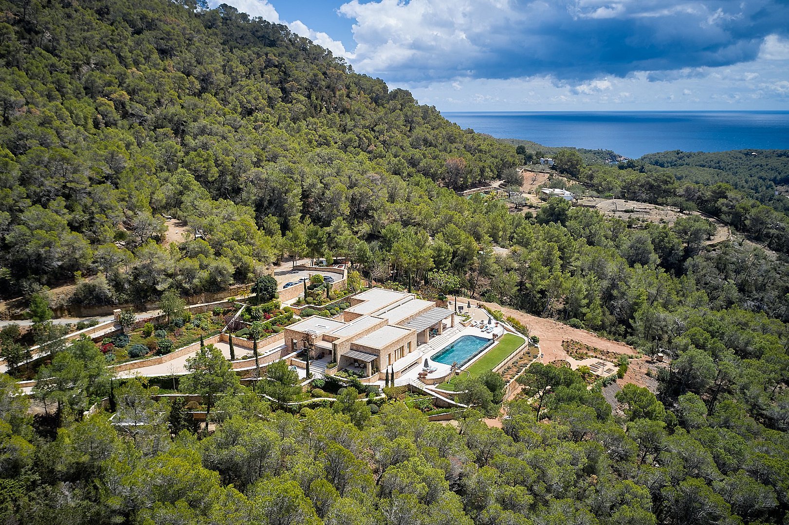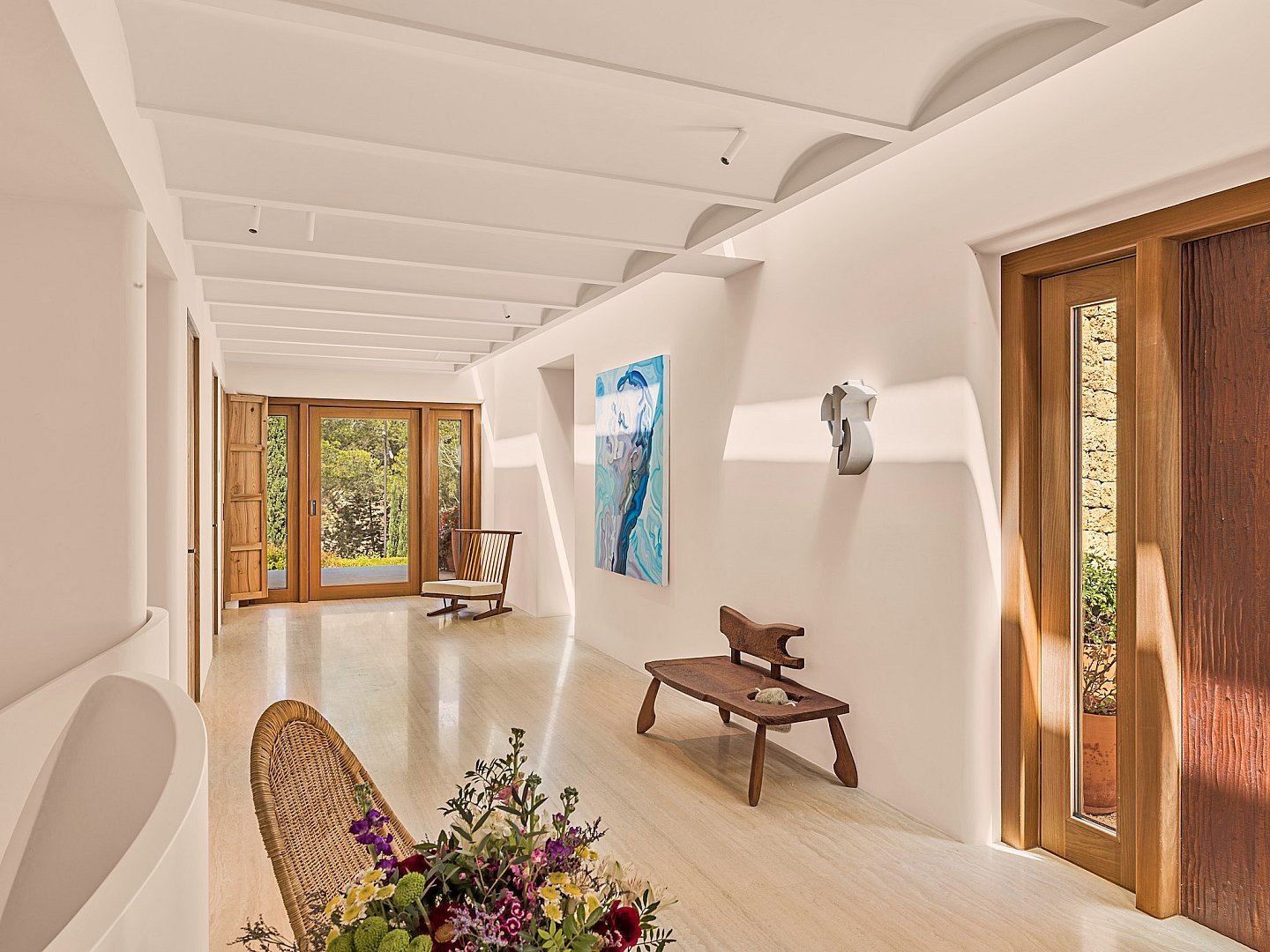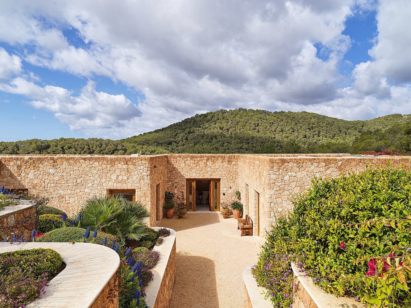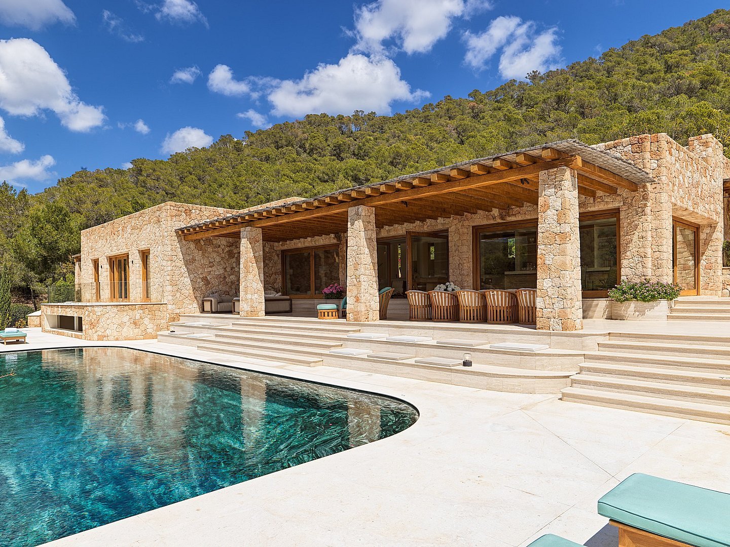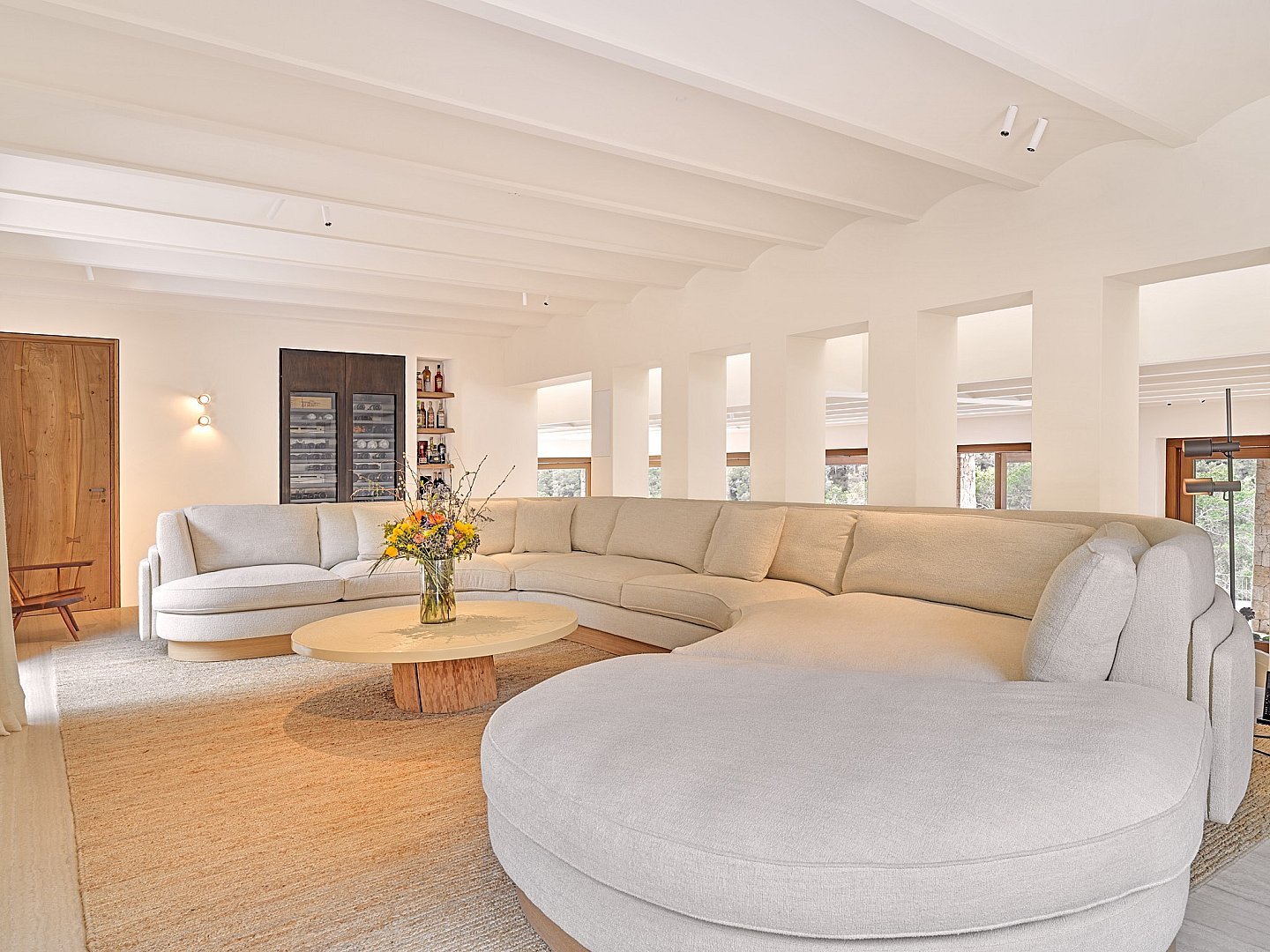 A pocos pasos de Cala Mastella y cerca del tradicional pueblo de San Carlos, esta casa está situada en una gran parcela de terreno con vistas lejanas al mar. La propiedad está en perfecta armonía con el paisaje circundante. La forma en que la casa ha sido construida, utilizando el diseño y la arquitectura tradicional con una sutil mezcla de elementos contemporáneos, es única. A través de la enorme puerta se entra en el luminoso nivel principal de la casa, con sus techos altos y curvados que hacen referencia a los métodos de construcción tradicionales y también ofrece claraboyas ocultas para traer el sol mediterráneo directamente a la casa. Aquí se encuentra el enorme salón en dos niveles, una cocina abierta y a medida construida con materiales de la más alta calidad, que ofrece una elegante mezcla de travertino romano, roble natural y bronce de cañón. Grandes puertas automáticas de cristal conducen a la terraza, que ofrece un amplio espacio para una zona chill-out, así como una zona de comedor al aire libre. Los escalones que conducen de la terraza a la piscina están bien pensados para ofrecer otra opción para sentarse o tumbarse y disfrutar del sol de Ibiza, junto a la llamativa piscina climatizada de mármol Lapponia Verde. Un completo sistema de sonido proporciona la experiencia musical perfecta dentro y fuera de la casa. Hay seis dormitorios en total, todos ellos construidos con materiales de primera calidad. Dos de ellos son master suites con vestidores y cada uno con su propia terraza privada. La propiedad dispone de aire acondicionado y calefacción por suelo radiante. Hay un garaje enorme, que ofrece espacio para varios coches, un sistema de seguridad completo y un control de cámaras de 360 grados. Con la finalización de la casa en 2023, han creado una obra maestra arquitectónica donde la esencia de la isla se puede sentir en las fachadas.