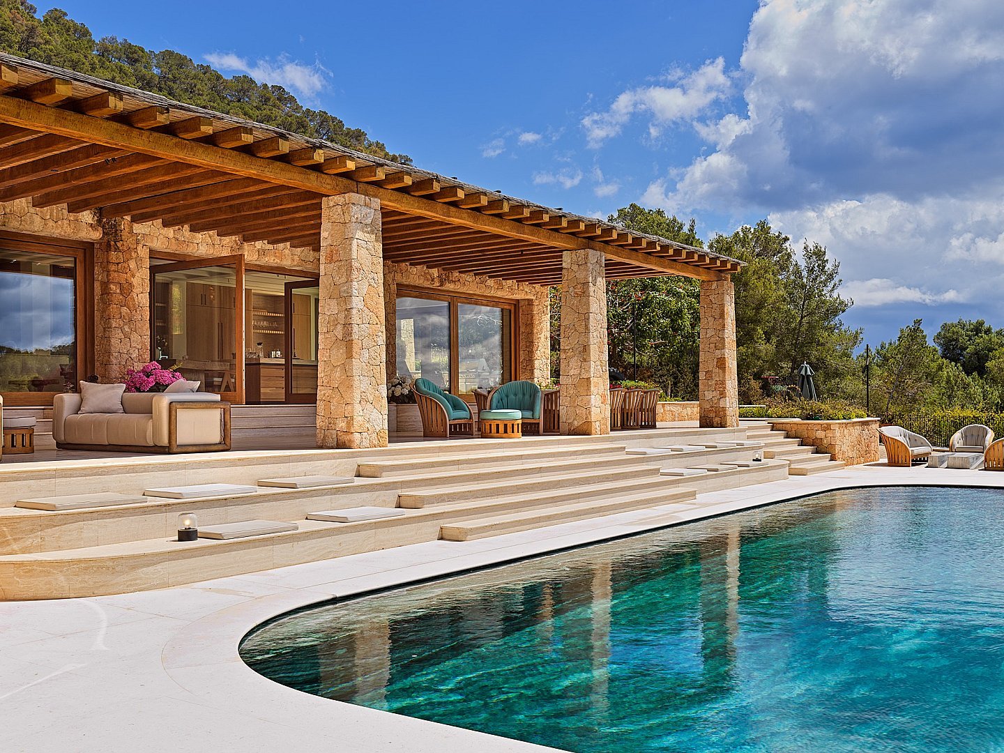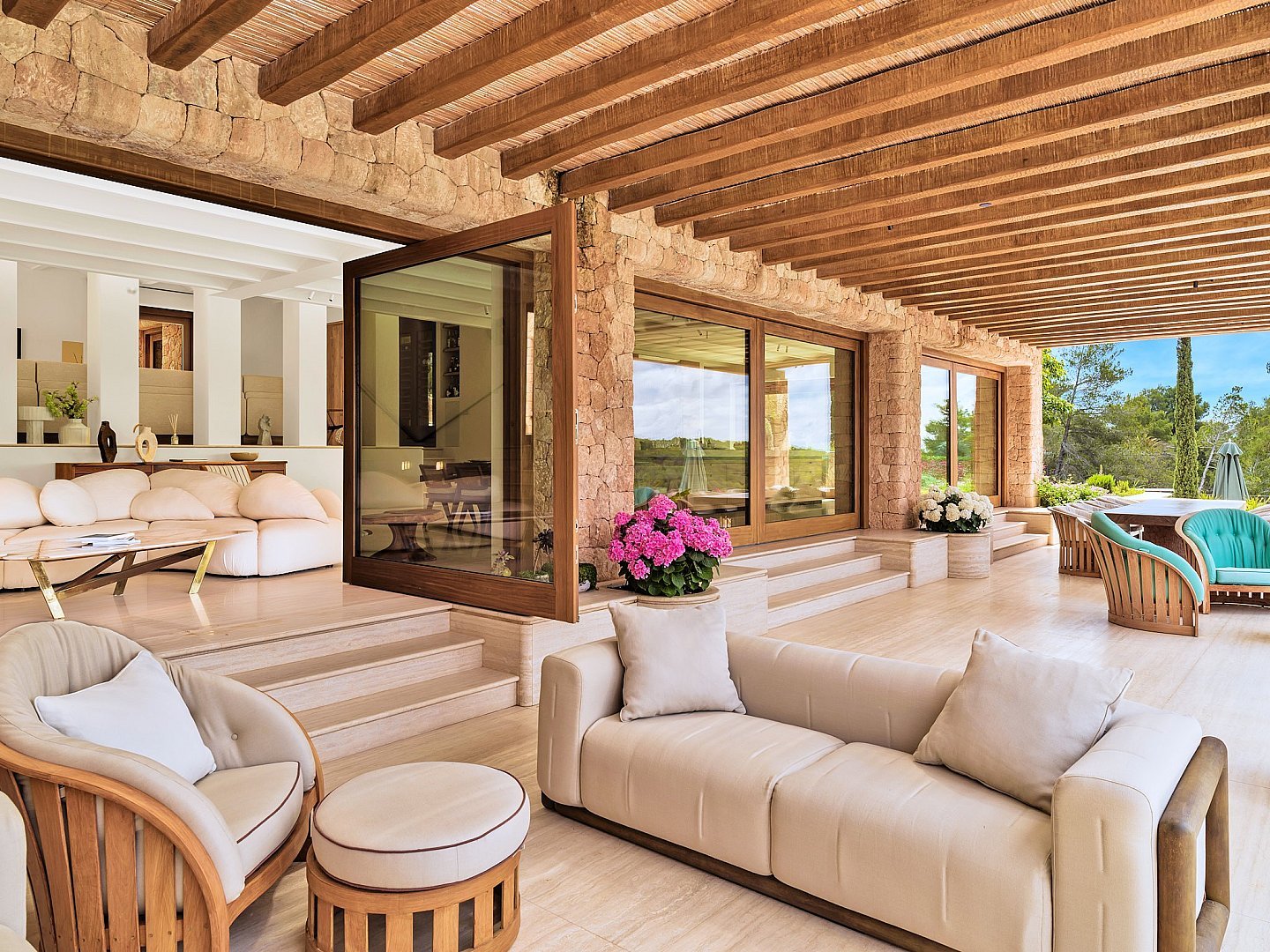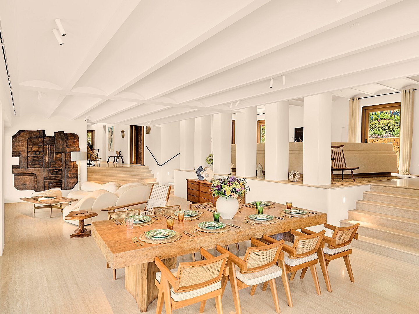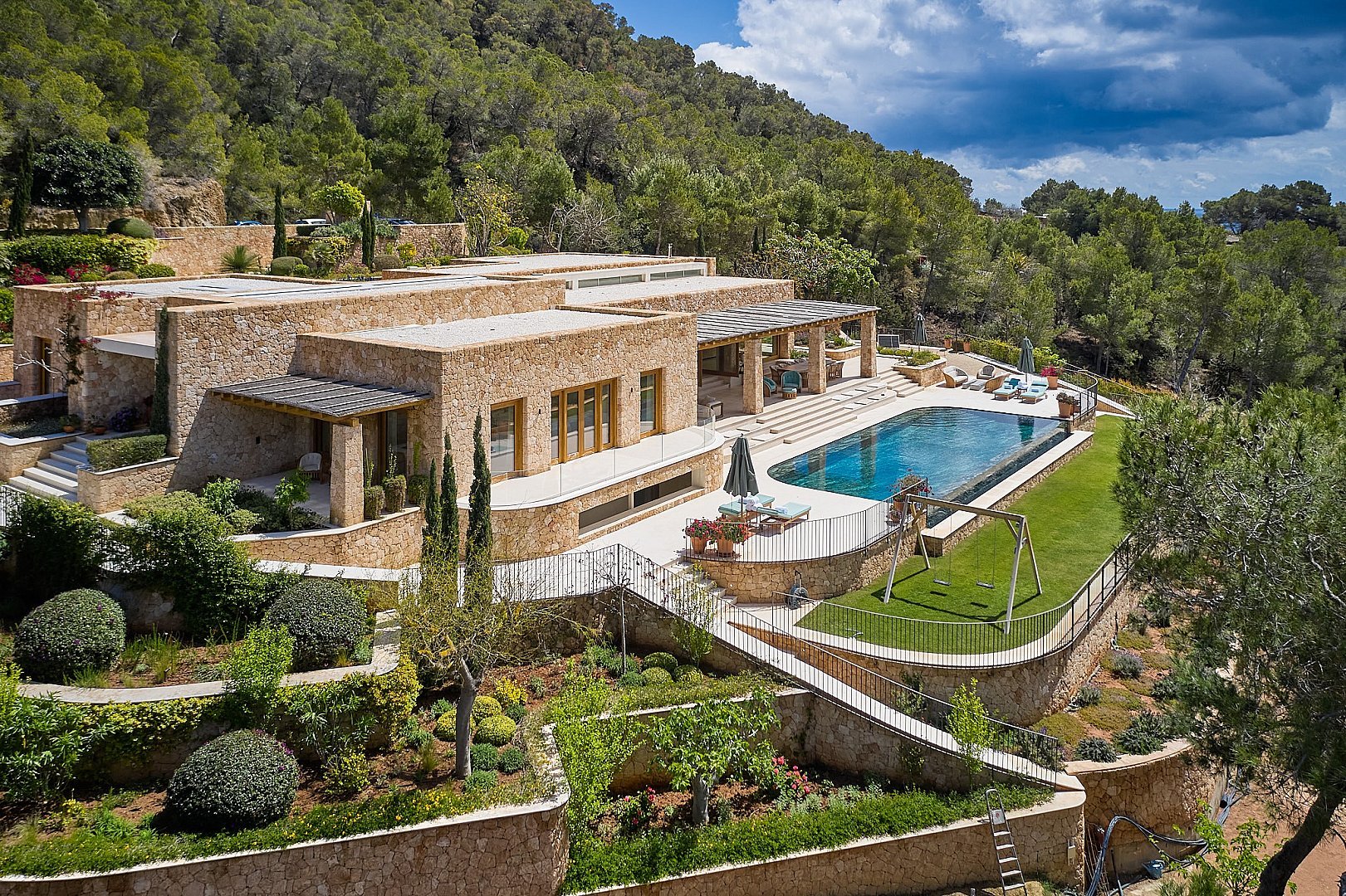 A pocos pasos de Cala Mastella y cerca del tradicional pueblo de San Carlos, esta casa está situada en una gran parcela de terreno con vistas lejanas al mar. La propiedad está en perfecta armonía con el paisaje circundante. La forma en que la casa ha sido construida, utilizando el diseño y la arquitectura tradicional con una sutil mezcla de elementos contemporáneos, es única. A través de la enorme puerta se entra en el luminoso nivel principal de la casa, con sus techos altos y curvados que hacen referencia a los métodos de construcción tradicionales y también ofrece claraboyas ocultas para traer el sol mediterráneo directamente a la casa. Aquí se encuentra el enorme salón en dos niveles, una cocina abierta y a medida construida con materiales de la más alta calidad, que ofrece una elegante mezcla de travertino romano, roble natural y bronce de cañón. Grandes puertas automáticas de cristal conducen a la terraza, que ofrece un amplio espacio para una zona chill-out, así como una zona de comedor al aire libre. Los escalones que conducen de la terraza a la piscina están bien pensados para ofrecer otra opción para sentarse o tumbarse y disfrutar del sol de Ibiza, junto a la llamativa piscina climatizada de mármol Lapponia Verde. Un completo sistema de sonido proporciona la experiencia musical perfecta dentro y fuera de la casa. Hay seis dormitorios en total, todos ellos construidos con materiales de primera calidad. Dos de ellos son master suites con vestidores y cada uno con su propia terraza privada. La propiedad dispone de aire acondicionado y calefacción por suelo radiante. Hay un garaje enorme, que ofrece espacio para varios coches, un sistema de seguridad completo y un control de cámaras de 360 grados. Con la finalización de la casa en 2023, han creado una obra maestra arquitectónica donde la esencia de la isla se puede sentir en las fachadas.