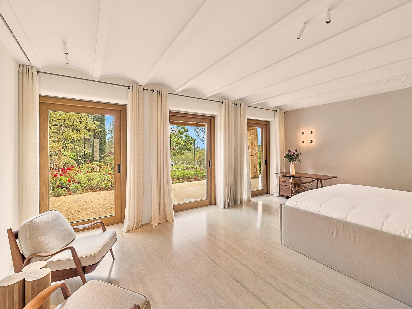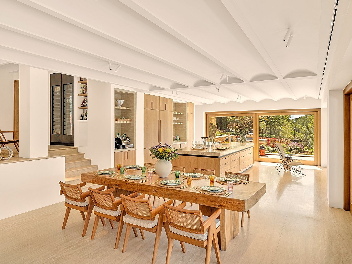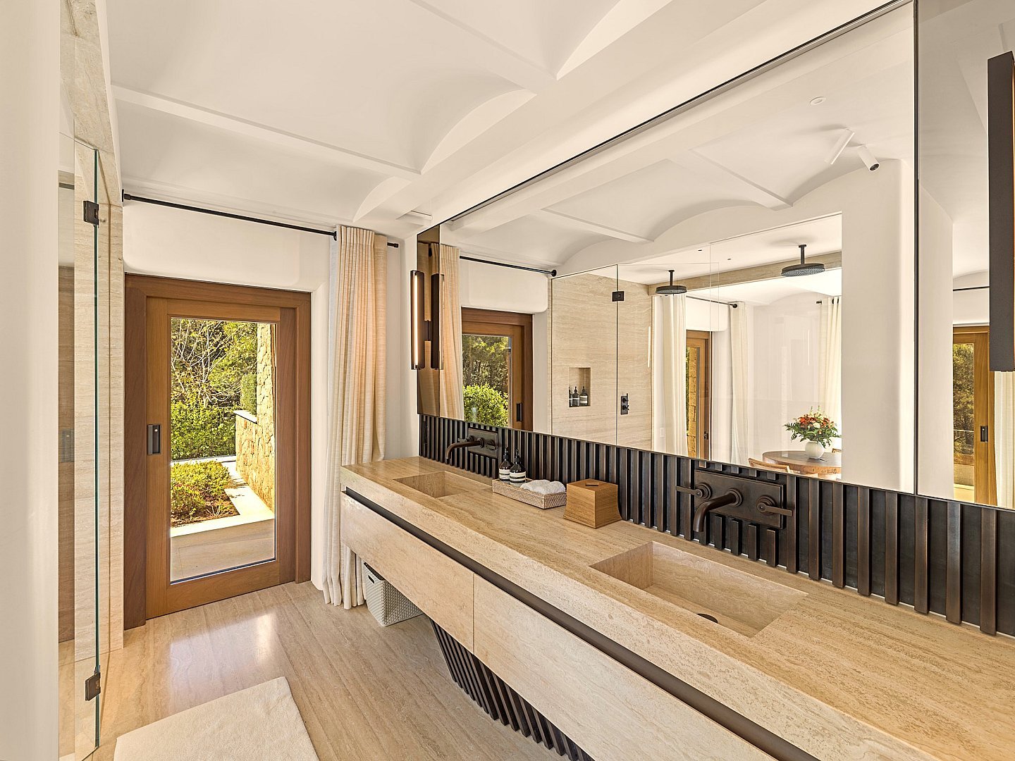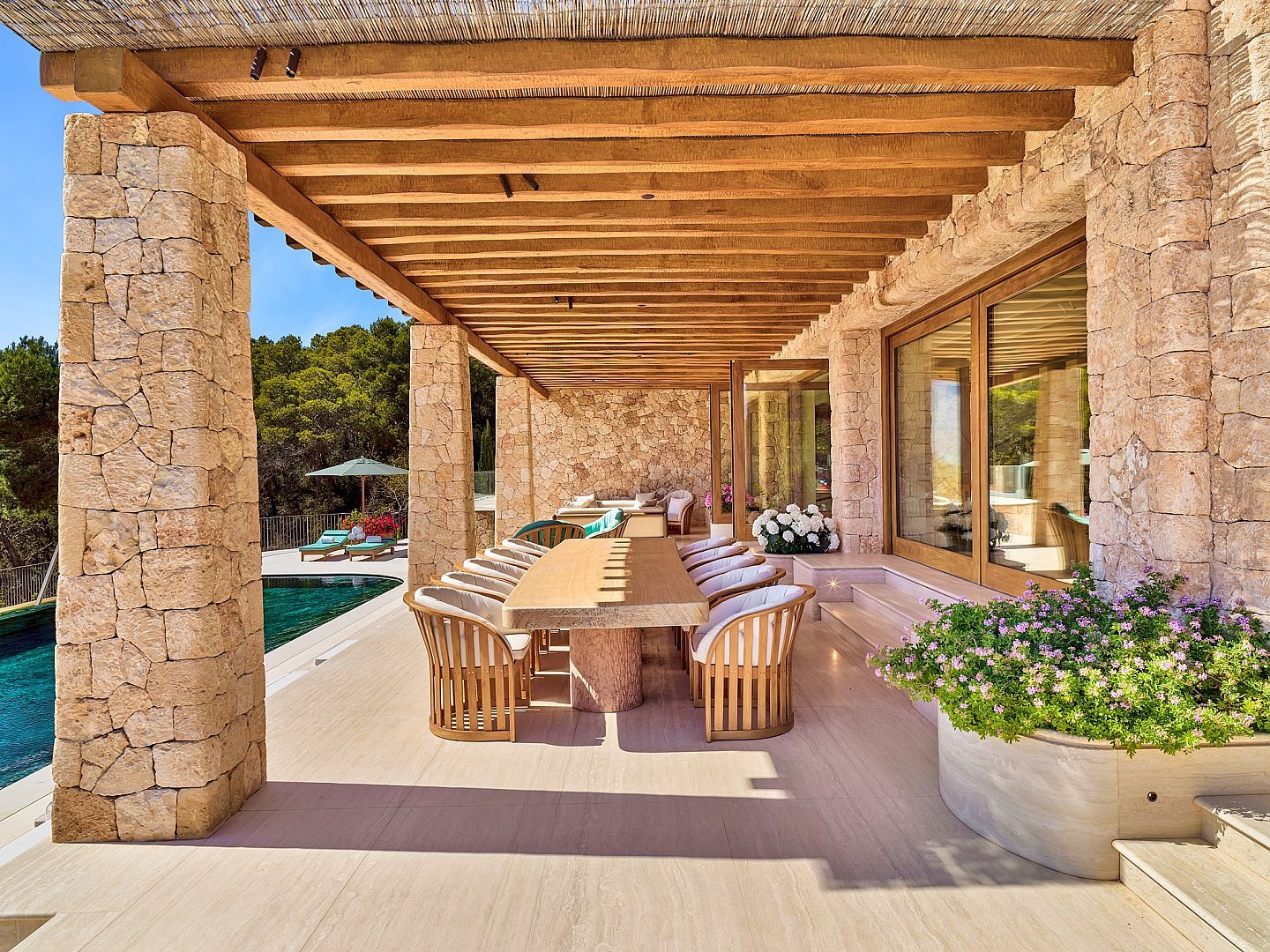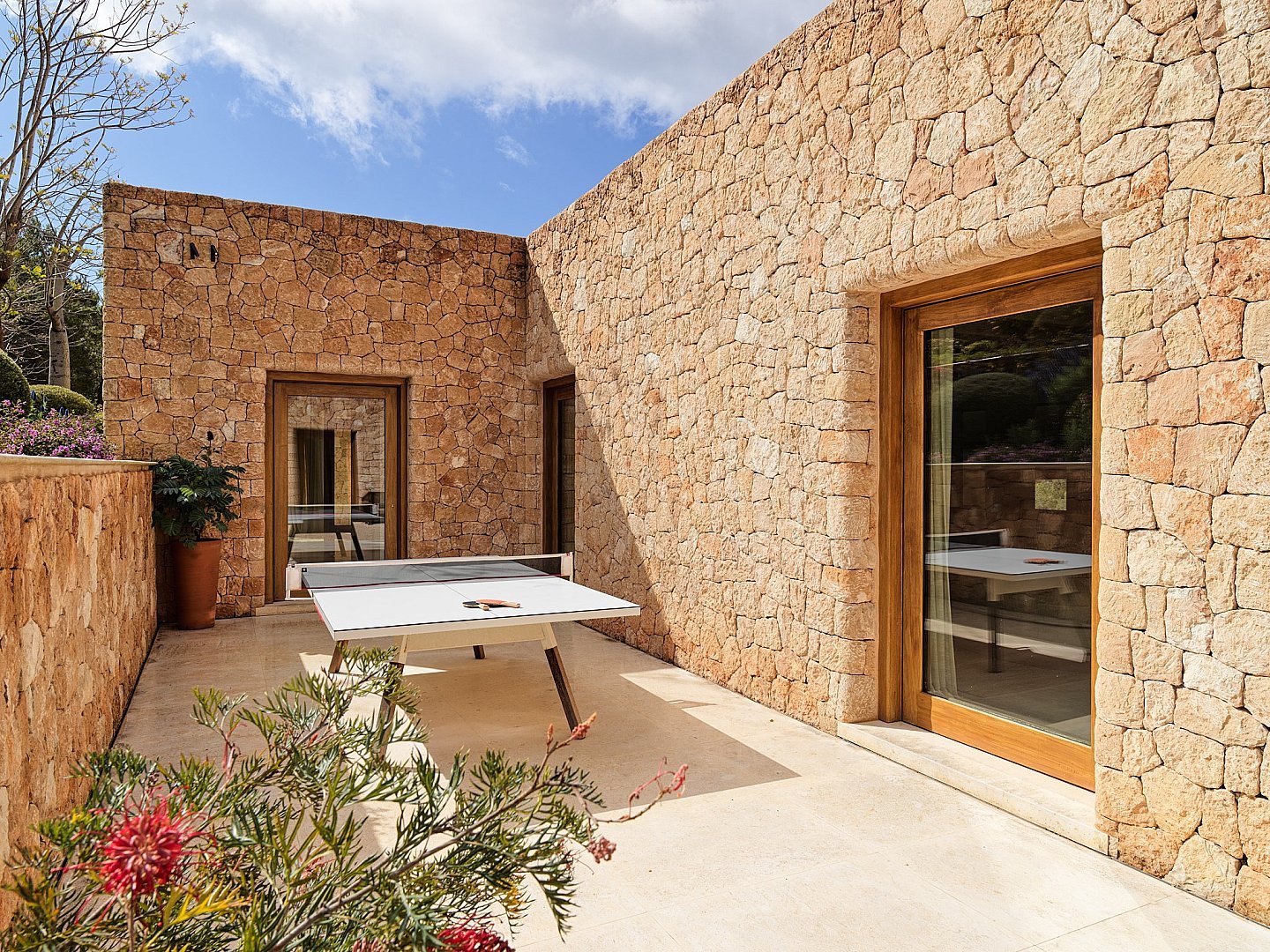 A pocos pasos de Cala Mastella y cerca del tradicional pueblo de San Carlos, esta casa está situada en una gran parcela de terreno con vistas lejanas al mar. La propiedad está en perfecta armonía con el paisaje circundante. La forma en que la casa ha sido construida, utilizando el diseño y la arquitectura tradicional con una sutil mezcla de elementos contemporáneos, es única. A través de la enorme puerta se entra en el luminoso nivel principal de la casa, con sus techos altos y curvados que hacen referencia a los métodos de construcción tradicionales y también ofrece claraboyas ocultas para traer el sol mediterráneo directamente a la casa. Aquí se encuentra el enorme salón en dos niveles, una cocina abierta y a medida construida con materiales de la más alta calidad, que ofrece una elegante mezcla de travertino romano, roble natural y bronce de cañón. Grandes puertas automáticas de cristal conducen a la terraza, que ofrece un amplio espacio para una zona chill-out, así como una zona de comedor al aire libre. Los escalones que conducen de la terraza a la piscina están bien pensados para ofrecer otra opción para sentarse o tumbarse y disfrutar del sol de Ibiza, junto a la llamativa piscina climatizada de mármol Lapponia Verde. Un completo sistema de sonido proporciona la experiencia musical perfecta dentro y fuera de la casa. Hay seis dormitorios en total, todos ellos construidos con materiales de primera calidad. Dos de ellos son master suites con vestidores y cada uno con su propia terraza privada. La propiedad dispone de aire acondicionado y calefacción por suelo radiante. Hay un garaje enorme, que ofrece espacio para varios coches, un sistema de seguridad completo y un control de cámaras de 360 grados. Con la finalización de la casa en 2023, han creado una obra maestra arquitectónica donde la esencia de la isla se puede sentir en las fachadas.