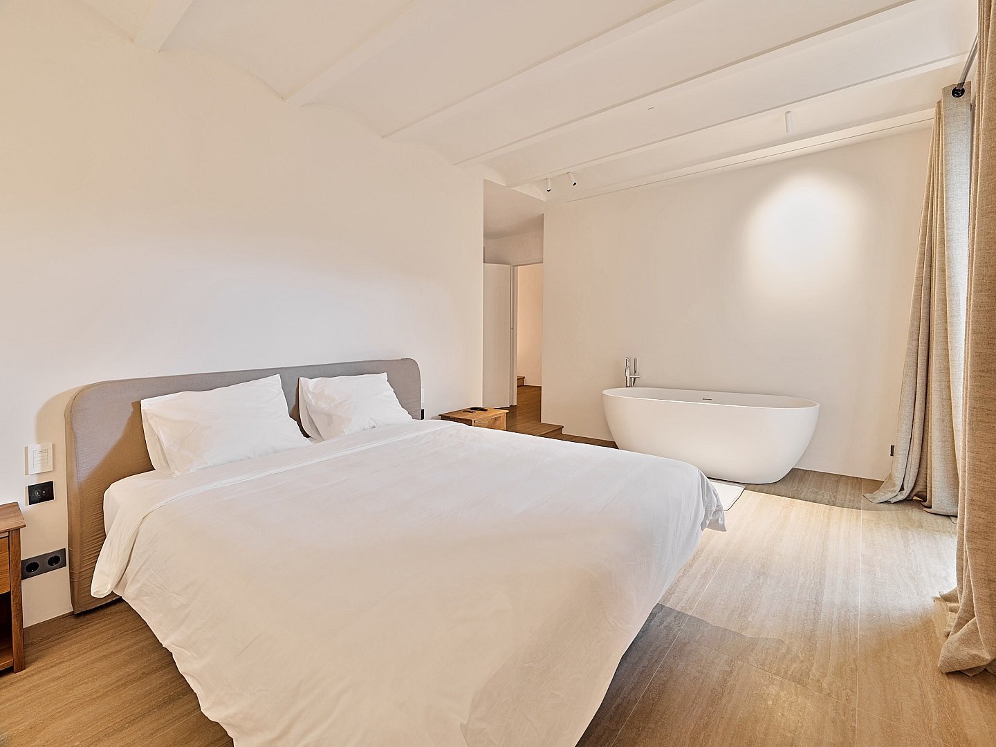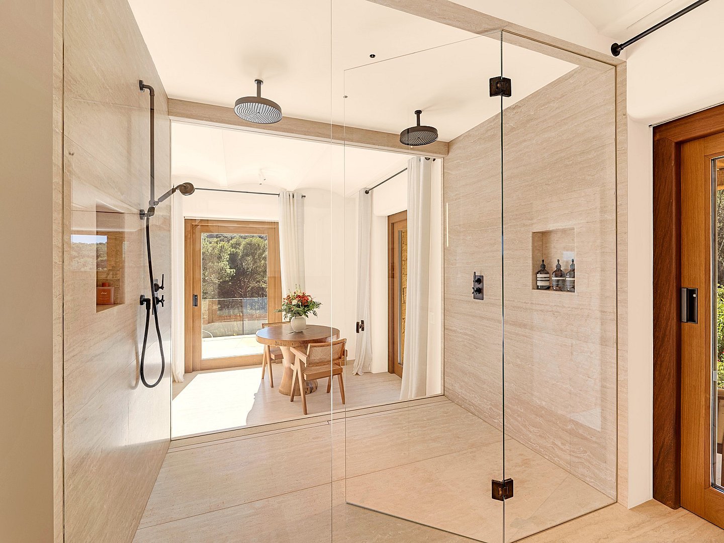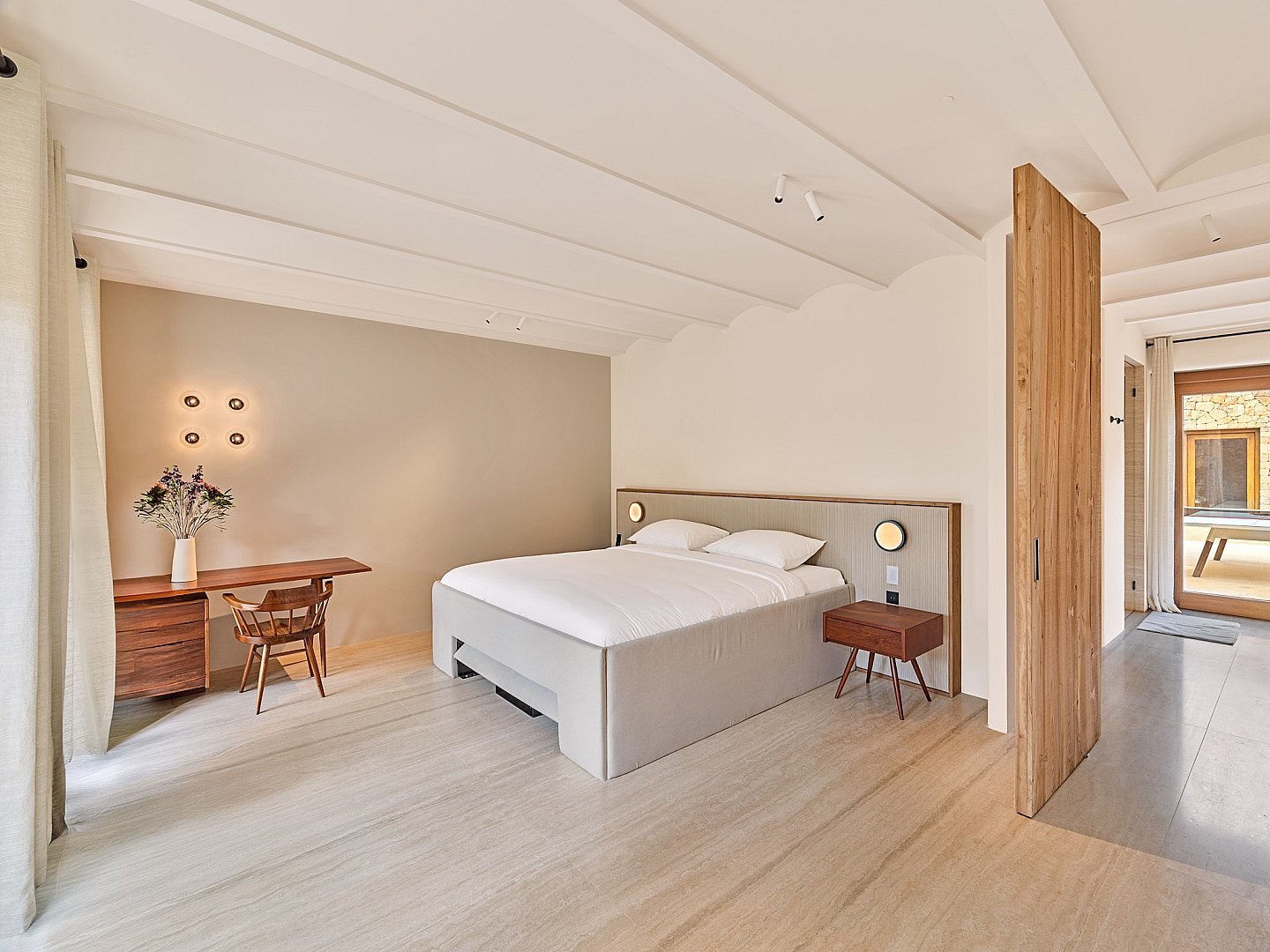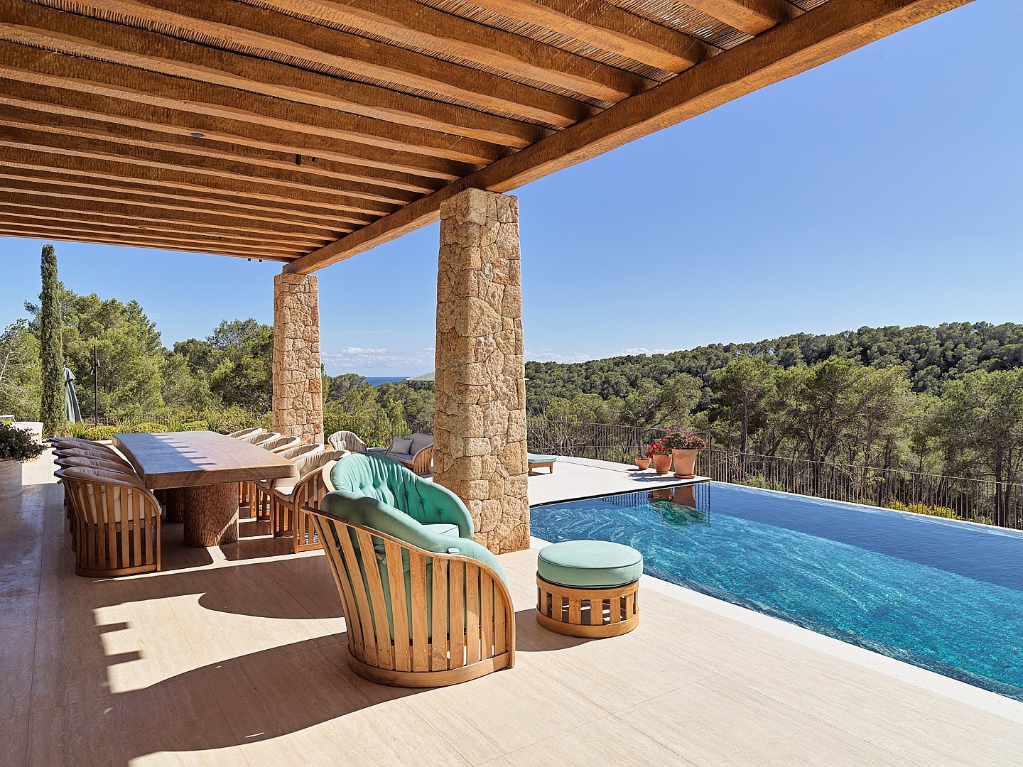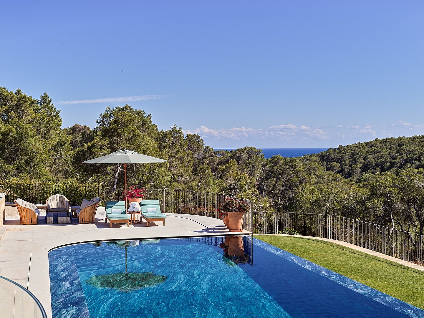 A pocos pasos de Cala Mastella y cerca del tradicional pueblo de San Carlos, esta casa está situada en una gran parcela de terreno con vistas lejanas al mar. La propiedad está en perfecta armonía con el paisaje circundante. La forma en que la casa ha sido construida, utilizando el diseño y la arquitectura tradicional con una sutil mezcla de elementos contemporáneos, es única. A través de la enorme puerta se entra en el luminoso nivel principal de la casa, con sus techos altos y curvados que hacen referencia a los métodos de construcción tradicionales y también ofrece claraboyas ocultas para traer el sol mediterráneo directamente a la casa. Aquí se encuentra el enorme salón en dos niveles, una cocina abierta y a medida construida con materiales de la más alta calidad, que ofrece una elegante mezcla de travertino romano, roble natural y bronce de cañón. Grandes puertas automáticas de cristal conducen a la terraza, que ofrece un amplio espacio para una zona chill-out, así como una zona de comedor al aire libre. Los escalones que conducen de la terraza a la piscina están bien pensados para ofrecer otra opción para sentarse o tumbarse y disfrutar del sol de Ibiza, junto a la llamativa piscina climatizada de mármol Lapponia Verde. Un completo sistema de sonido proporciona la experiencia musical perfecta dentro y fuera de la casa. Hay seis dormitorios en total, todos ellos construidos con materiales de primera calidad. Dos de ellos son master suites con vestidores y cada uno con su propia terraza privada. La propiedad dispone de aire acondicionado y calefacción por suelo radiante. Hay un garaje enorme, que ofrece espacio para varios coches, un sistema de seguridad completo y un control de cámaras de 360 grados. Con la finalización de la casa en 2023, han creado una obra maestra arquitectónica donde la esencia de la isla se puede sentir en las fachadas.