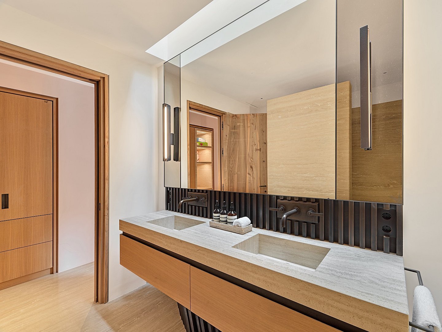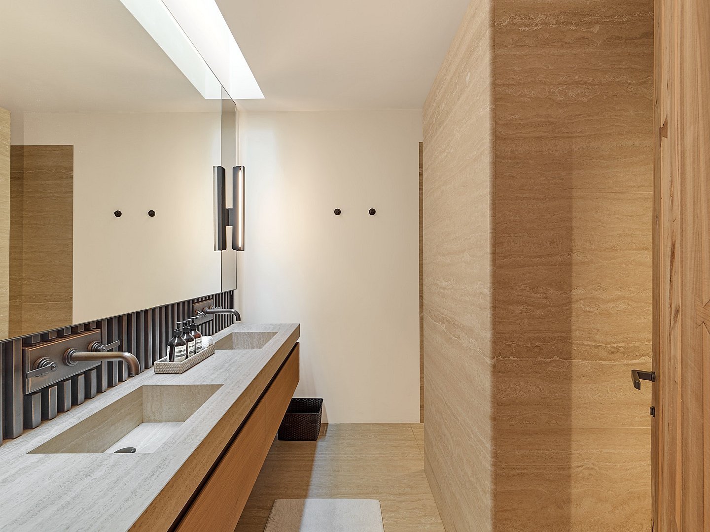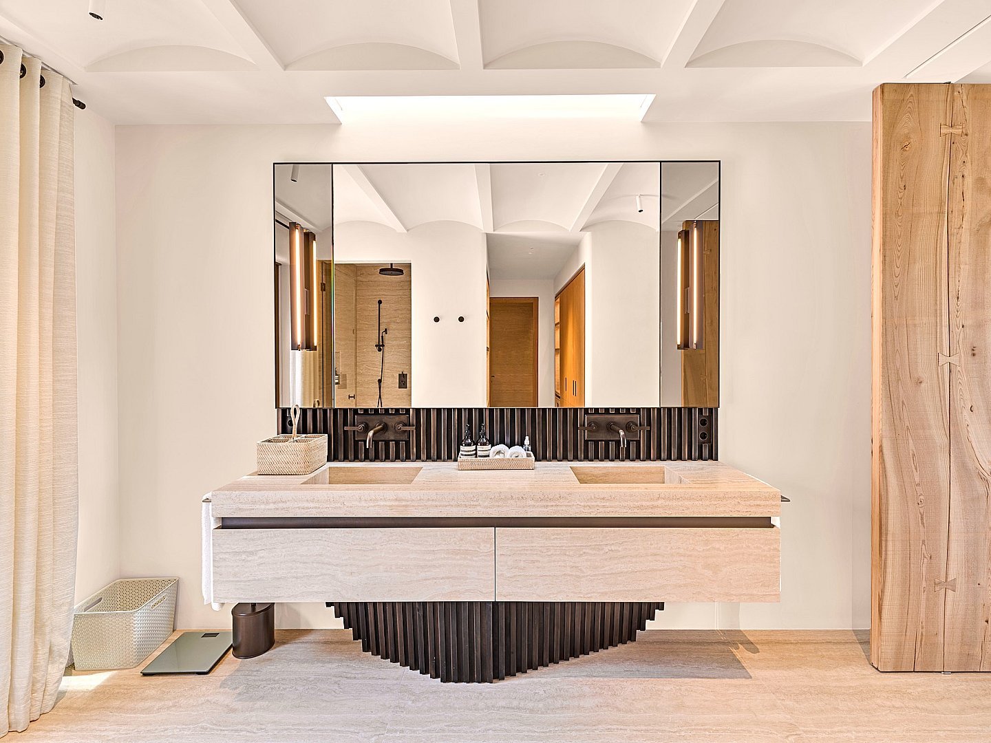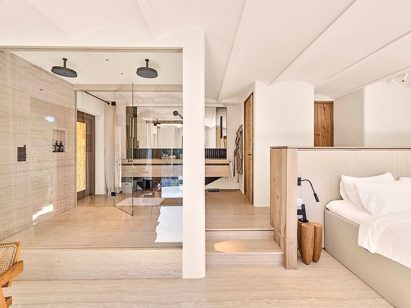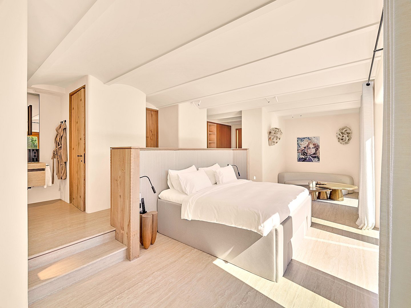 A pocos pasos de Cala Mastella y cerca del tradicional pueblo de San Carlos, esta casa está situada en una gran parcela de terreno con vistas lejanas al mar. La propiedad está en perfecta armonía con el paisaje circundante. La forma en que la casa ha sido construida, utilizando el diseño y la arquitectura tradicional con una sutil mezcla de elementos contemporáneos, es única. A través de la enorme puerta se entra en el luminoso nivel principal de la casa, con sus techos altos y curvados que hacen referencia a los métodos de construcción tradicionales y también ofrece claraboyas ocultas para traer el sol mediterráneo directamente a la casa. Aquí se encuentra el enorme salón en dos niveles, una cocina abierta y a medida construida con materiales de la más alta calidad, que ofrece una elegante mezcla de travertino romano, roble natural y bronce de cañón. Grandes puertas automáticas de cristal conducen a la terraza, que ofrece un amplio espacio para una zona chill-out, así como una zona de comedor al aire libre. Los escalones que conducen de la terraza a la piscina están bien pensados para ofrecer otra opción para sentarse o tumbarse y disfrutar del sol de Ibiza, junto a la llamativa piscina climatizada de mármol Lapponia Verde. Un completo sistema de sonido proporciona la experiencia musical perfecta dentro y fuera de la casa. Hay seis dormitorios en total, todos ellos construidos con materiales de primera calidad. Dos de ellos son master suites con vestidores y cada uno con su propia terraza privada. La propiedad dispone de aire acondicionado y calefacción por suelo radiante. Hay un garaje enorme, que ofrece espacio para varios coches, un sistema de seguridad completo y un control de cámaras de 360 grados. Con la finalización de la casa en 2023, han creado una obra maestra arquitectónica donde la esencia de la isla se puede sentir en las fachadas.