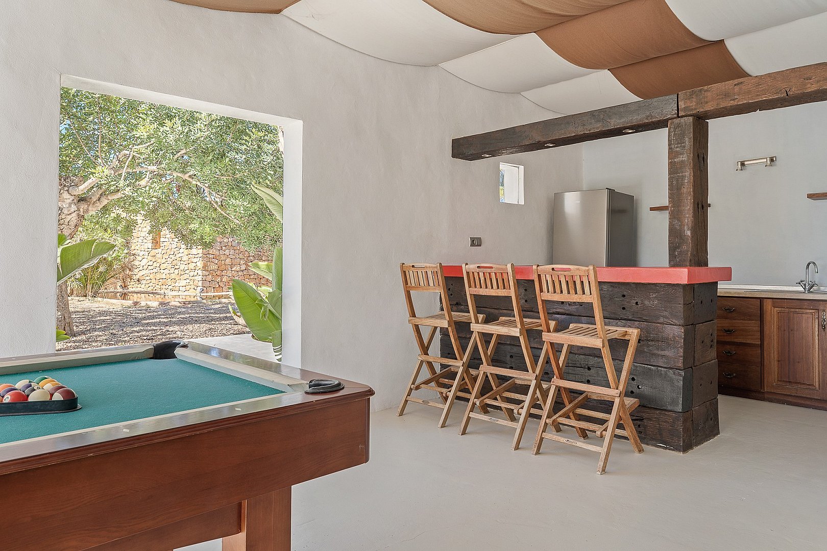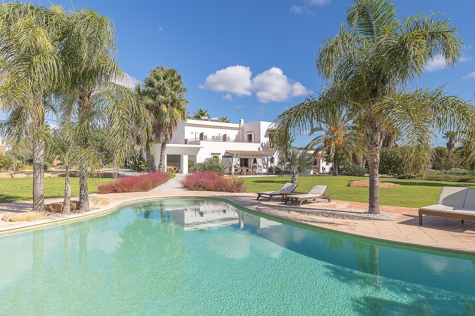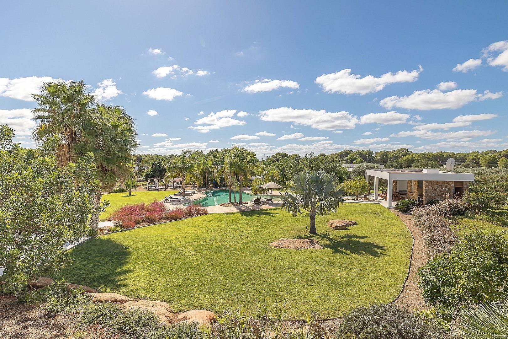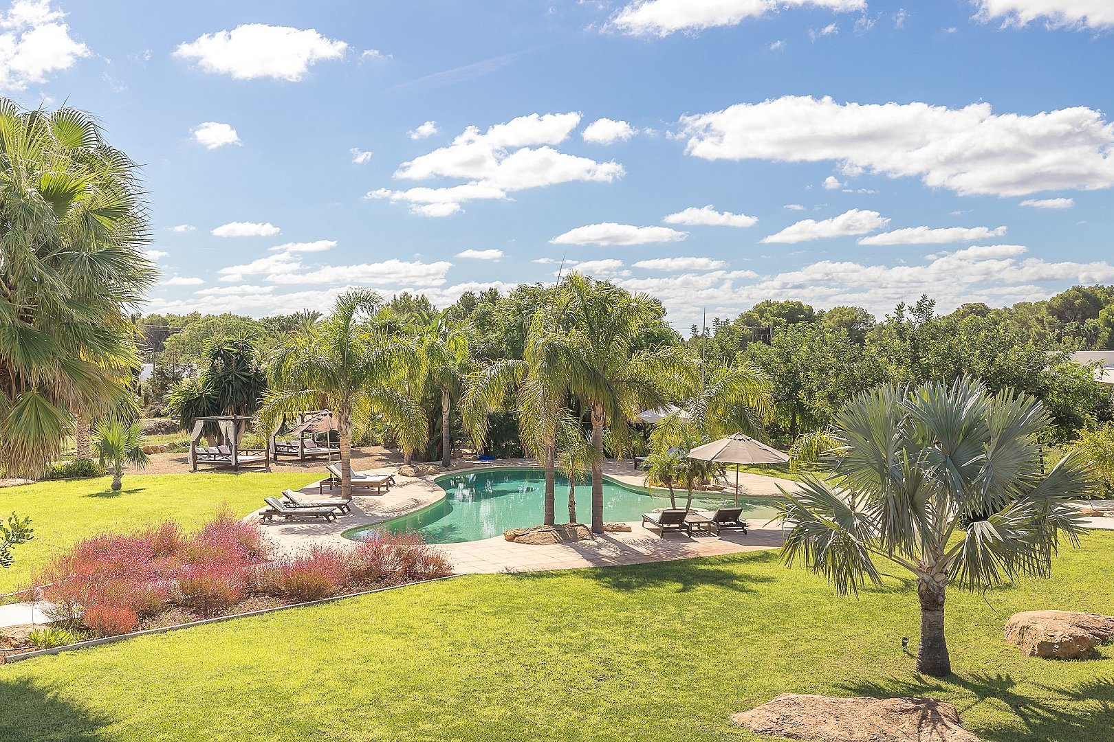 Esta preciosa villa ibicenca, está localizada a menos de diez minutos de los pueblos de Santa Eulalia y San Carlos. Y muy cerca de las playas de Es Canar y Cala Nova entre otras. Desde la terraza del jardín accedemos directamente al salón con chimenea y cocina abierta. También hay un segundo salón, con acceso independiente desde el exterior. En total hay seis habitaciones dobles, distribuidas en dos pisos. Y cinco baños. En la planta de arriba también se puede disfrutar de la gran terraza con vistas al jardín. El exterior armonizado con un lindo jardín mediterráneo, algunas palmeras, camas balinesas y una gran piscina playa es una gran invitación a disfrutar de los días soleados, pudiendo acoger a amigos, familia y celebraciones especiales. Este precioso lugar es elegido cada año por parejas internacionales para celebrar su boda en la bonita isla de Ibiza. Además, hay una zona de barbacoa y gimnasio al lado de la piscina. Y un espacio billar al lado de la casa. Todo listo y pensado para disfrutar en buena compañía. La villa tiene una licencia turística, que aporta ingresos recurrentes desde hace diez temporadas. Por último, y no menos importante, en el gran terreno también hay unos viveros que están alquilados sumando otro ingreso mensual. Es una oportunidad muy completa, tanto si buscas una inversión como si lo que deseas es encontrar tu nuevo hogar.